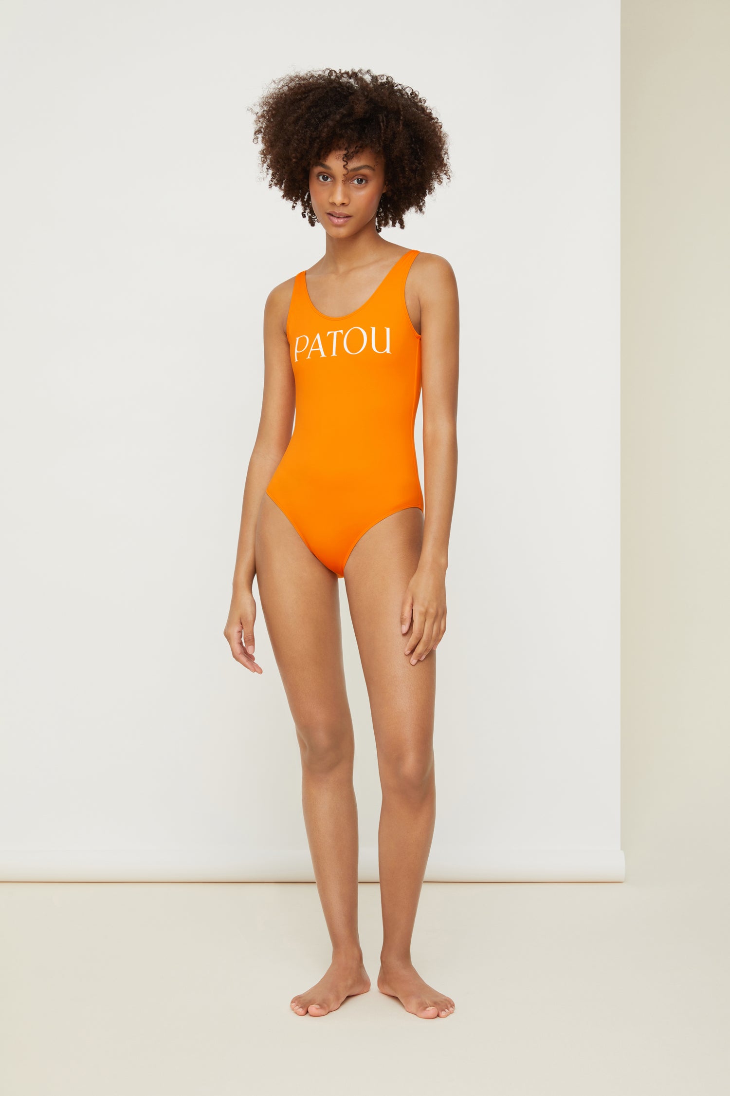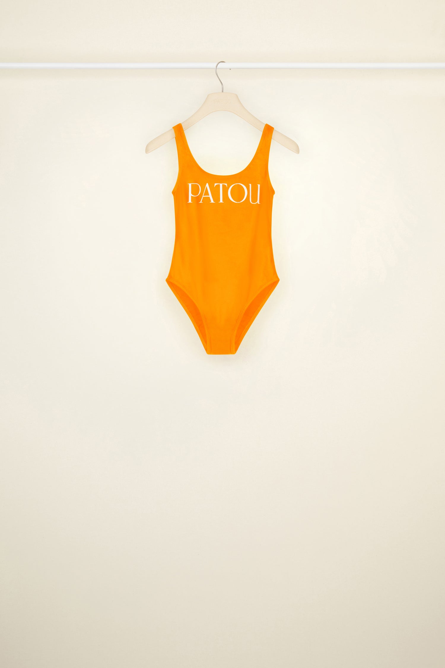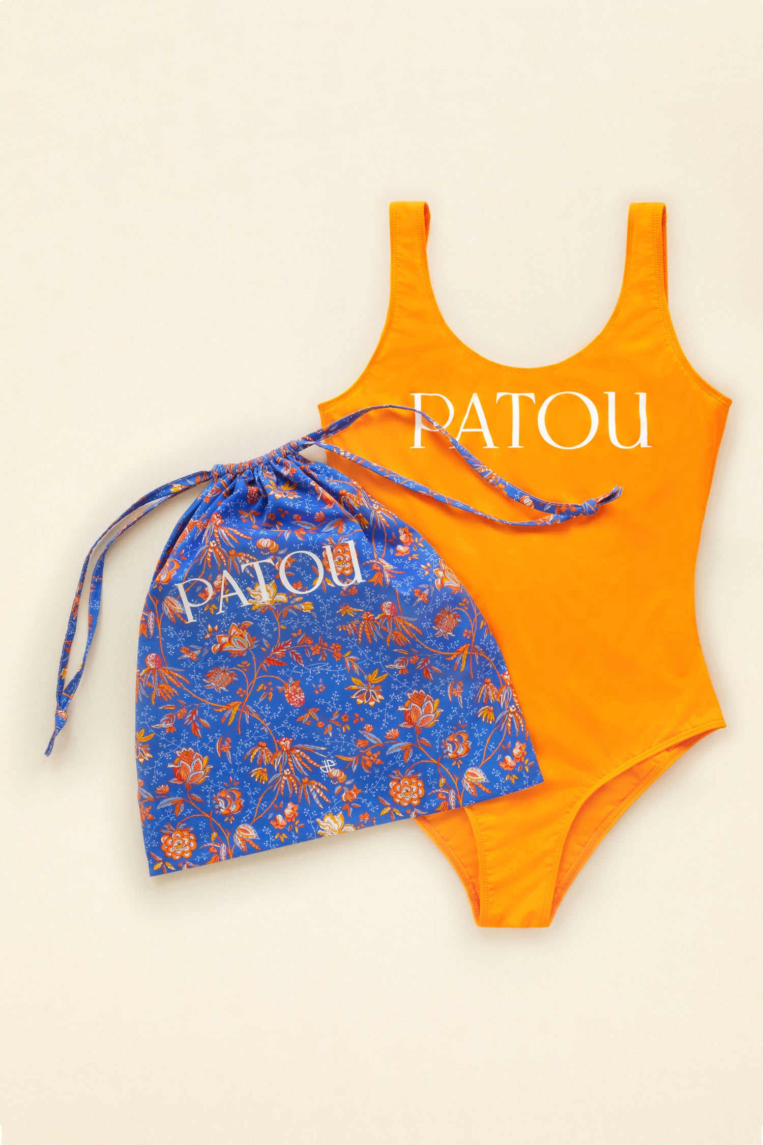 Citrus orange stretchy one-piece swimsuit. Scoop neck, low back. White lettering logo at the front. Comes in an organic cotton drawstring pouch featuring the floral Indienne print in a new summery palette and the PATOU logo.