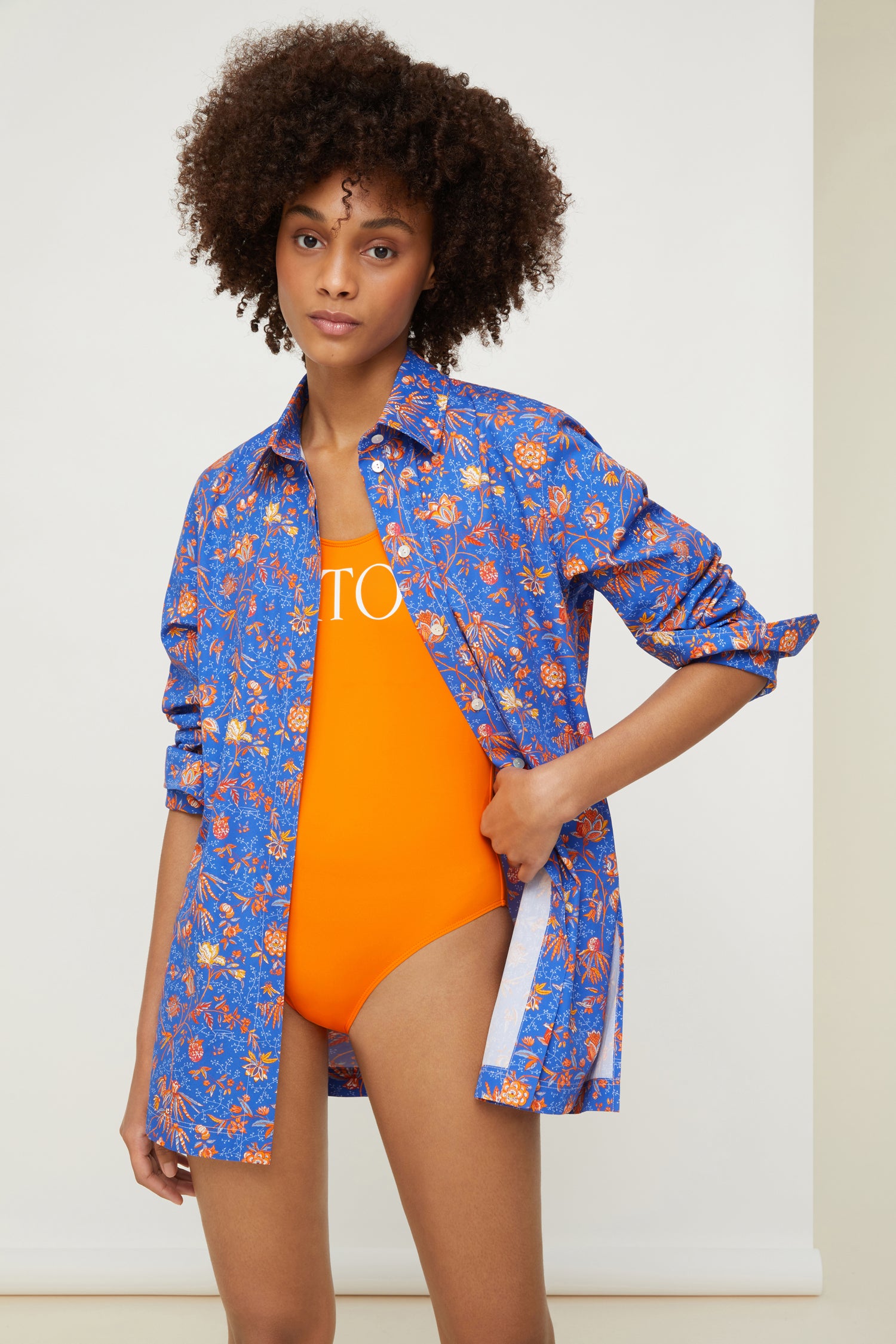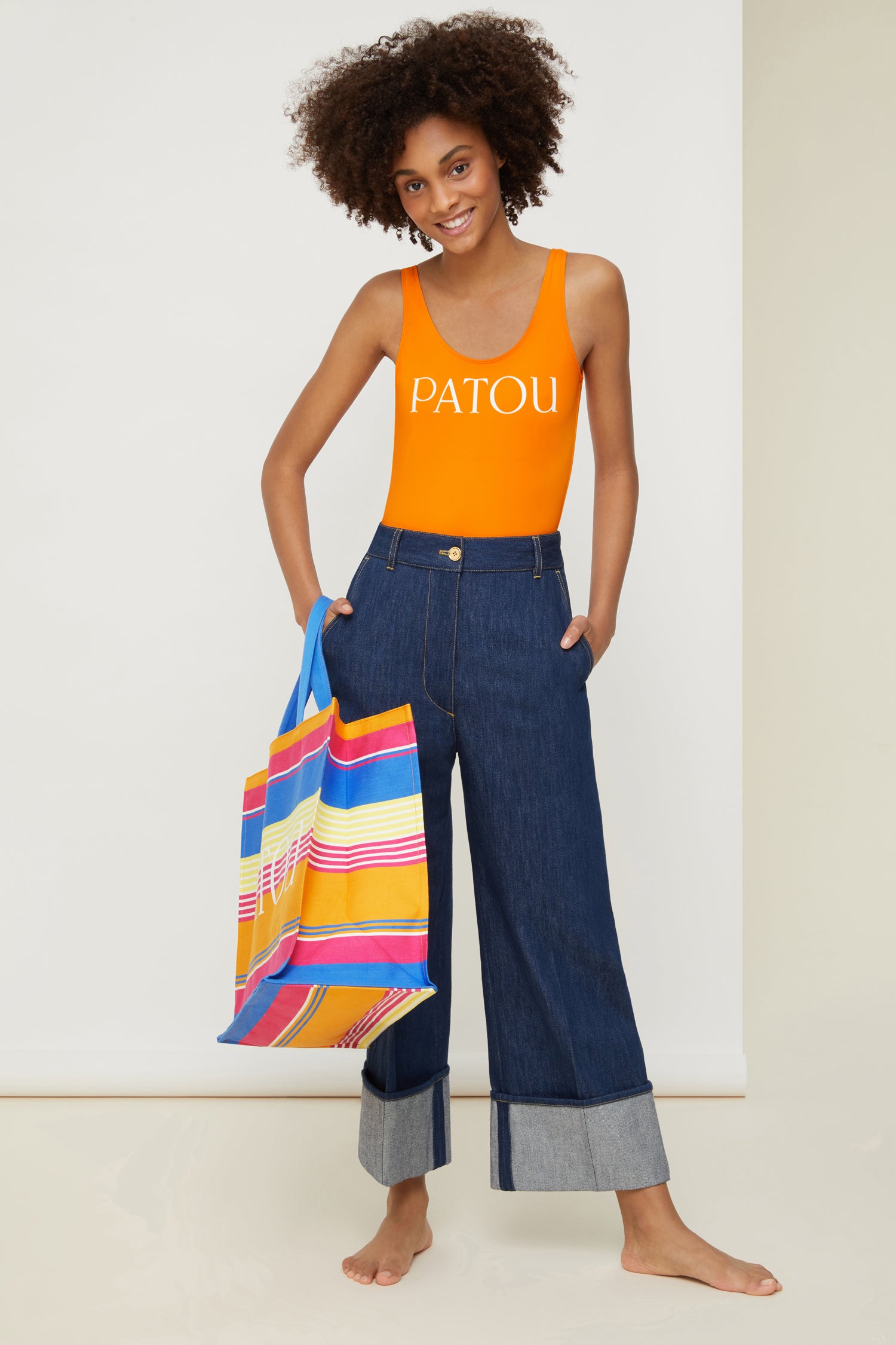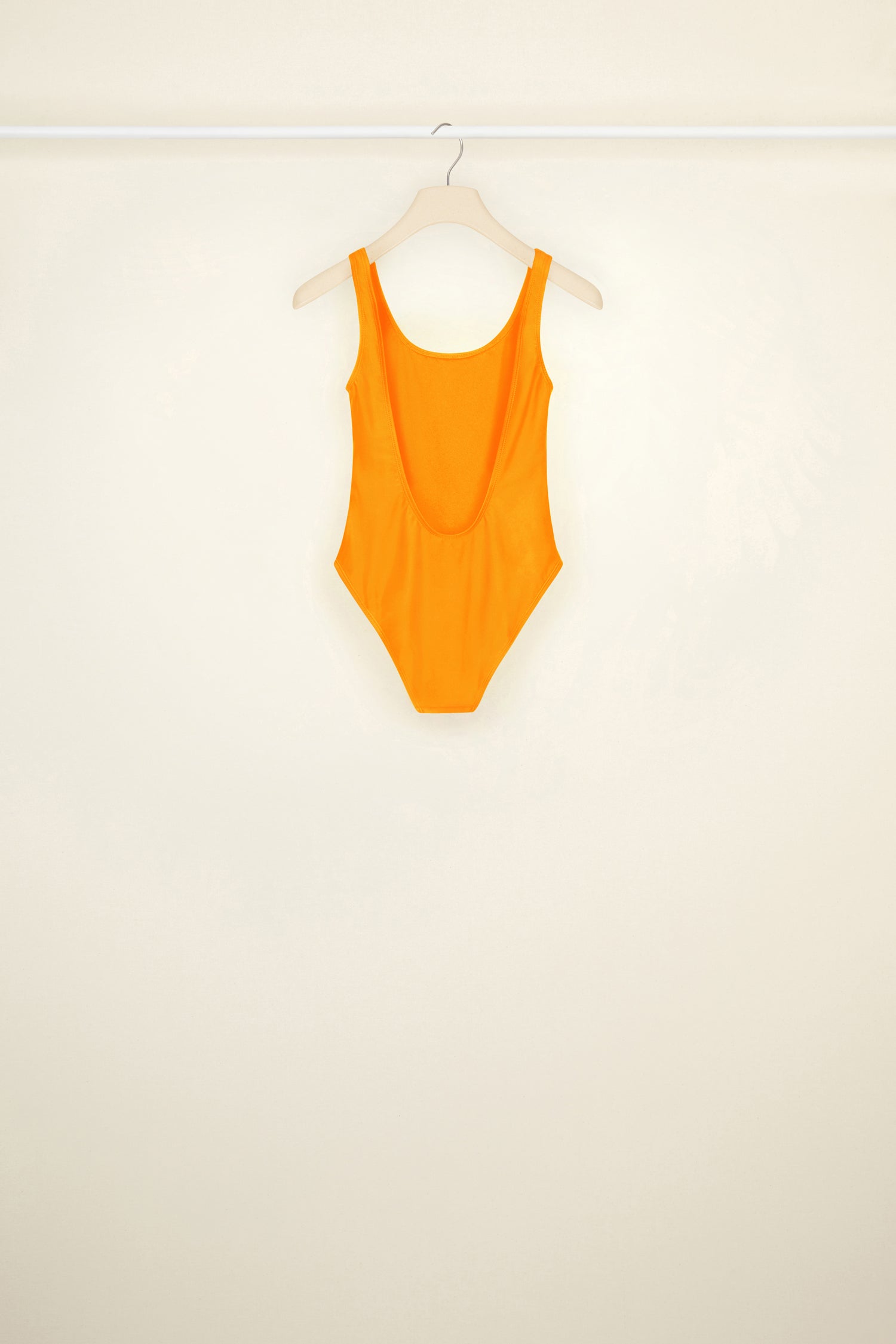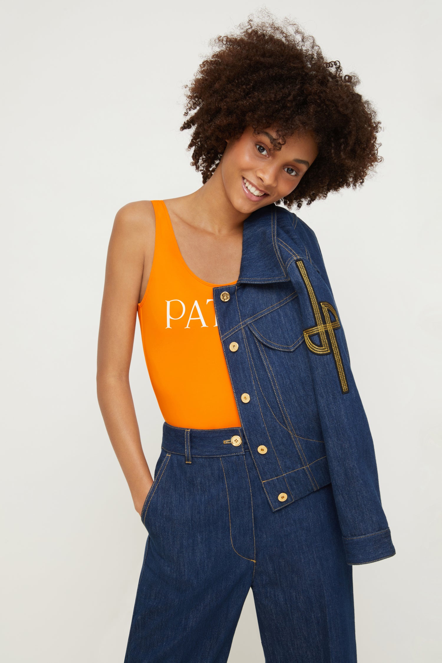 Citrus orange stretchy one-piece swimsuit. Scoop neck, low back. White lettering logo at the front. Comes in an organic cotton drawstring pouch featuring the floral Indienne print in a new summery palette and the PATOU logo.