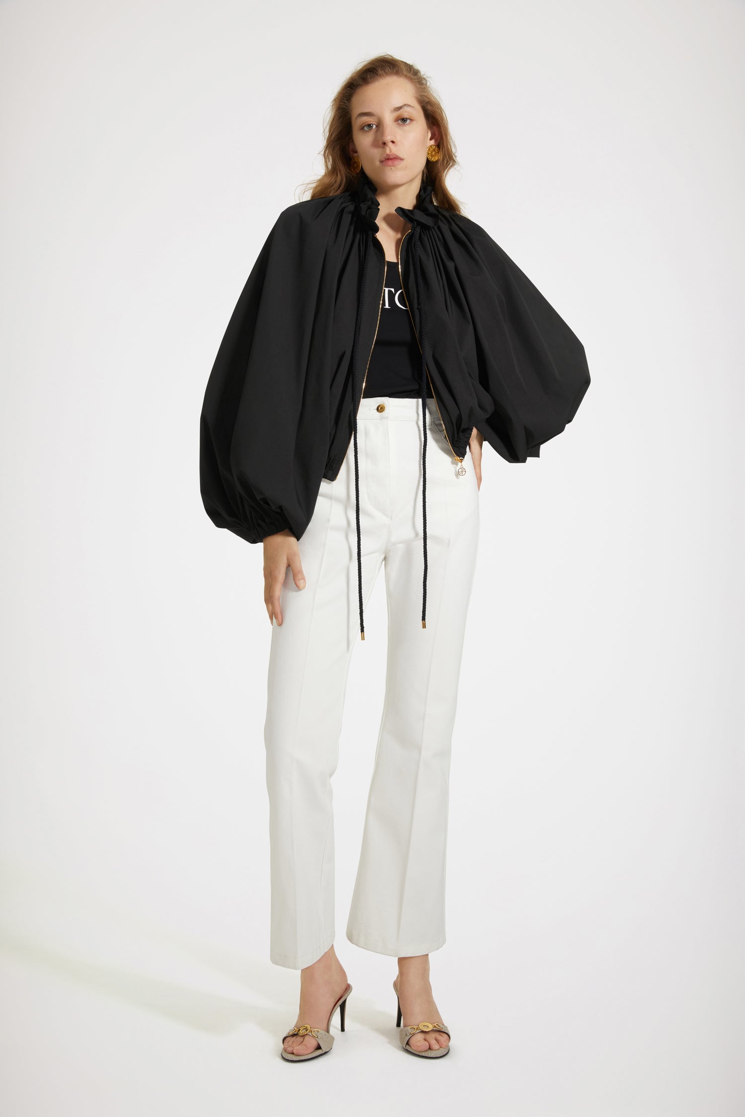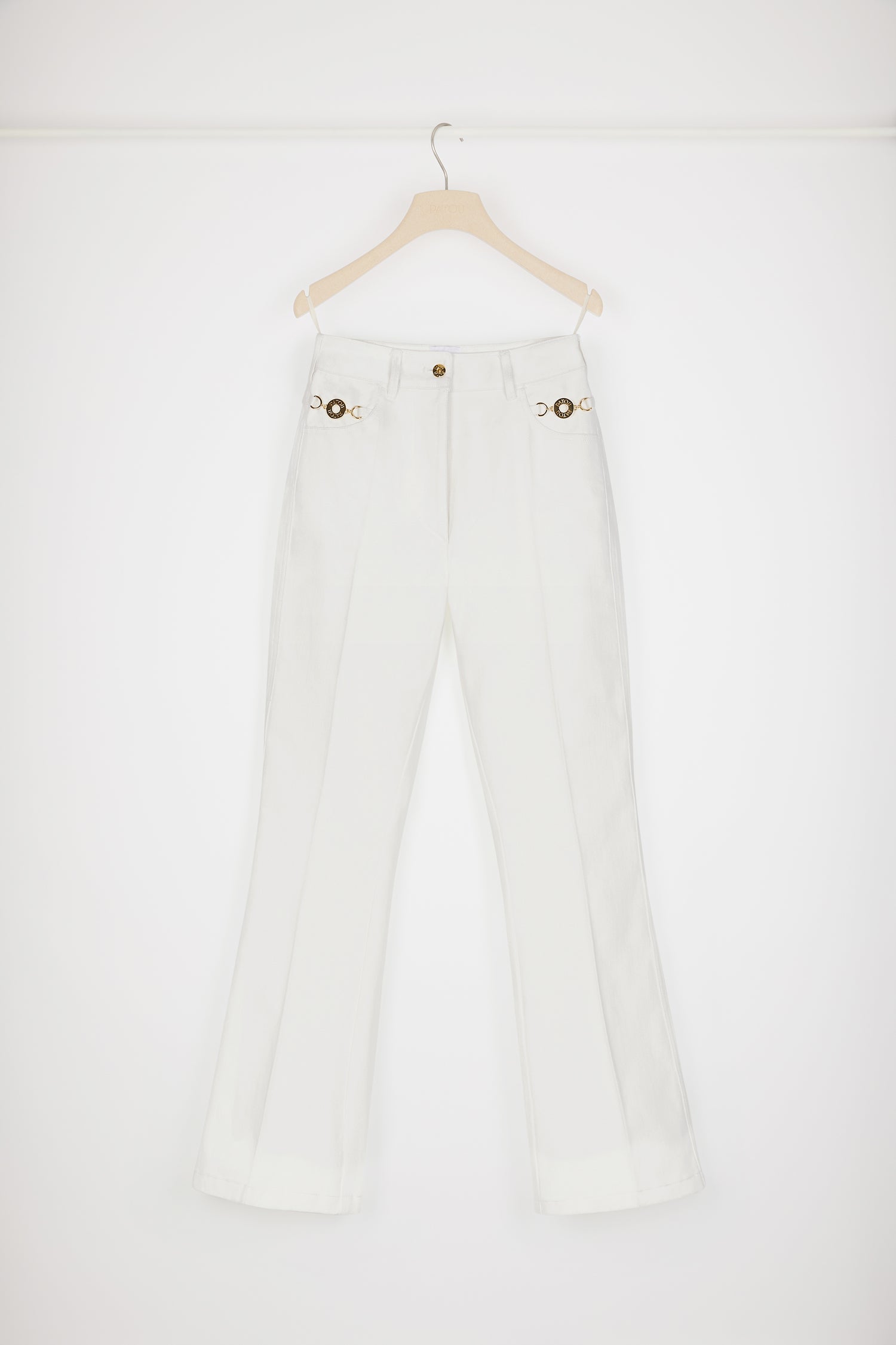 White organic cotton denim trousers. Flared leg. Mid rise. Gold-tone Patou-engraved button at the front. Belt loops. Embroidered Patou logo at the waistband. Darts and central creases at the front and back. Two pockets at the front with gold-tone Patou-engraved ornaments. Signature curved seam at the back.