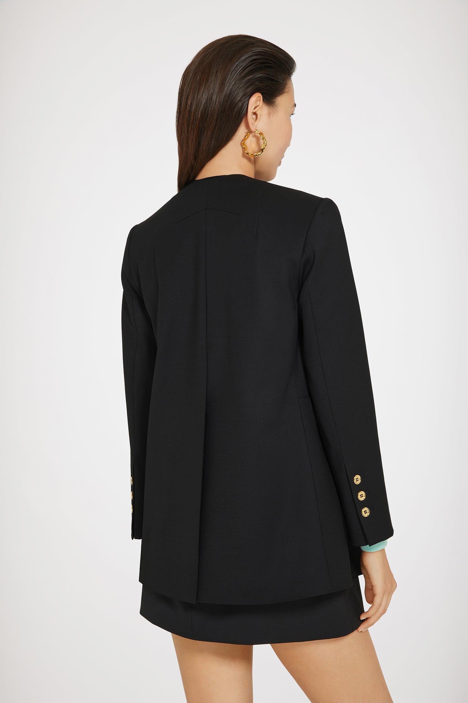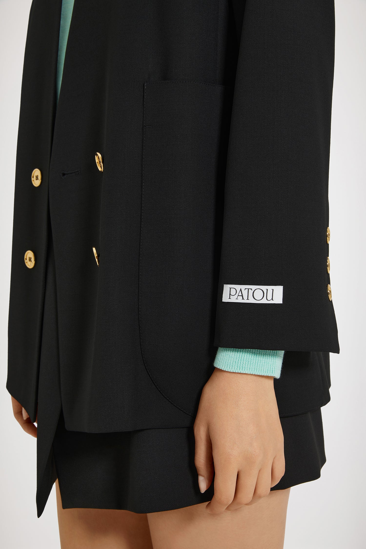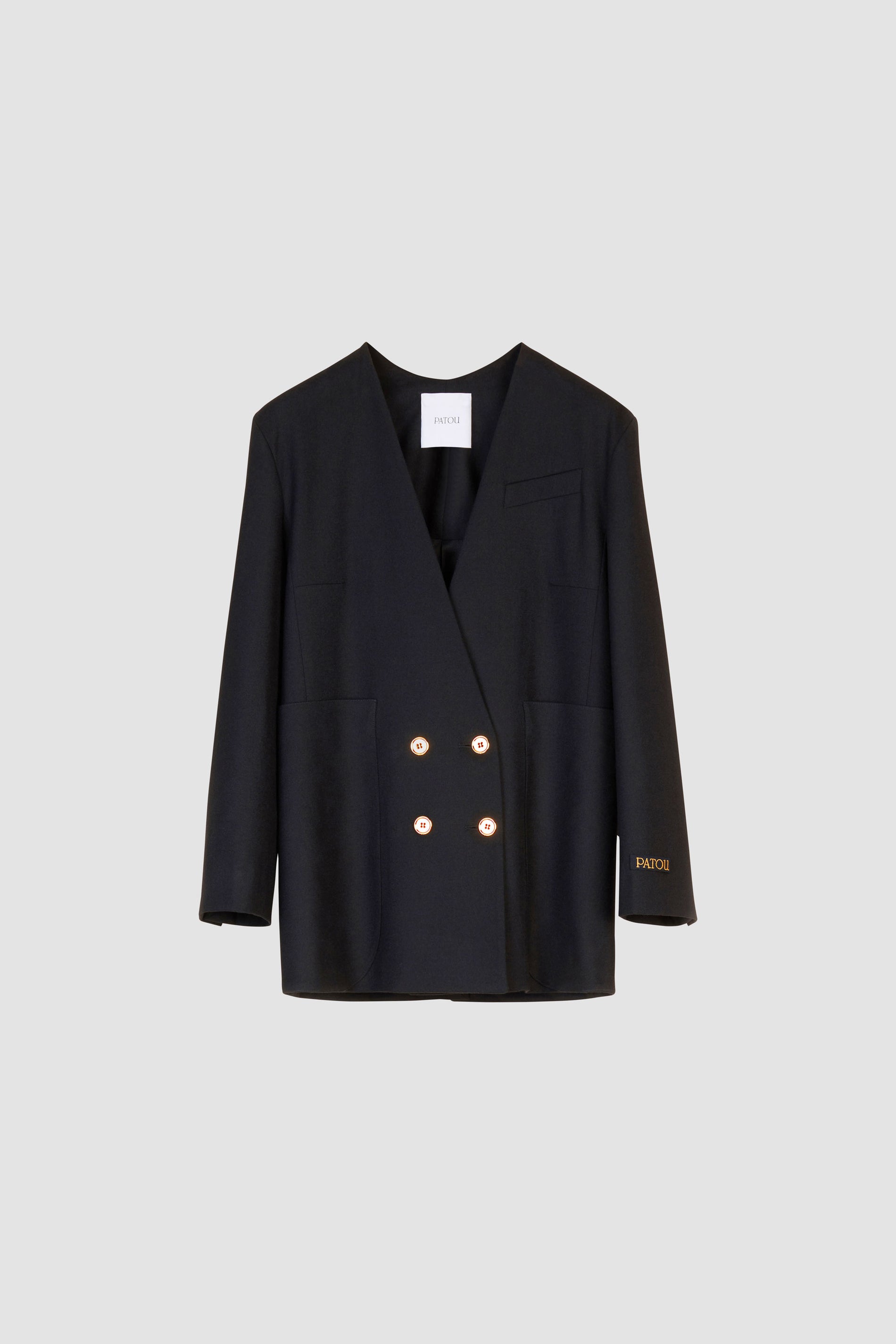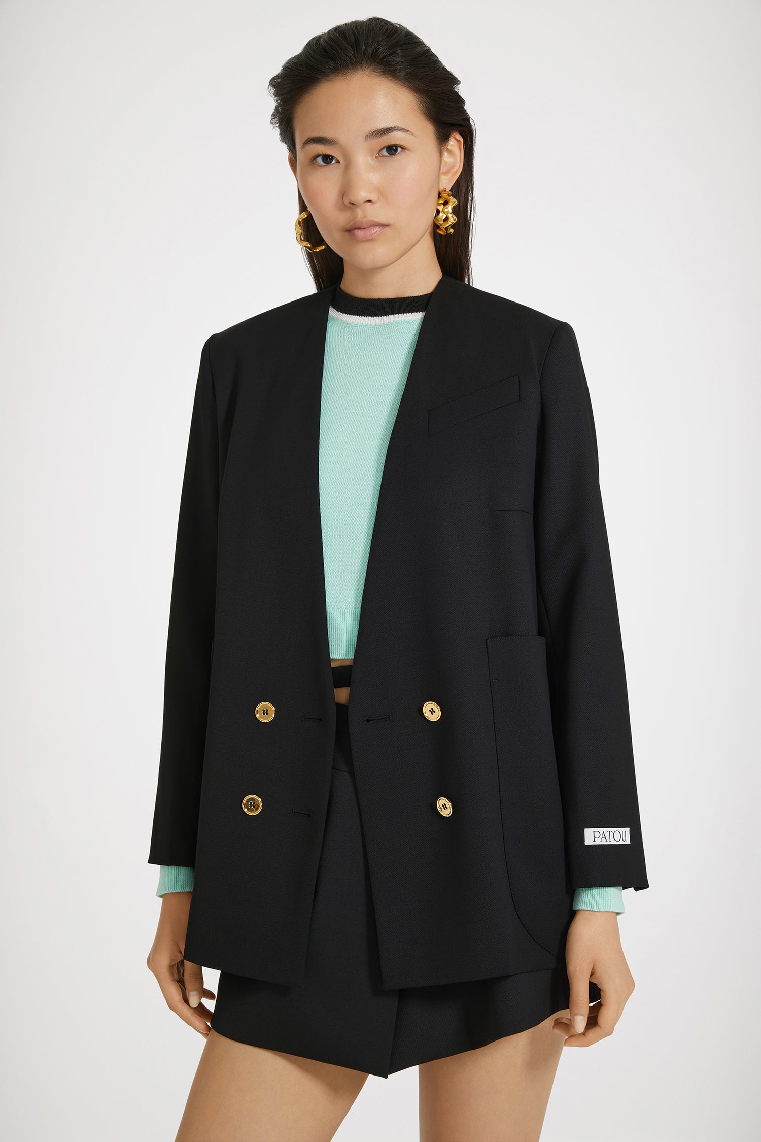Double-breasted collarless black virgin wool jacket. Gold buttons at the front and on the cuffs. Slit pocket at the chest, two oversized flap pockets. Tailor-style Patou label on the sleeve. Fully lined.
