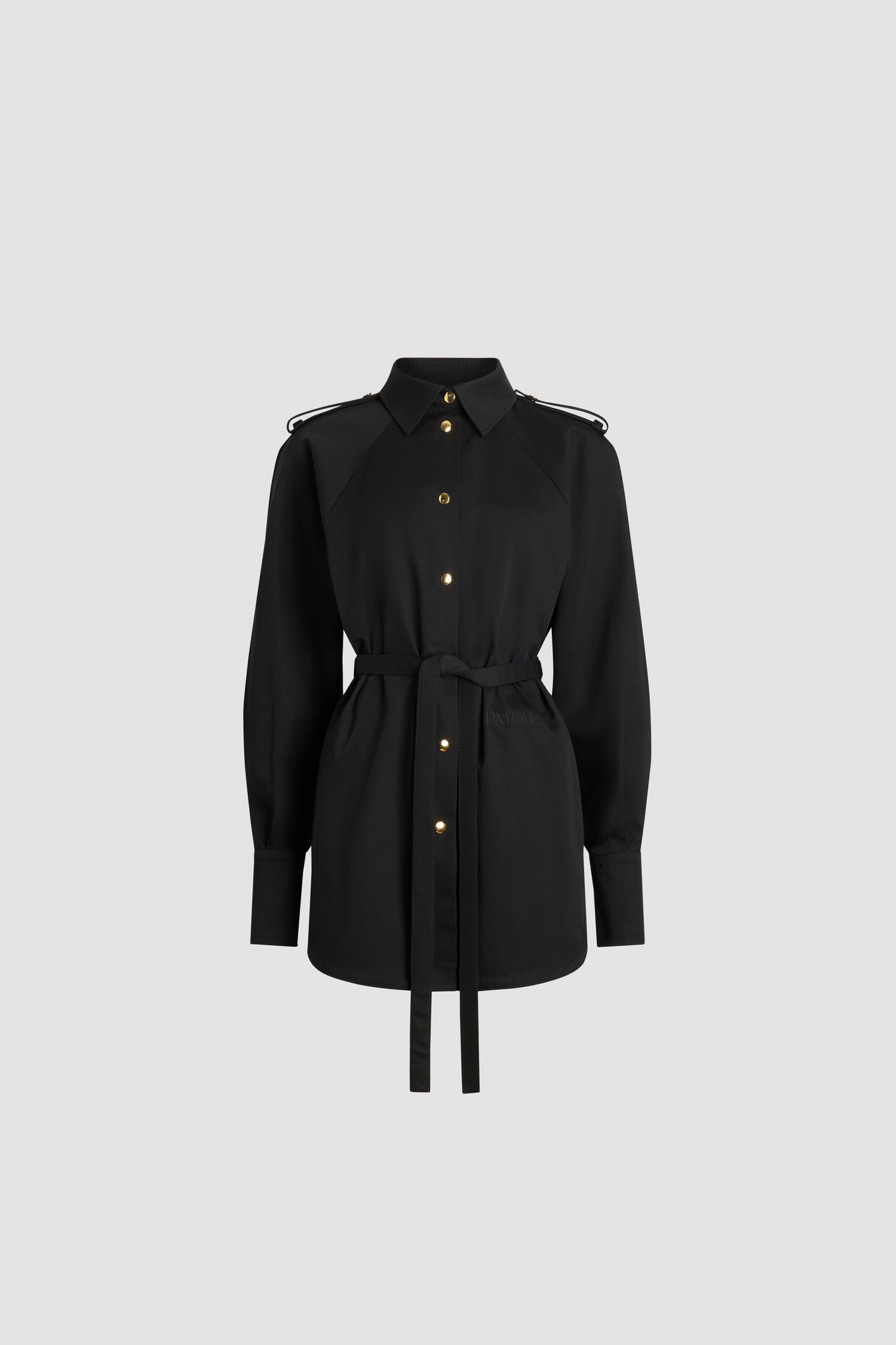 • Patou - Mini shirt dress in organic cotton gabardine - Black - Black organic cotton gabardine dress. Short length. Straight silhouette. Shirt collar. Gold-tone JP monogram-engraved buttons. Shoulder tabs. Volume raglan sleeves. Buttoned cuffs. Removable self-tie belt at the waist. Embroidered Patou logo and JP monogram at the front.