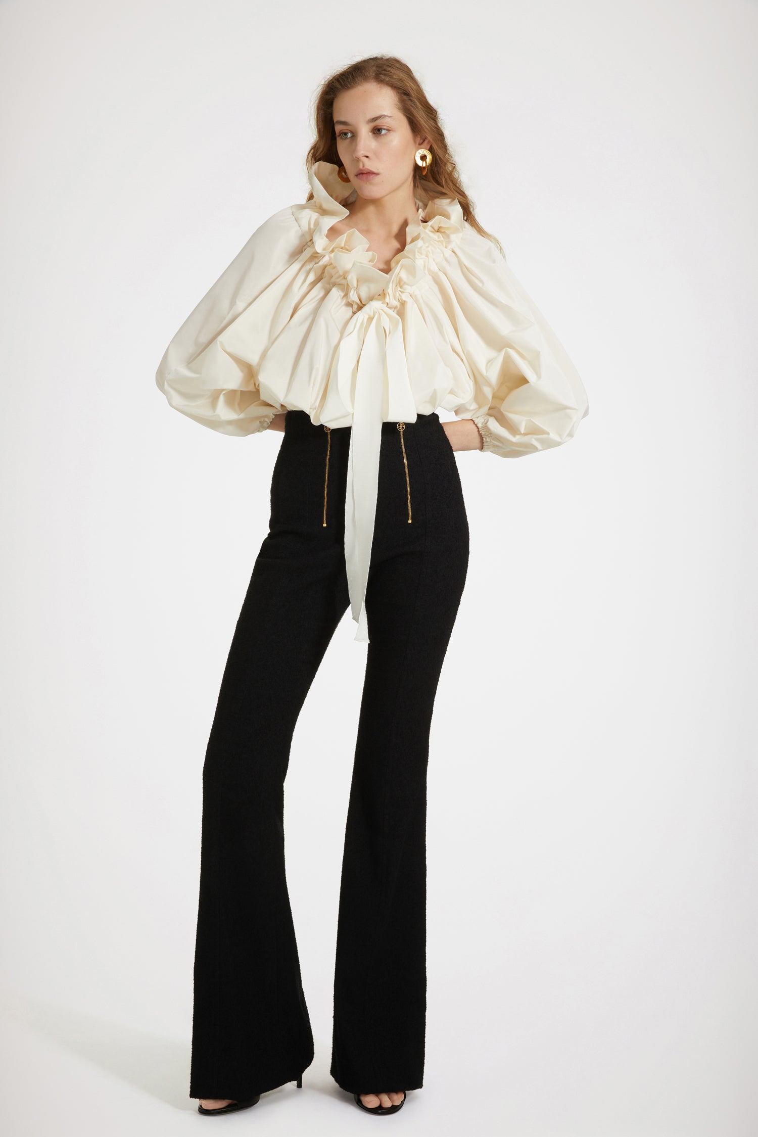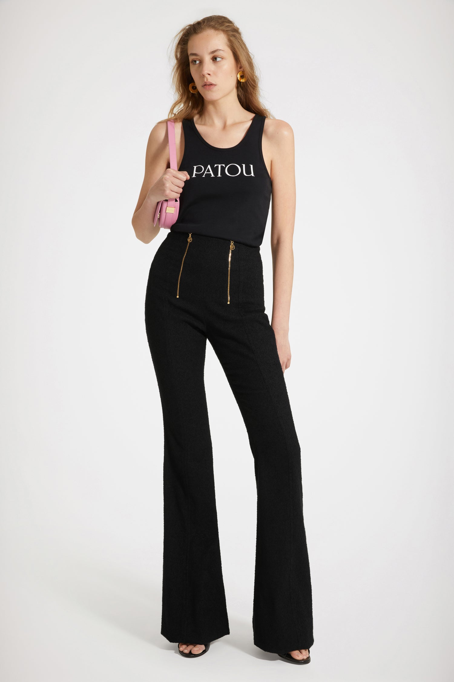 Black cotton-blend tweed trousers. Fitted flared leg. High waist. Two gold-tone zips at the front with signature JP puller. Darts at the front and back. Stitched central creases at the front. Signature curved seam at the back.