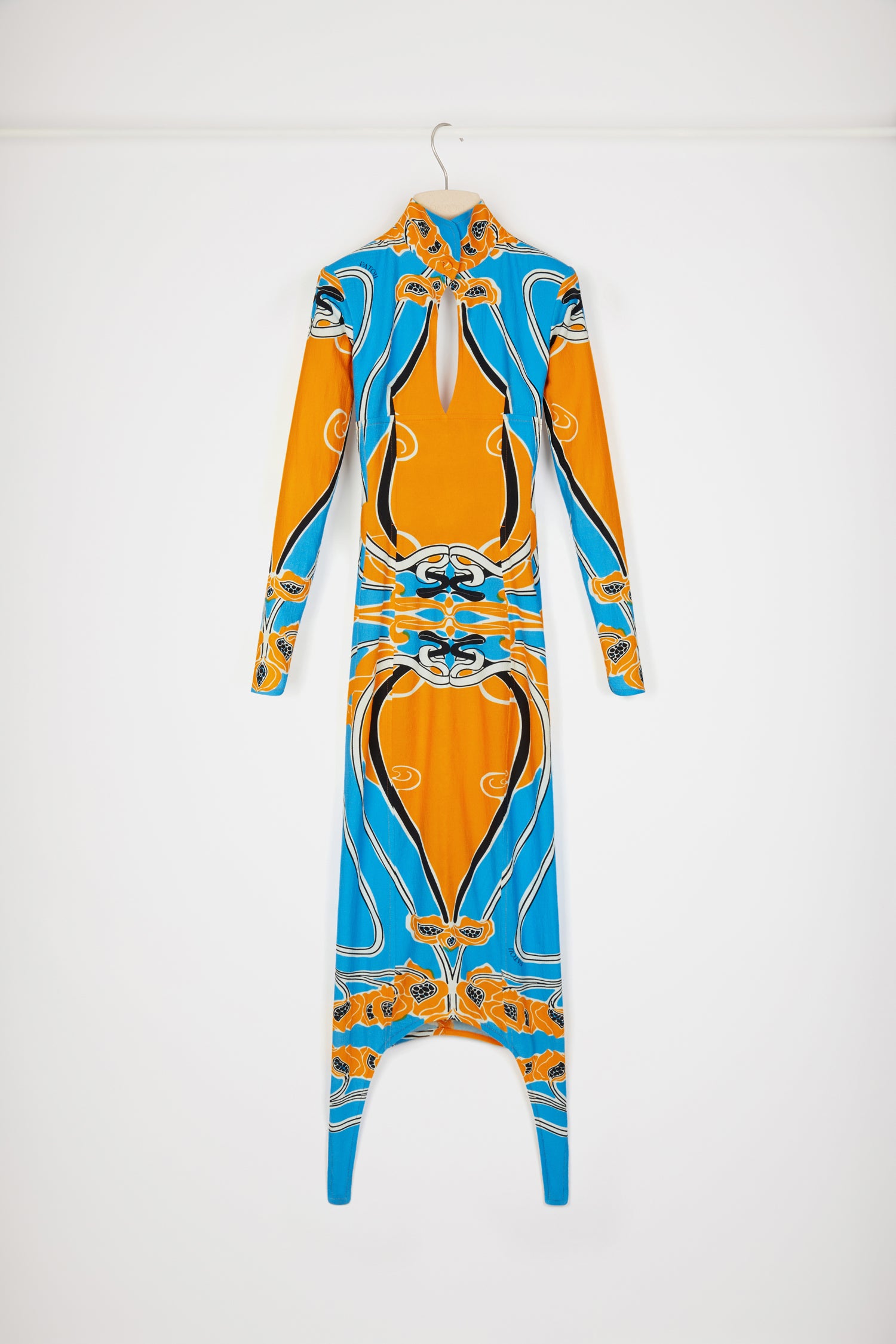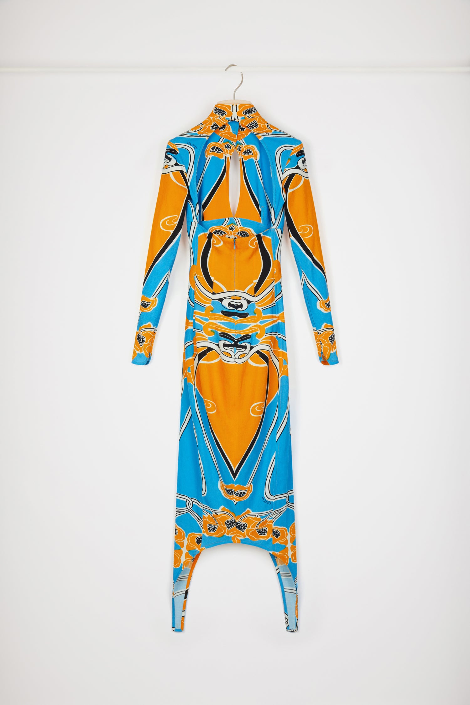 Eco-viscose and organic cotton blend dress. Seasonal Tapisserie print. Midi length. Fitted style. High neck with button and keyhole at the front. Open back. Long sleeves. Zip fastening at the back. Asymmetric curved hem.
