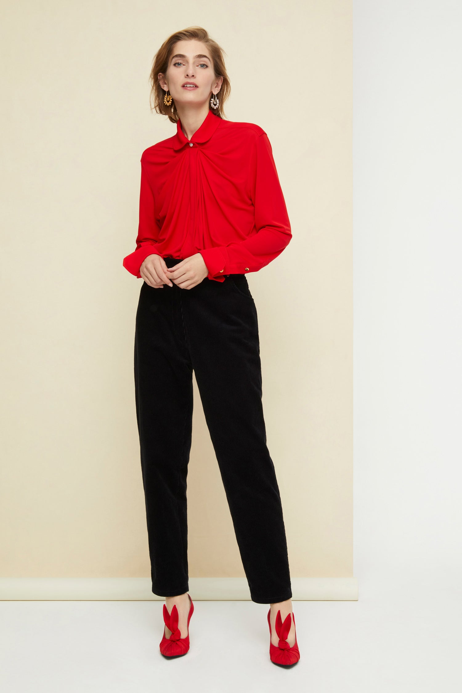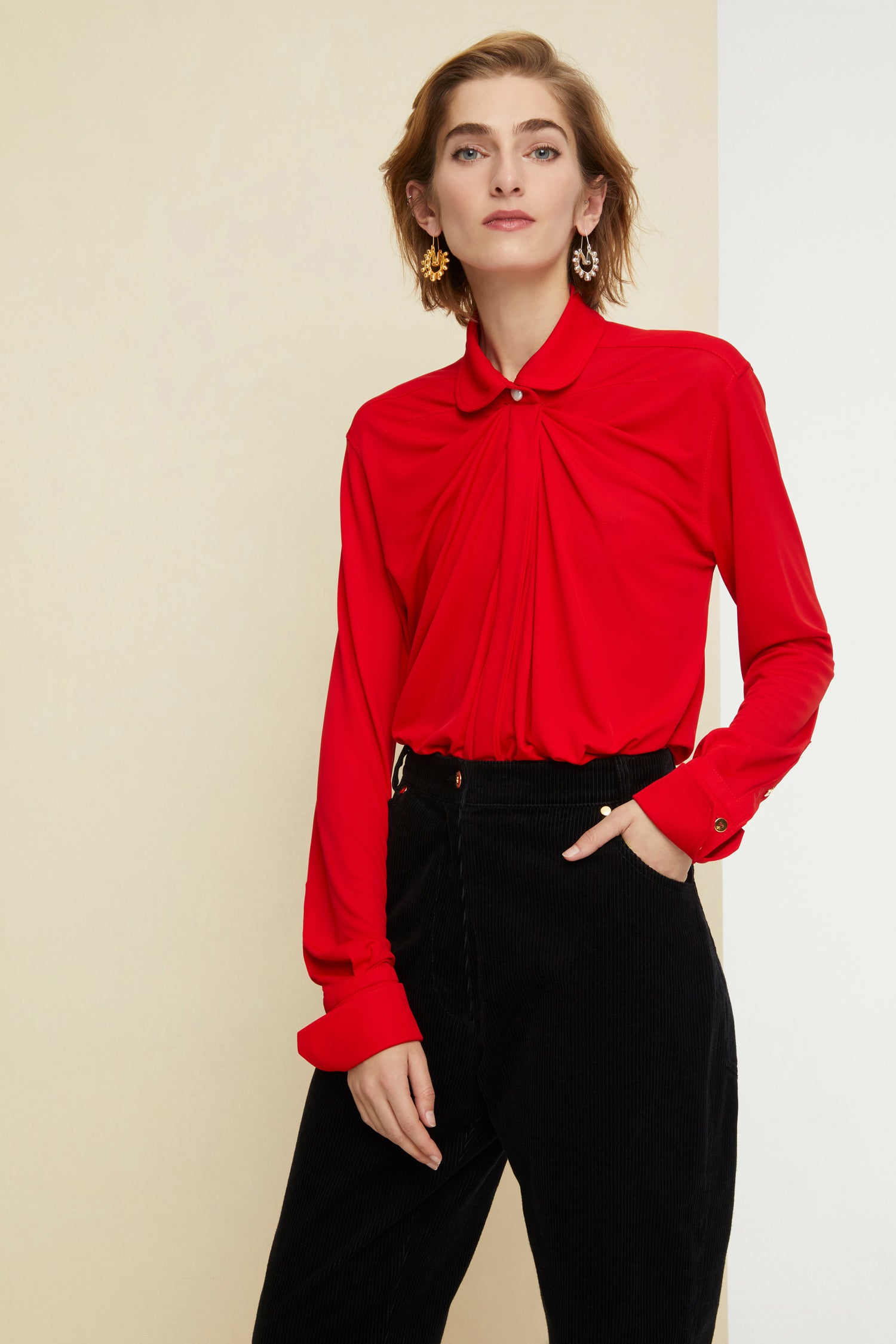 Longline-Bluse aus mohnrotem Jersey. Ein ikonischer Patou-Stil mit schmalerem Bubikragen. Drapierte Silhouette. Perlmuttknopf oben, versteckte Knopfleiste an der Vorderseite. Knöpfe an den Bundabschlüssen.