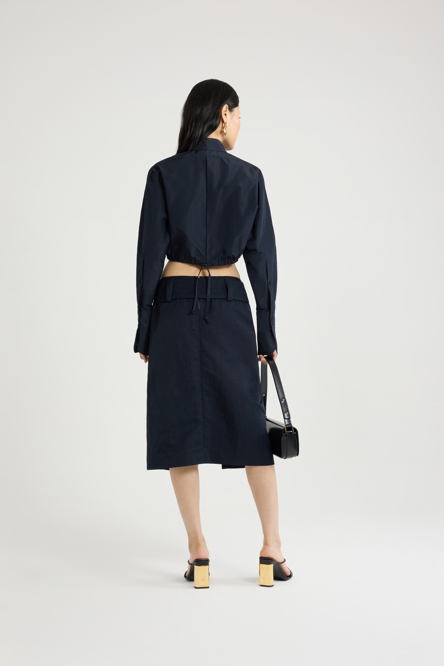 Schwarzblaues Hemd aus recycelter Polyester-Faille. Gekürzte Länge. Hemdkragen. Verdeckte Knopfleiste vorne. Hohe Brusttaschen mit Patte. Lange Ärmel mit geknöpften Manschetten. Umgekehrte Rückenfalte. Saum mit Zugband und Bindebändern hinten.