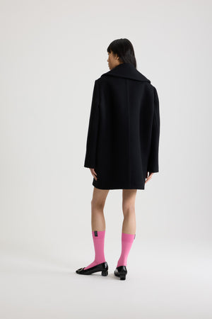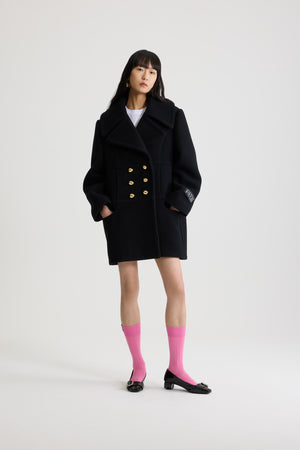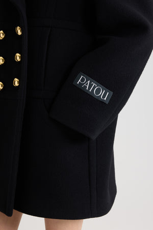 Mantel aus nachhaltiger Wollmischung in Schwarz. Länge bis zur Mitte des Oberschenkels. Gerade Silhouette. Zweireihige Konstruktion. Breites, steigendes Revers. Goldfarbene, halbkugelförmige Knöpfe mit JP-Monogramm. Rundsäume vorne. Saumtaschen. Patou Logoetikett auf dem linken Ärmel. Gefüttert.