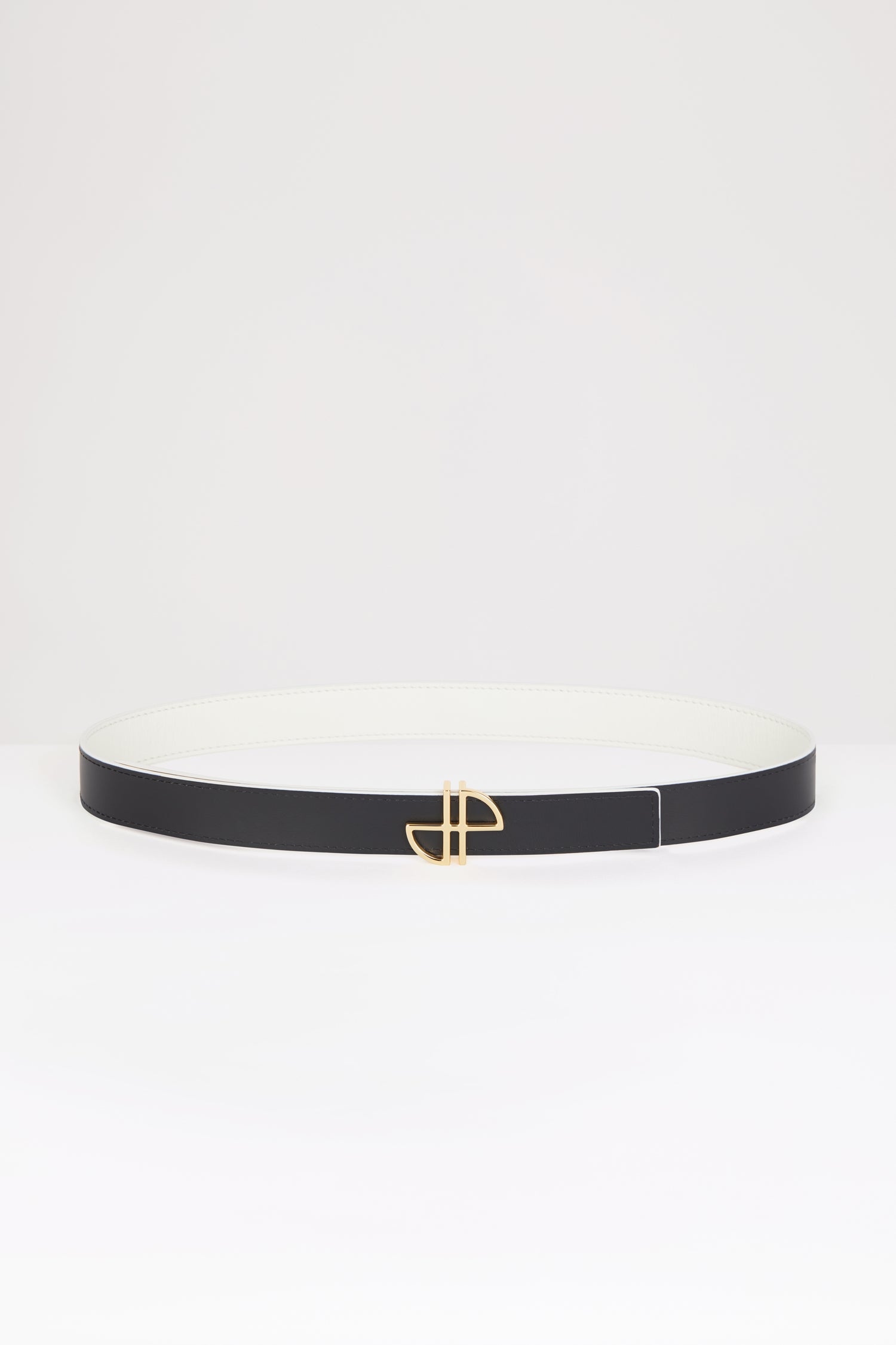 Gürtel aus Leder in Avalanche-Weiß. Goldfarbene JP-Schließe. Verstellbares Design. Druckknopfverschluss. Pflanzlich gegerbtes Leder auf der Innenseite.