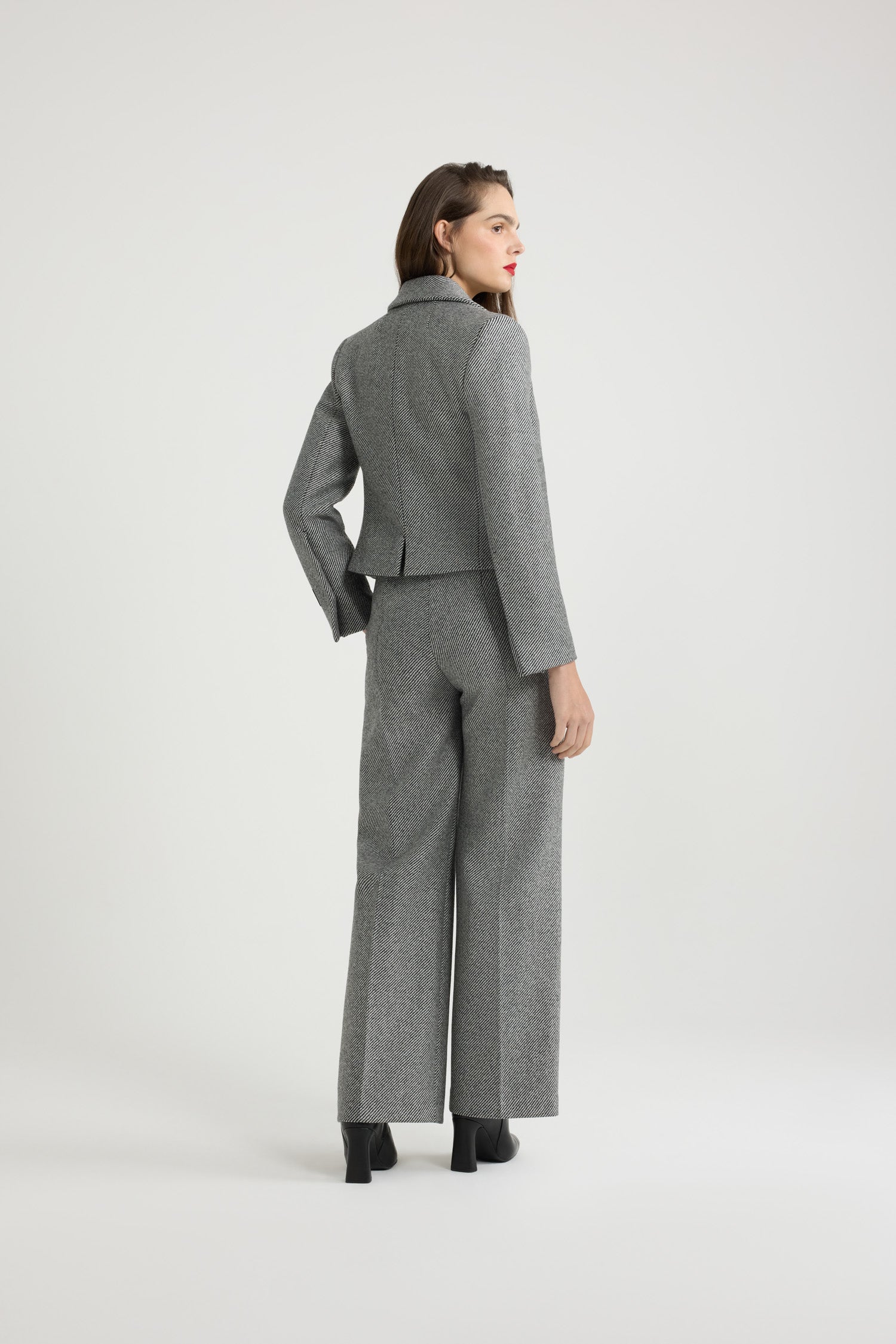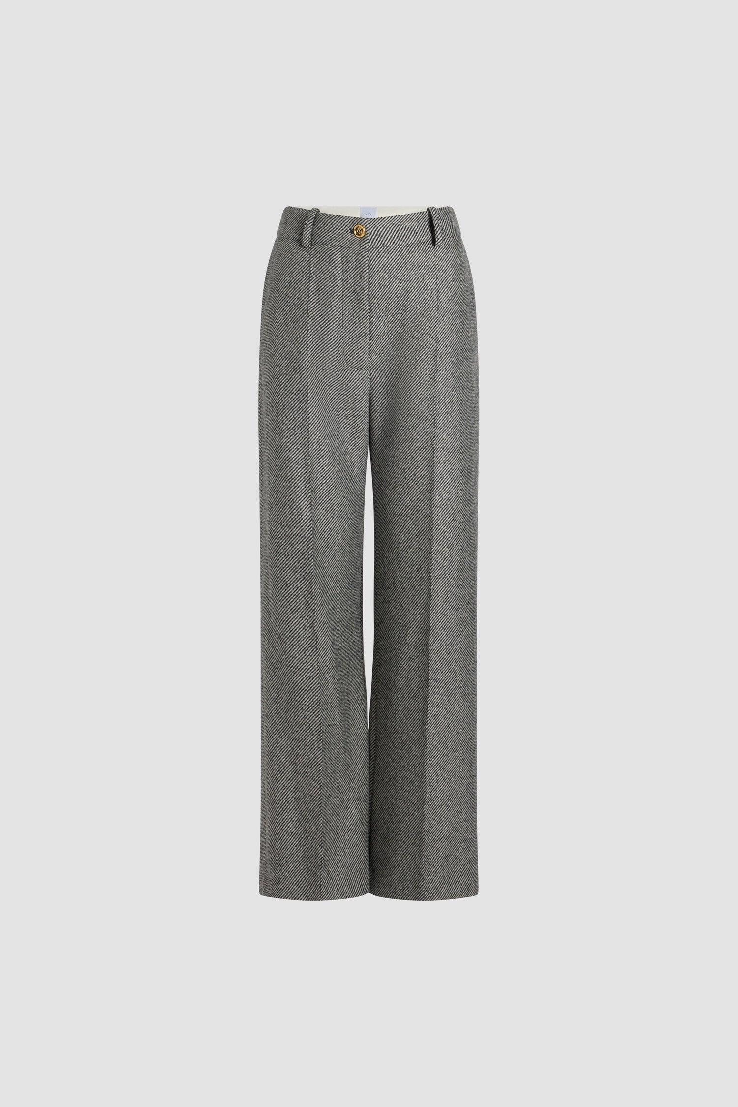 Hose aus Wolle in Graphitgrau. Strukturierter Schneiderstoff mit zweifarbigen diagonalen Streifen. Charakteristische Patou Passform. Langer, gerader Schnitt. Goldfarbener Knopf mit JP-Gravur und verdeckter Reißverschluss vorne. Gürtelschlaufen, zwei Seitentaschen. Charakteristische Abnäher hinten.