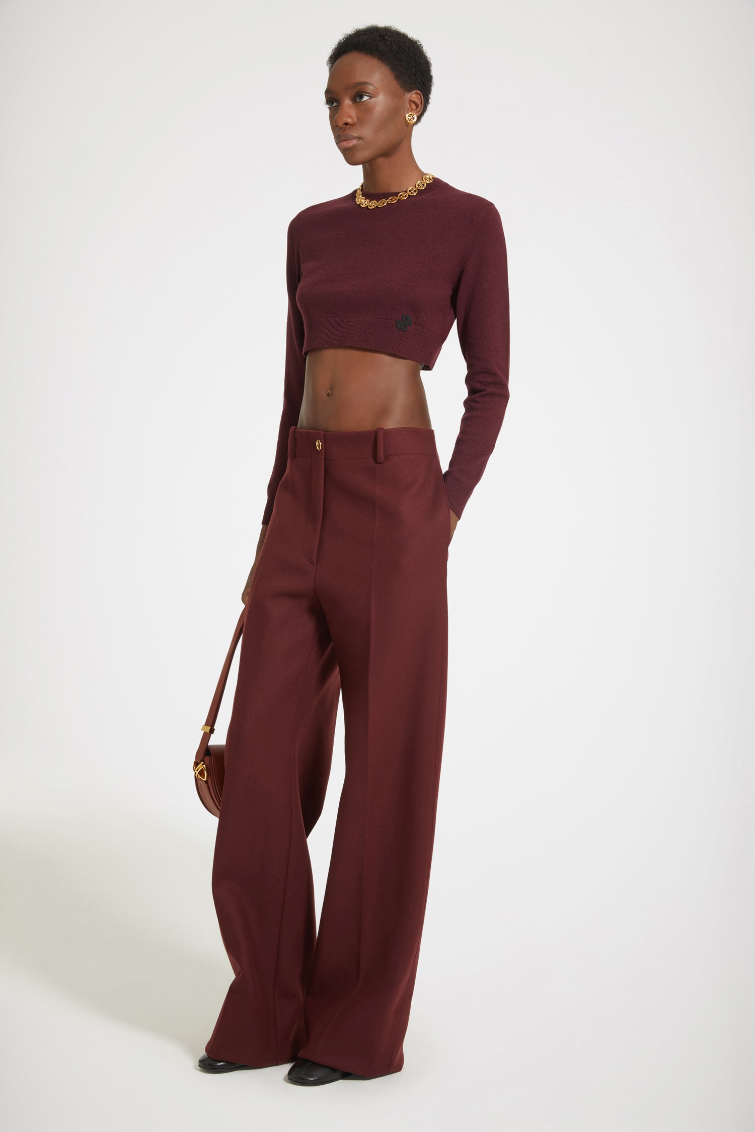Hose aus Filz-Wollmix in Ruby-Weinrot. Charakteristische Patou Passform. Langer, gerader Schnitt. Goldfarbener Knopf mit JP-Gravur und verdeckter Hosenschlitz mit Reißverschluss vorne. Gürtelschlaufen, zwei Seitentaschen. Charakteristische Abnäher hinten.