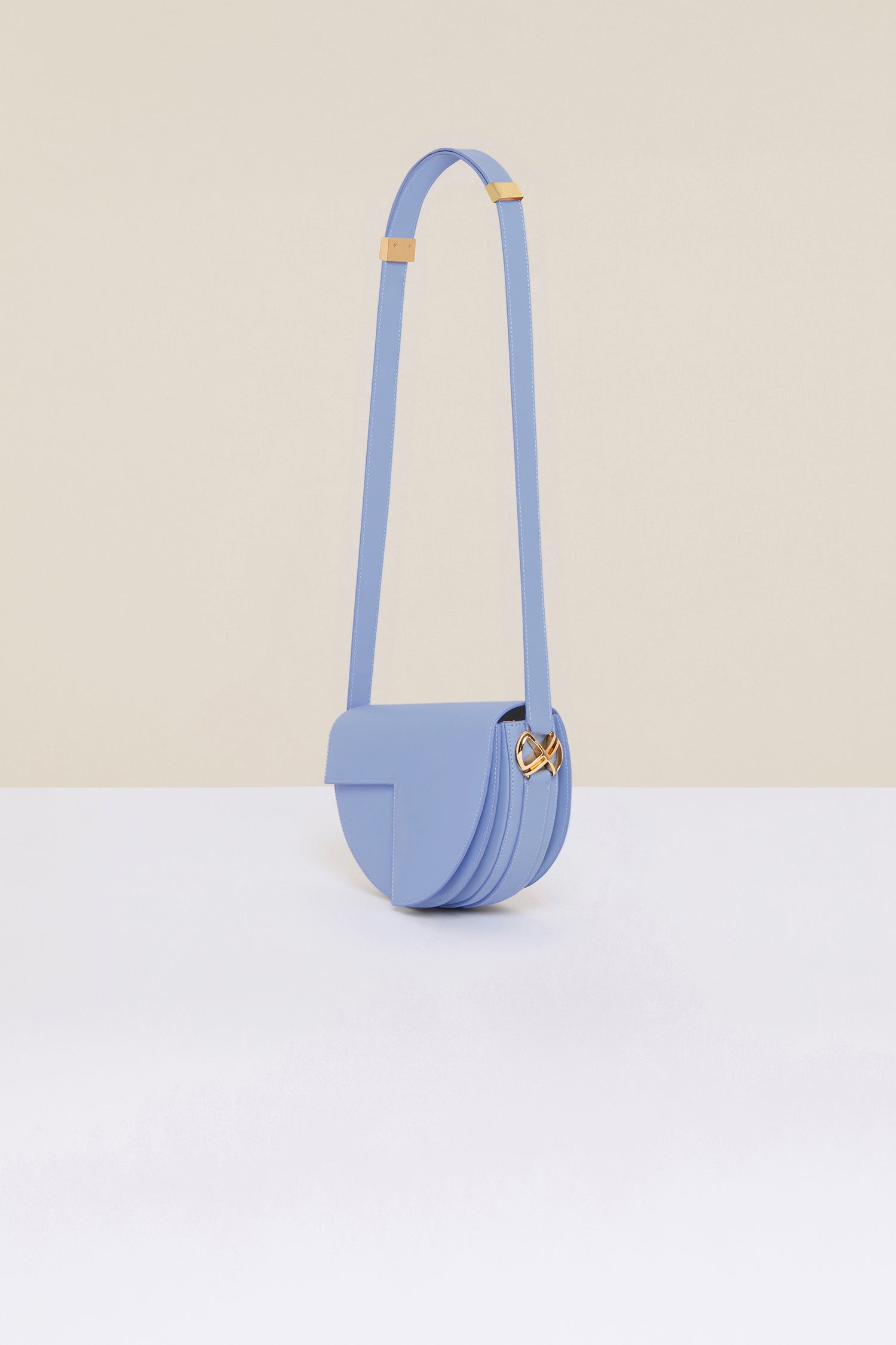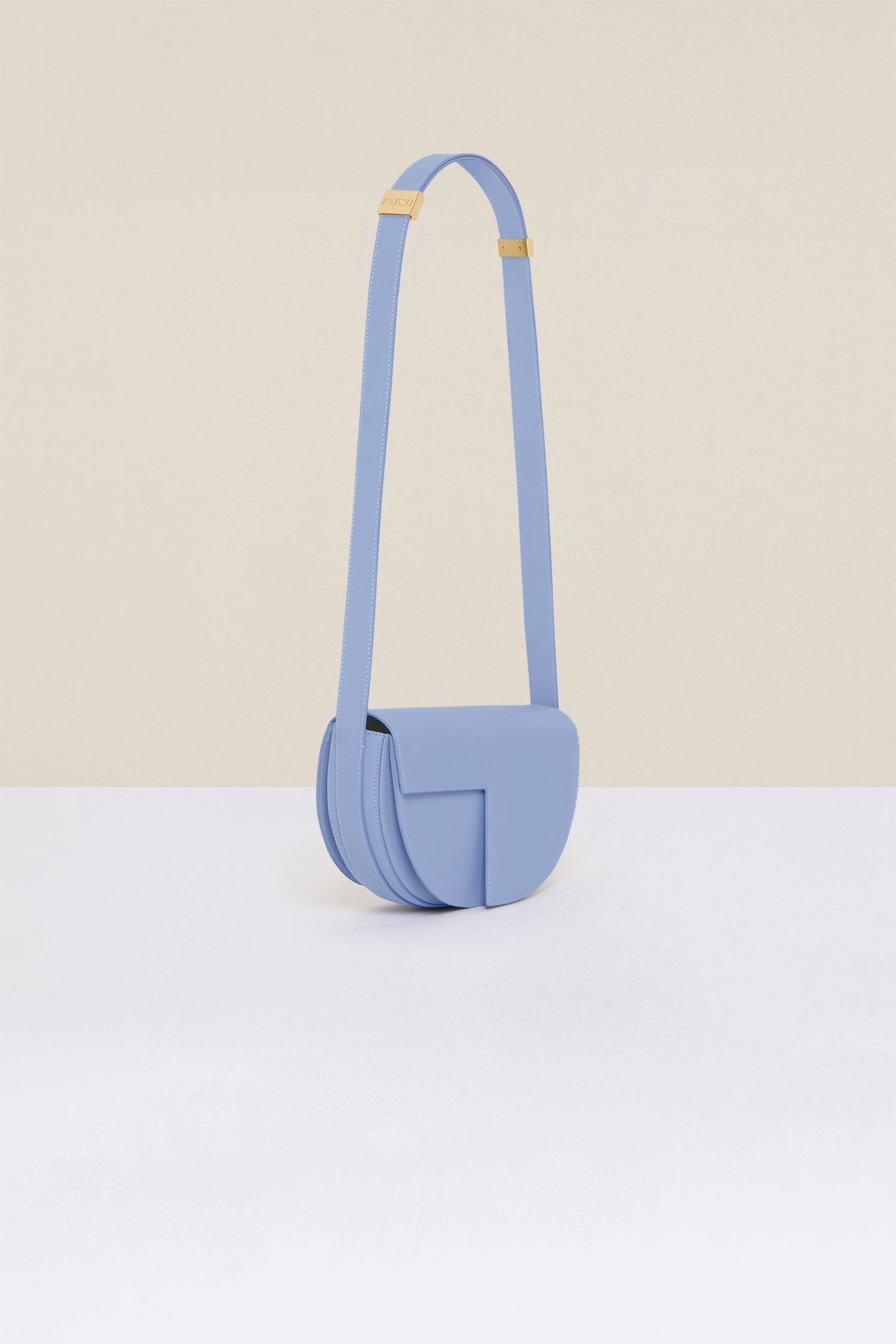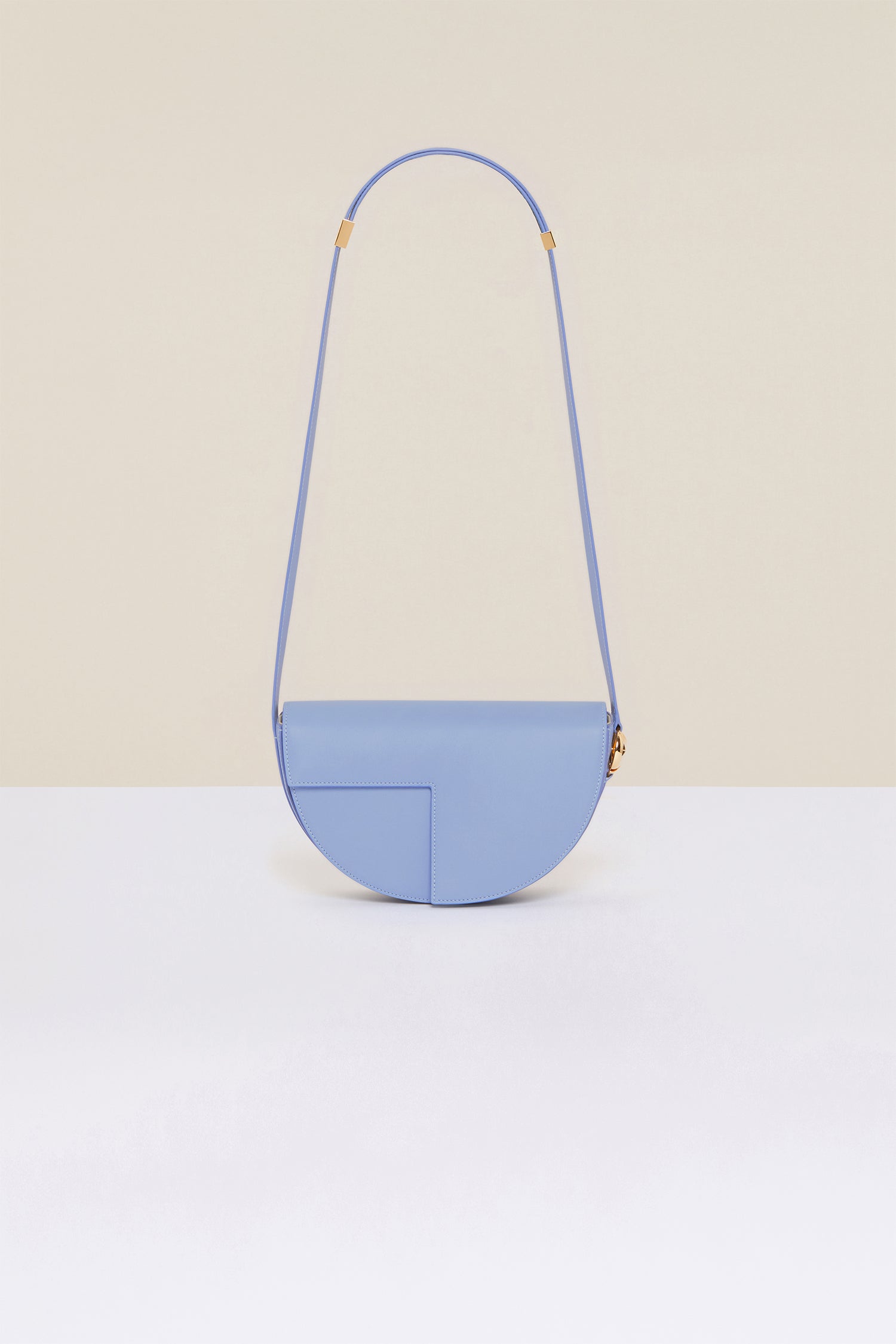Handtasche aus Leder in Alaska-Blau. Gefertigt aus einzigartigen Materialien, die aus unverwendeten hochwertigen Lederhäuten gewonnen wurden. 40 nummerierte Exemplare in limitierter Auflage. Halbkreis-Format mit geometrischen, vom JP-Monogramm inspirierten Cut-Outs. Goldfarbene Metallelemente mit JP-Monogramm-Detail an der Seite. Verstellbarer Riemen zum Tragen über der Schulter, diagonal am Körper oder in der Hand. Magnetverschluss mit goldfarbenem JP-Detail. Mehrere Fächer auf der Innenseite. Öko-Futter.