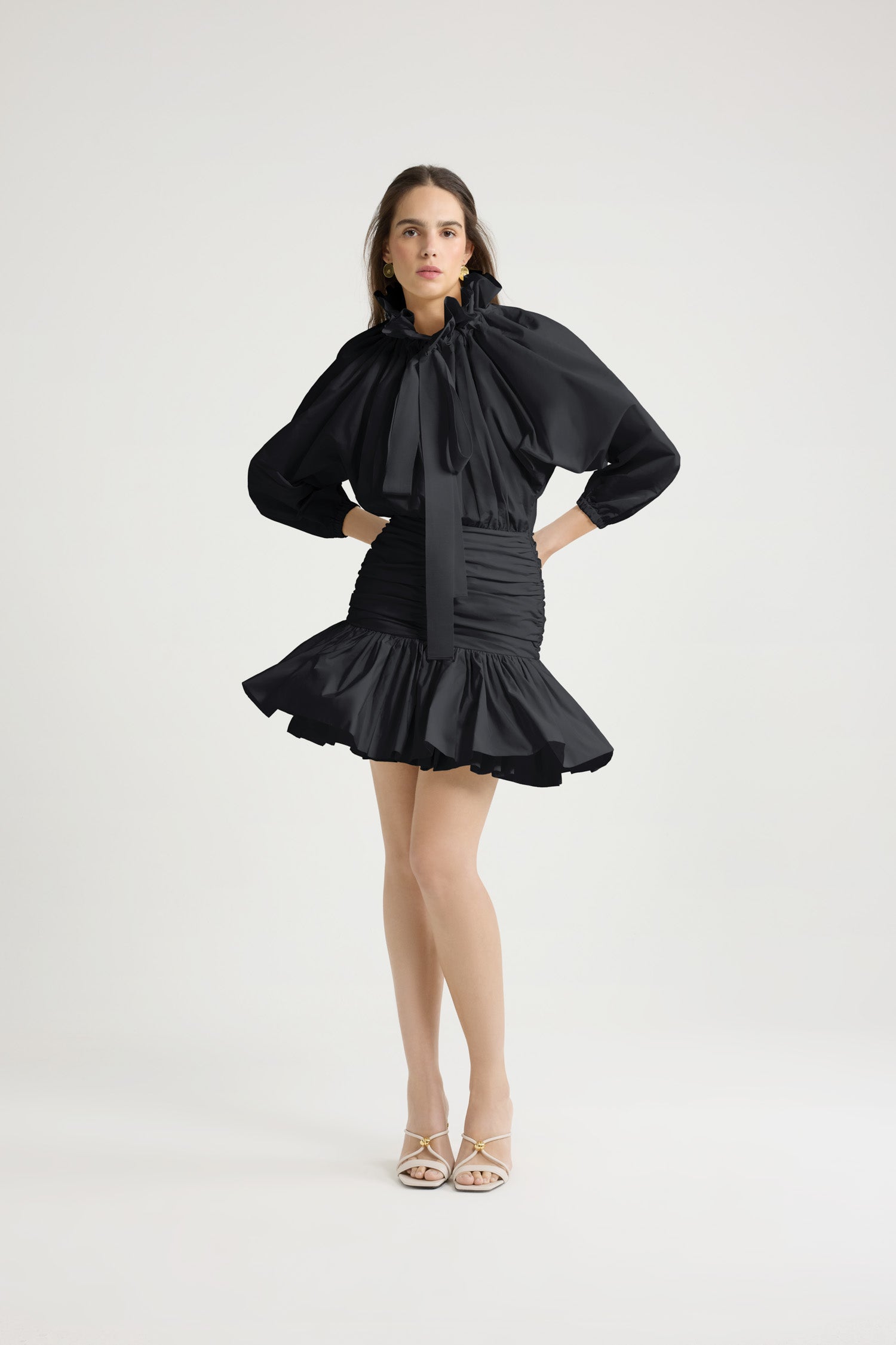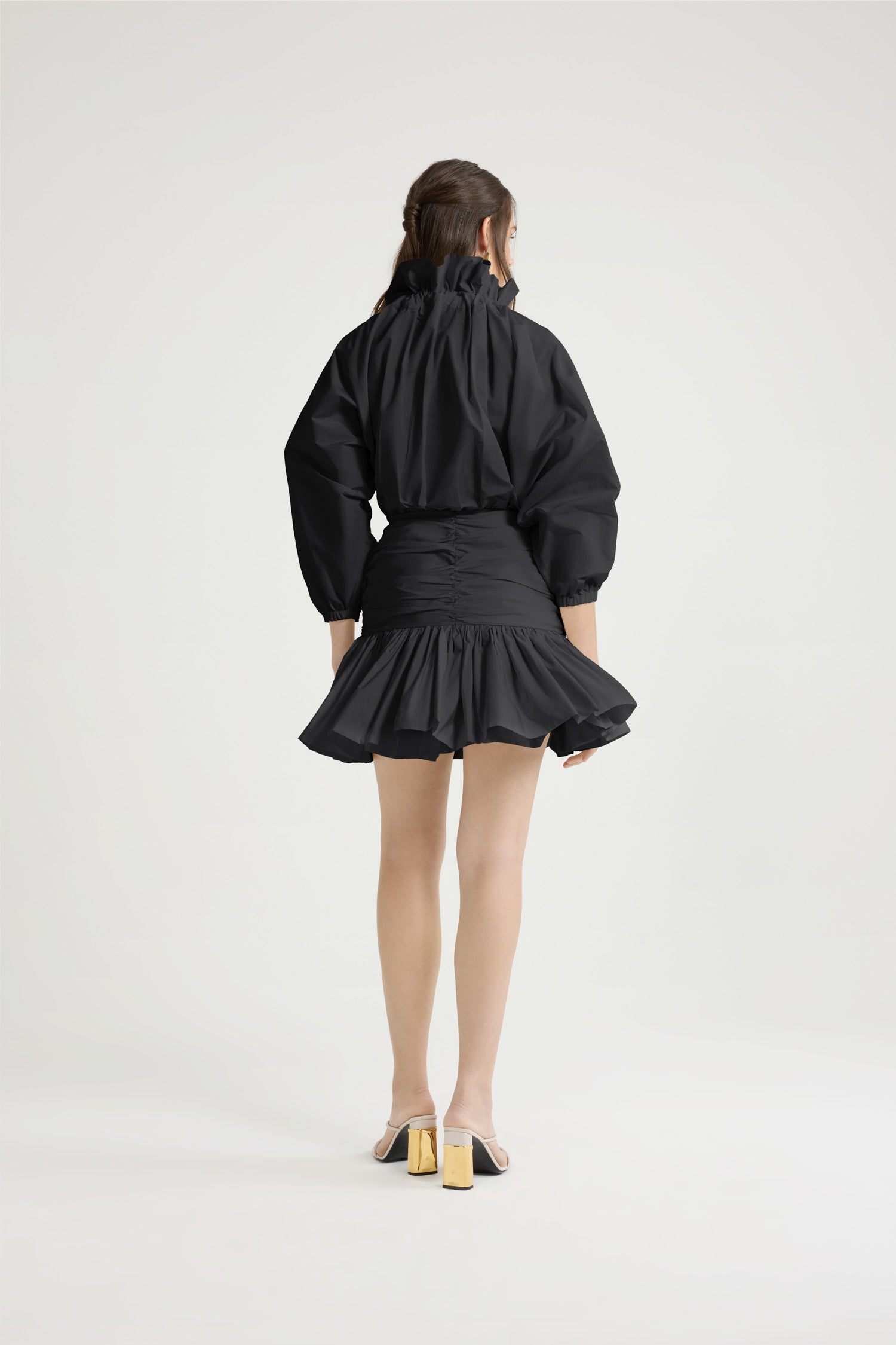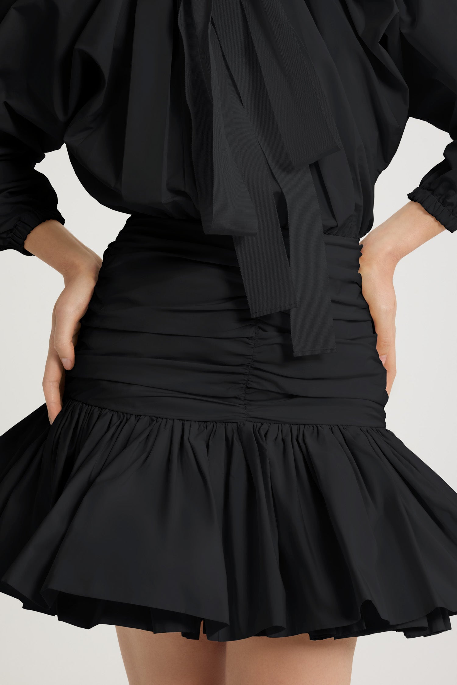 Kleid aus recyceltem Polyester-Faille in Schwarz. Kurz geschnitten. Bauschiges Oberteil mit eng anliegendem Rock. Tunnelzugkragen mit Rüschen an der Vorderseite und langen Grosgrain-Bändern zum schulterfreien Tragen. Fledermausärmel mit elastischen Abschlüssen. Gerüschter Rock mit Rüschensaum. Seitlicher Reißverschluss.