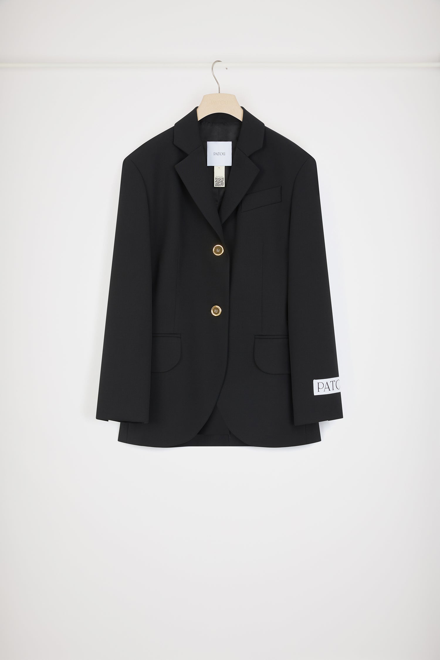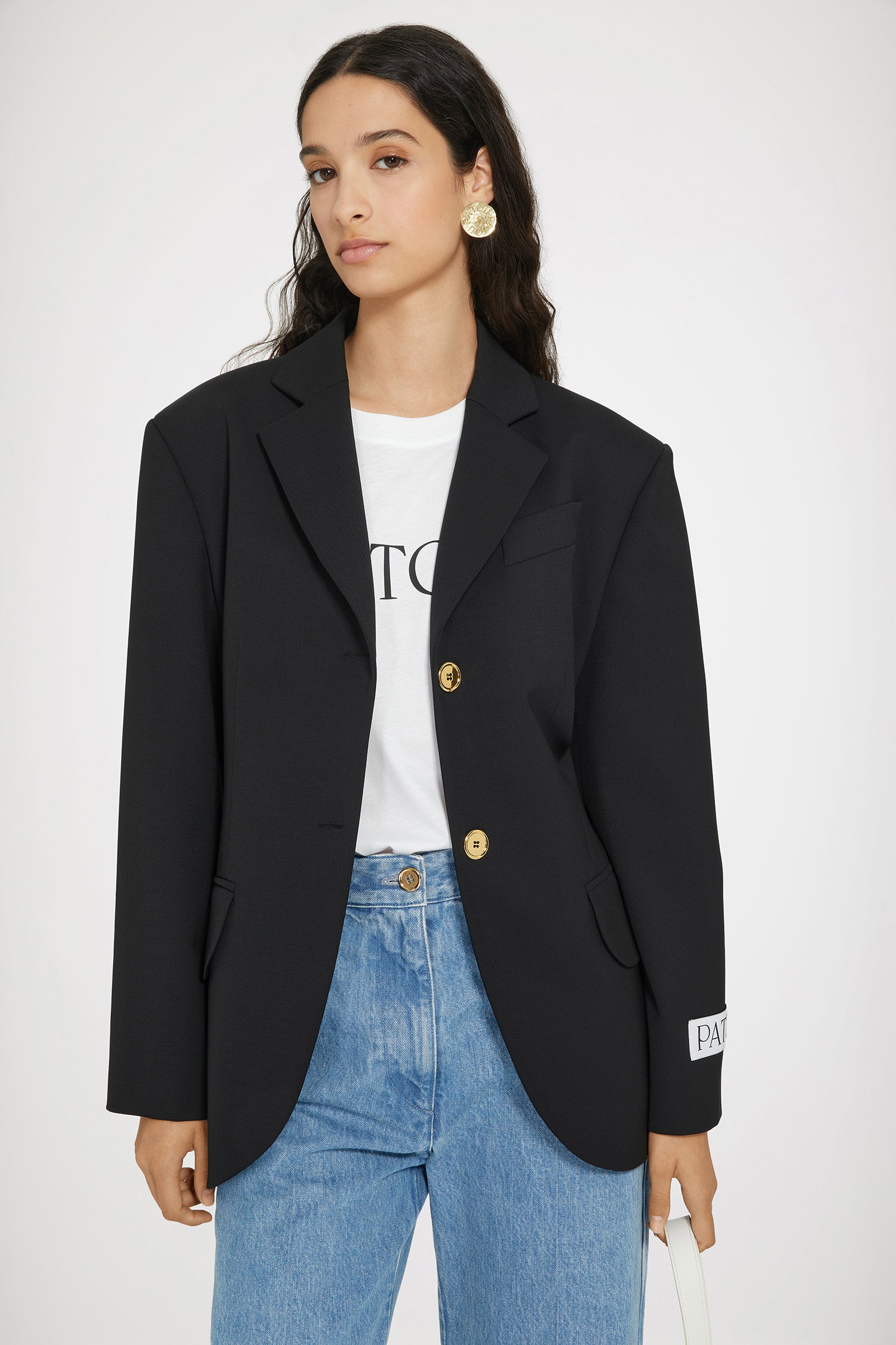 Jacke aus technischem Wolltwill in Schwarz. Lockere Passform. Fallendes Revers. Goldfarbene Knöpfe mit Patou-Gravur. Stoffgürtel mit Schnürung hinten. Pattentaschen. Geknöpfte Manschetten. Patou Aufnäher auf dem linken Ärmel. Gefüttert.
