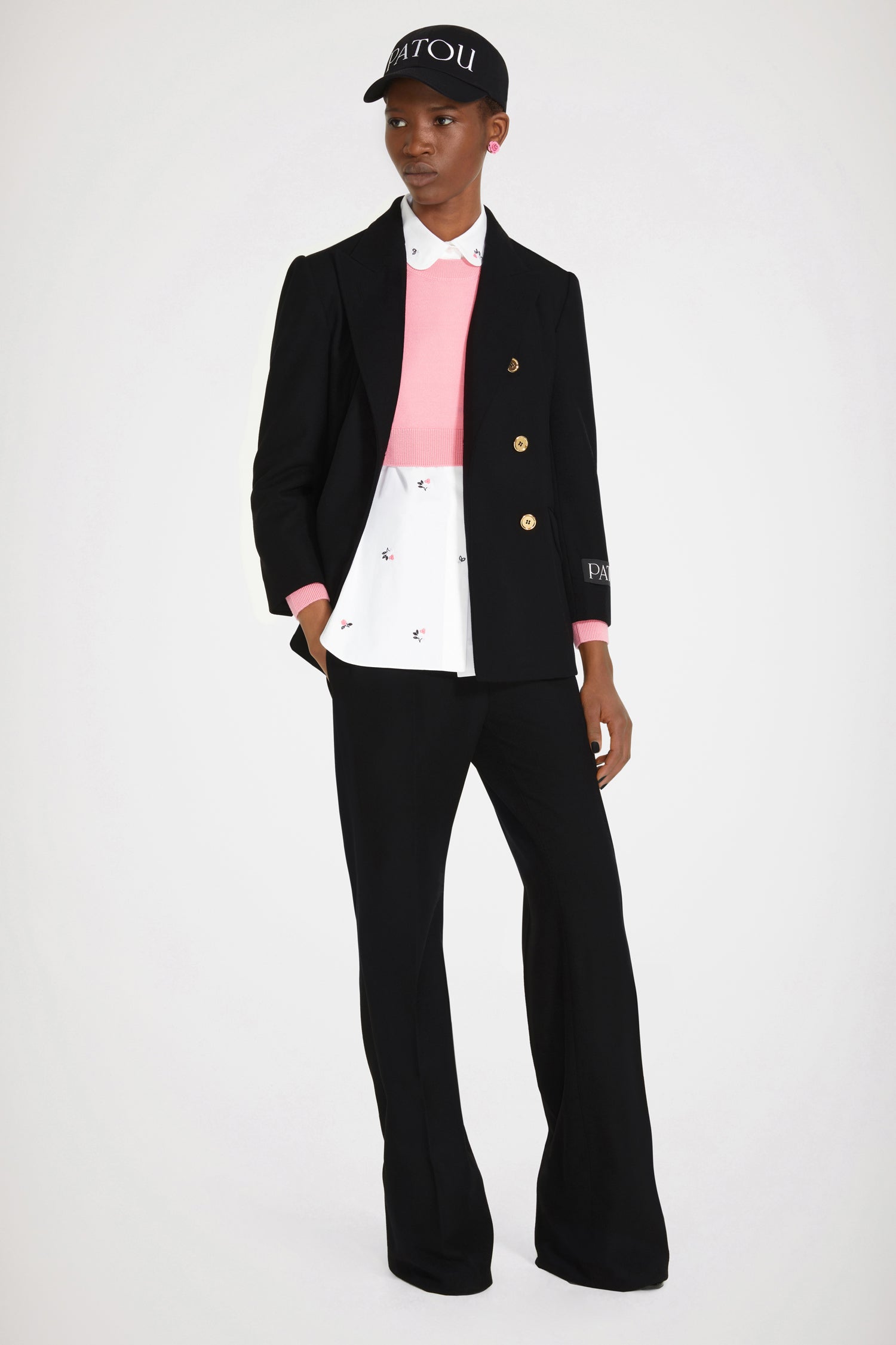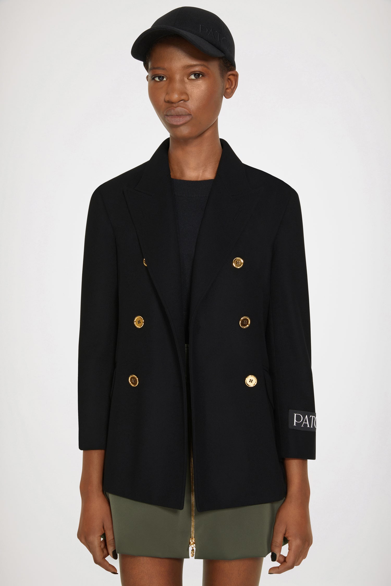 Jacke aus Wolle und Kaschmir in Schwarz. Doppelreihig geknöpft. Goldknöpfe mit Patou Gravur vorne und an den Ärmelabschlüssen. Patou Aufnäher auf dem Ärmel. Zwei Pattentaschen vorne, eine Innentasche. Ein hoher Schlitz hinten mit Knopfverschluss. Vollständig gefüttert.