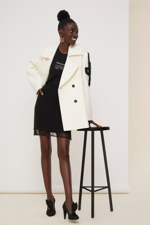 Schwarzer Minirock aus extrafeiner Merinowolle. Körpernah. Perlenbesatz am Saum.