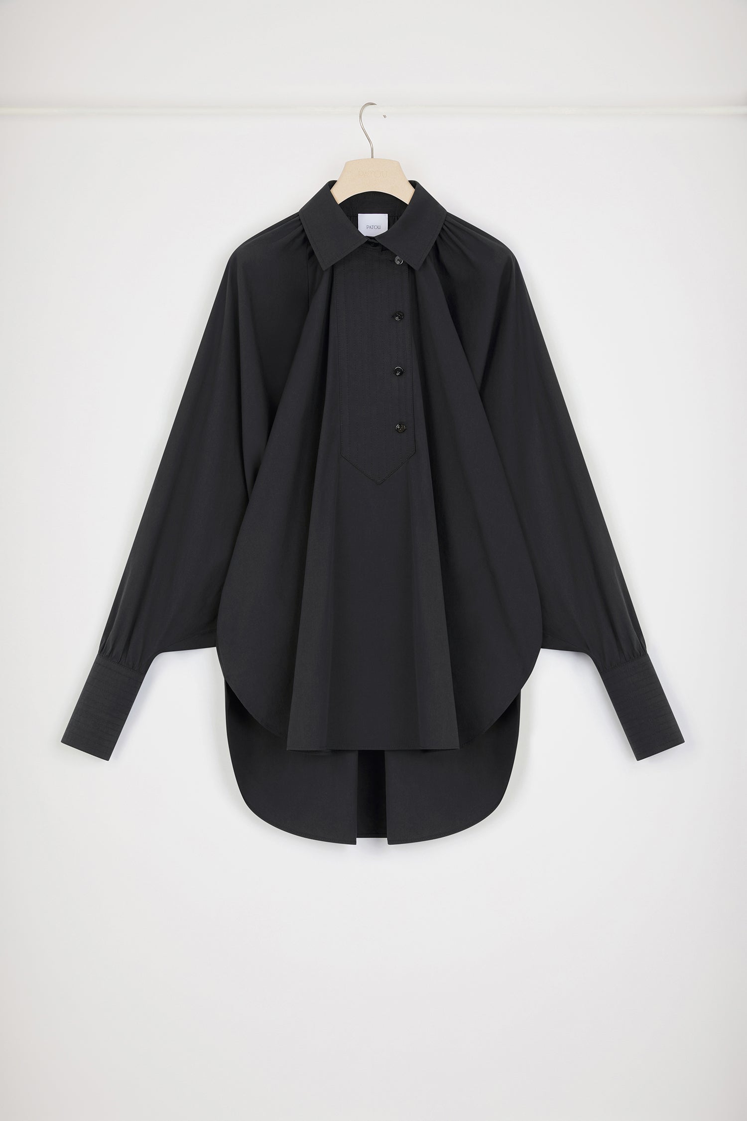 Bluse aus nachhaltiger Baumwollpopeline in Schwarz. Locker sitzend. Pull-on-Stil mit abgestepptem Latz und versetzter Knopfleiste auf der Vorderseite. Hemdkragen. Hinten gerüscht. Fledermausärmel. Abgesteppte, geknöpfte Manschetten. Von vorne nach hinten asymmetrischer Saum.