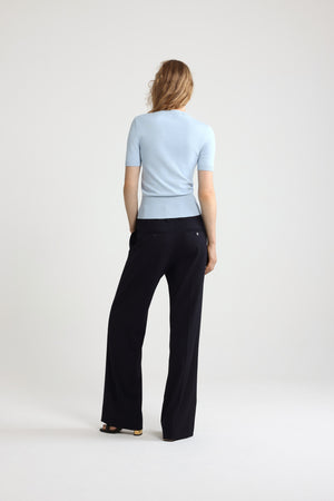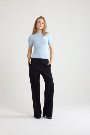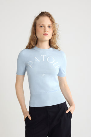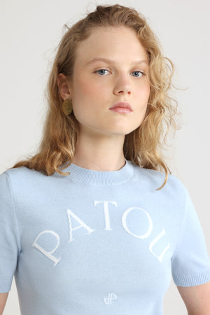 Himmelblaues Oberteil aus einer Baumwollmischung. Rundhalsausschnitt. Rippung an Kragen, Ärmelabschlüssen und Taille. Kurze Ärmel. Patou Logo und JP-Jacquard-Monogramm vorne.