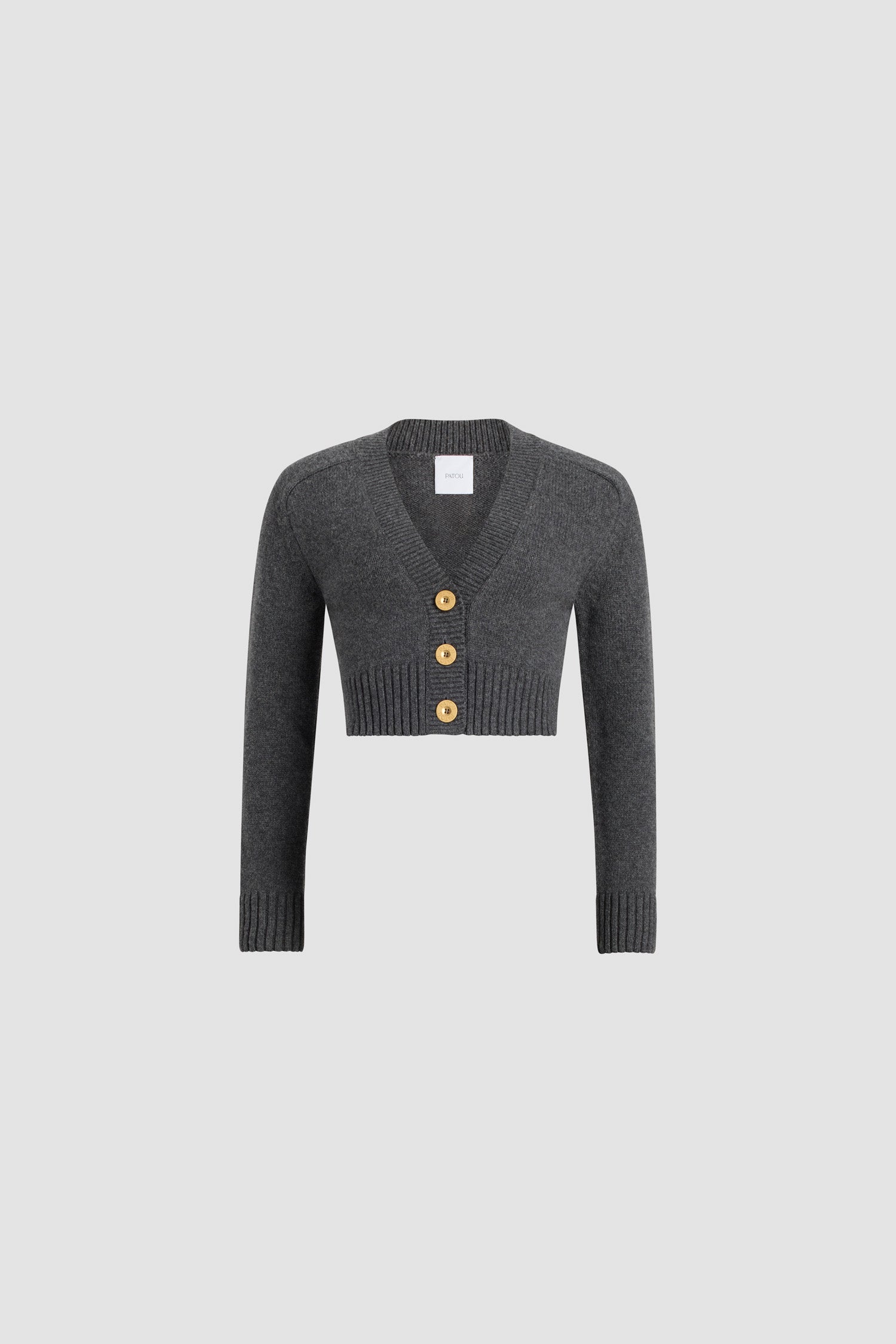 Cardigan aus Merinowolle und Kaschmir in Quecksilber-Grau. Gekürzte Länge. V-Ausschnitt. Rippung an Kragen, Ärmelabschlüssen und Saum. Goldfarbene Knöpfe mit Patou Logogravur. Kontrastfarbene Ellbogenaufnäher.