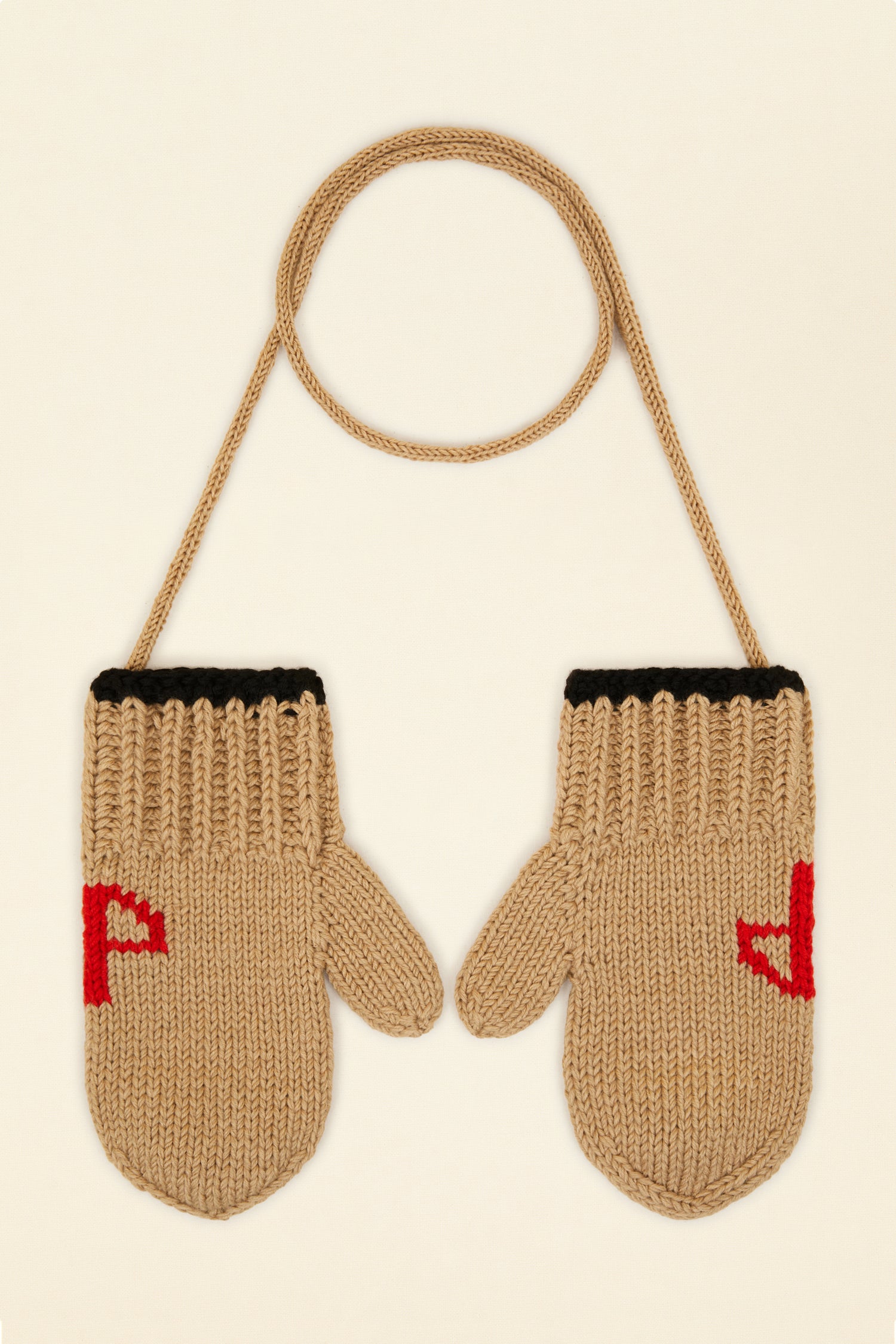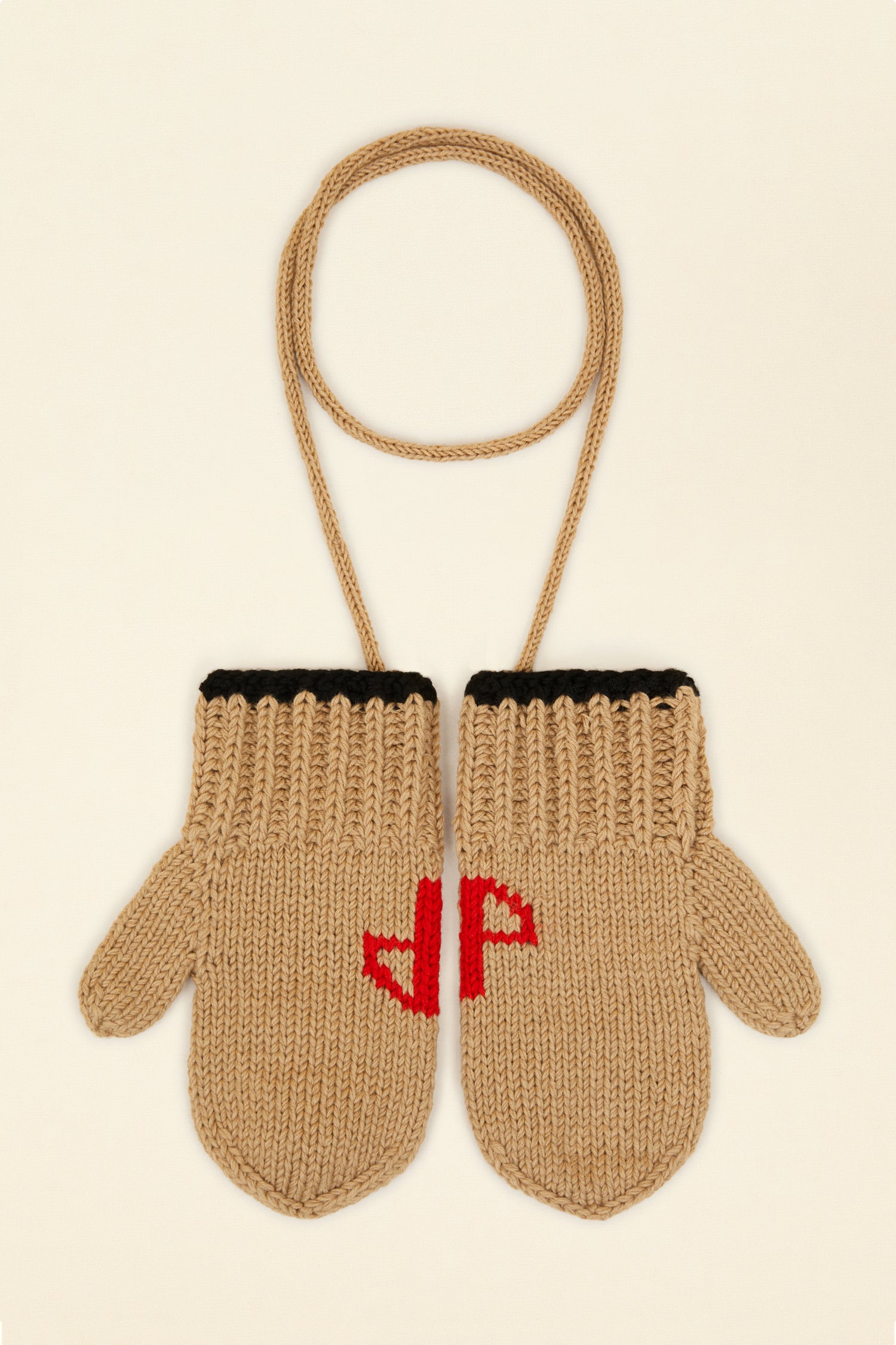 Fäustlinge aus Merinowolle in hellem Kastanienbraun. Teil der Patou Neige Kollektion. Handgestrickt. Aufgesticktes JP-Monogramm in Rot. Kontrastierende schwarze Borte. Die Fäustlinge können über ein Band miteinander befestigt werden.
