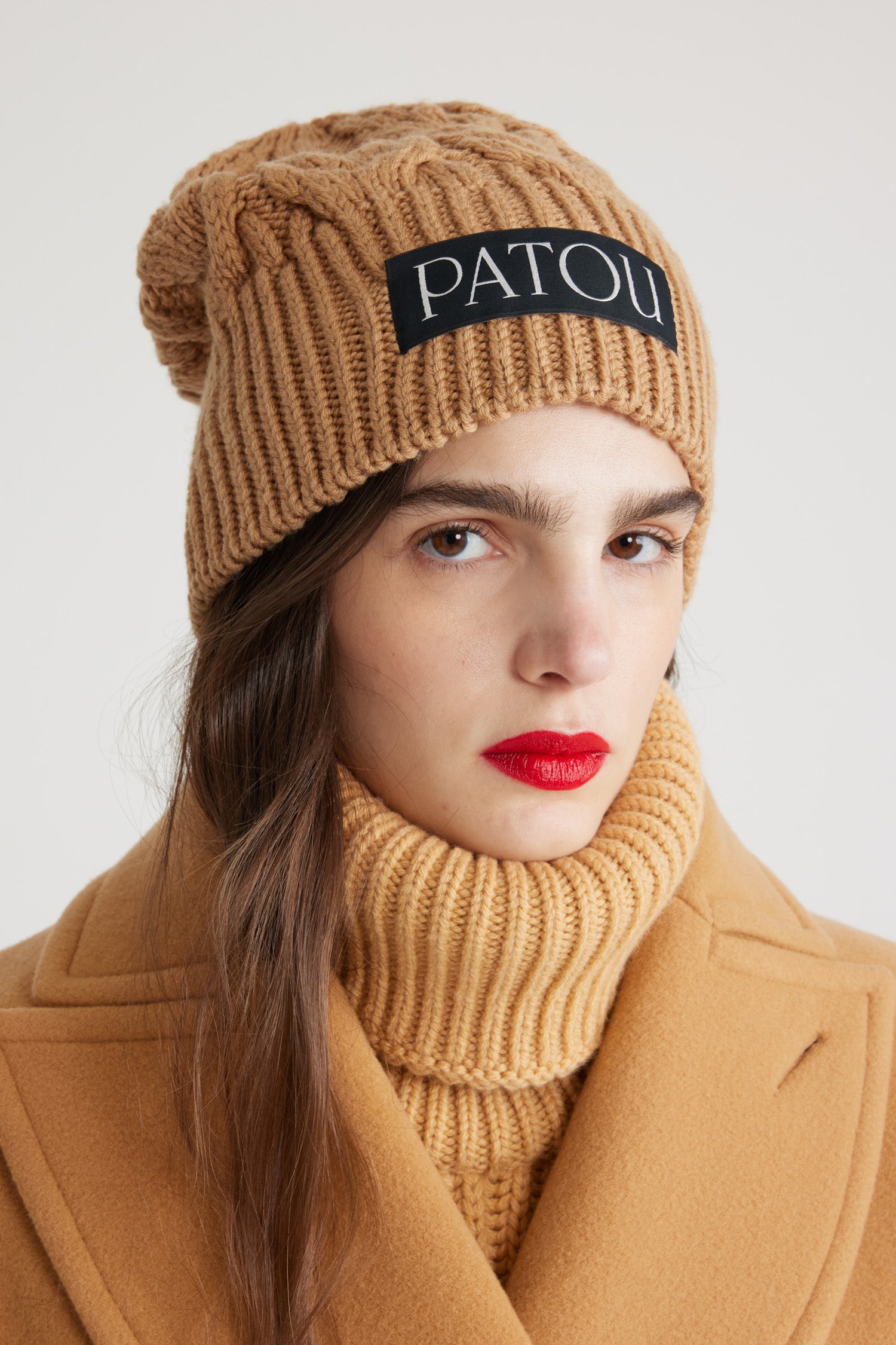 Chestnut light brown sustainable wool beanie. Cable knit. Patou label at the front.