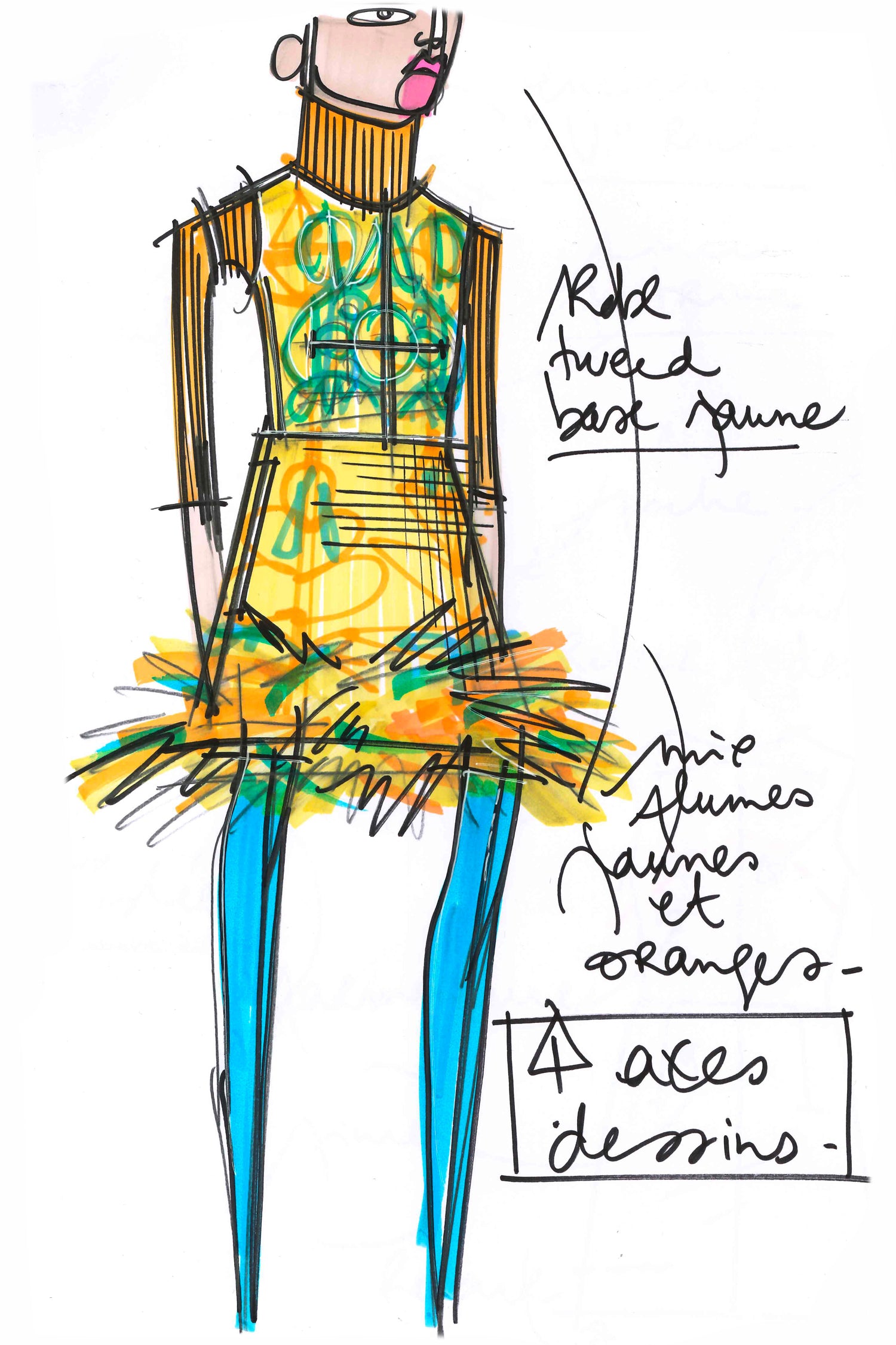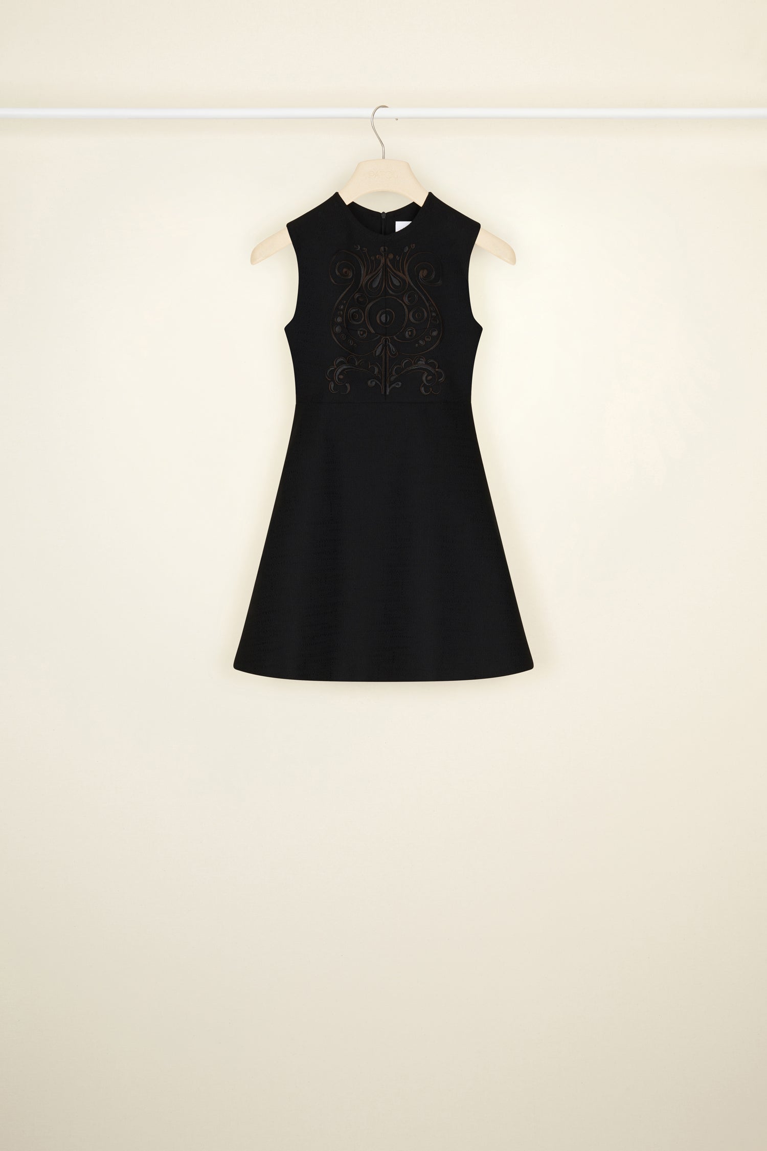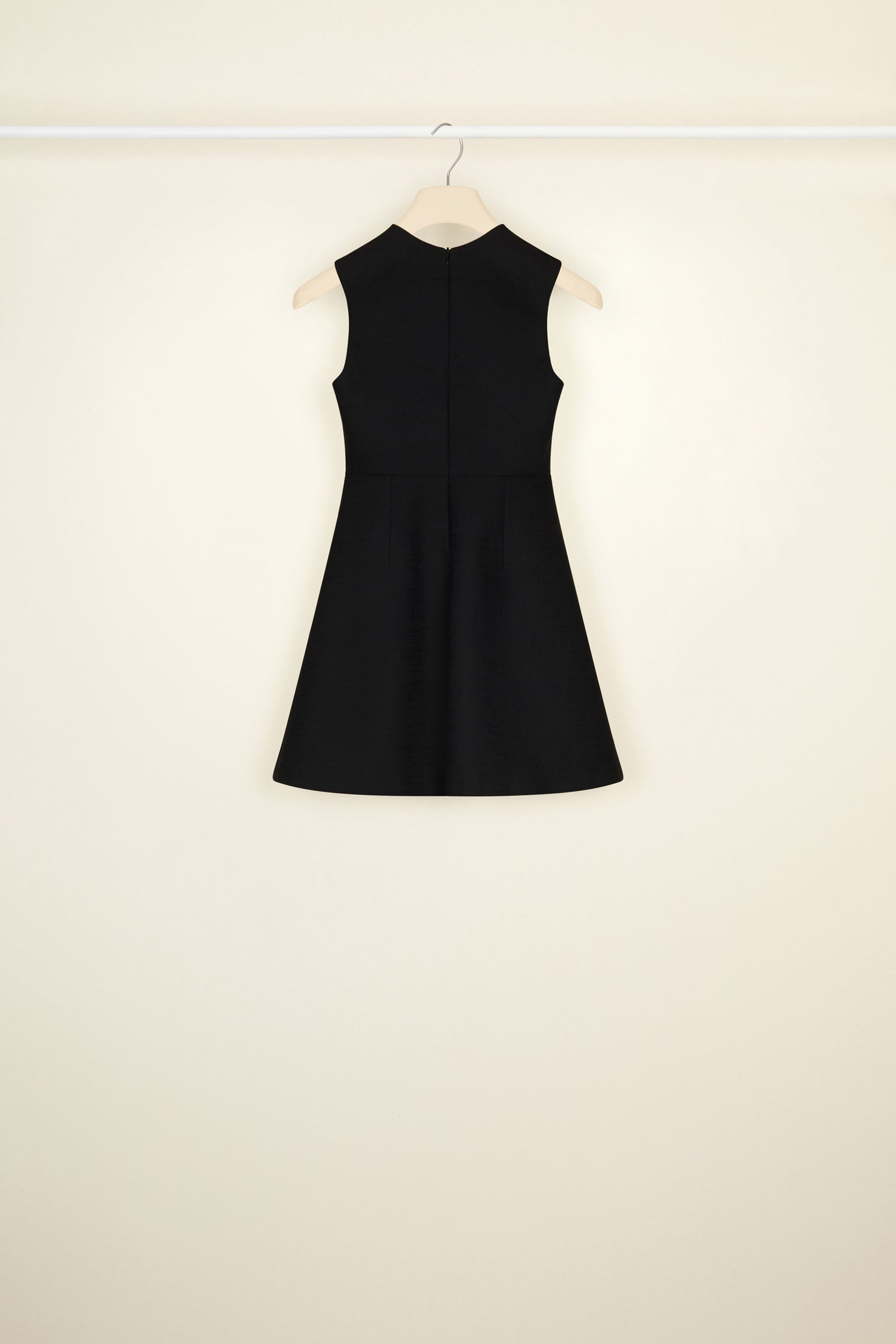 Black cotton and wool tweed mini dress. Floral embroideries inspired by Fantasia Botanica’s signature print; two-tone thread to provide extra depth. Sleeveless style with fitted bodice. Zip fastening and signature curved seam the back.Flared skirt with pockets at the sides and darts at the back.