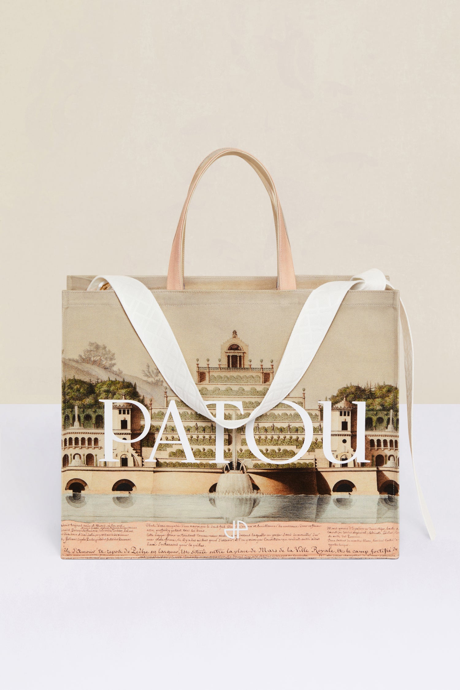 Organic cotton tote featuring Jean-Jacques Lequeu's “Amour Island” print. Patou lettering logo and JP monogram in white. White embossed shoulder strap with gold button on one side and adjustable knot on the other side. Two tone-on-tone top handles. Can be carried by hand or on the shoulder.