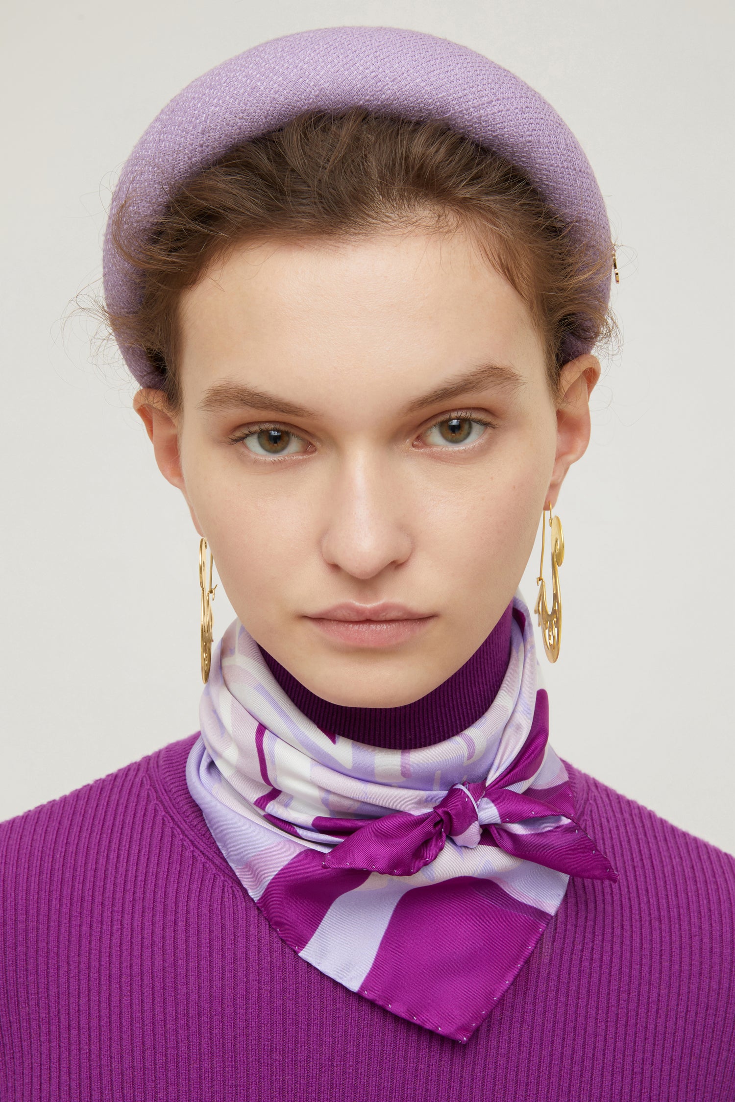 Silk twill square scarf featuring a Wisteria Flower pattern. Entirely drawn by hand. Handwritten Patou signature.