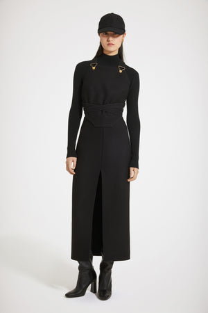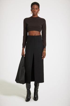 Black wool-blend felt skirt. High waist. Midi length. Fitted silhouette with multiple darts at the back. High slit at the front. Zip fastening at the back. Fully lined.