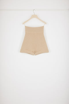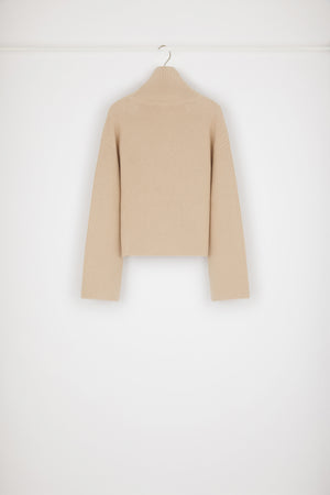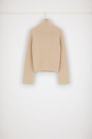 Biscuit beige Merino wool jumper. Rib knit. High turtleneck collar. Decrease detail on the shoulders. Slightly flared sleeves.