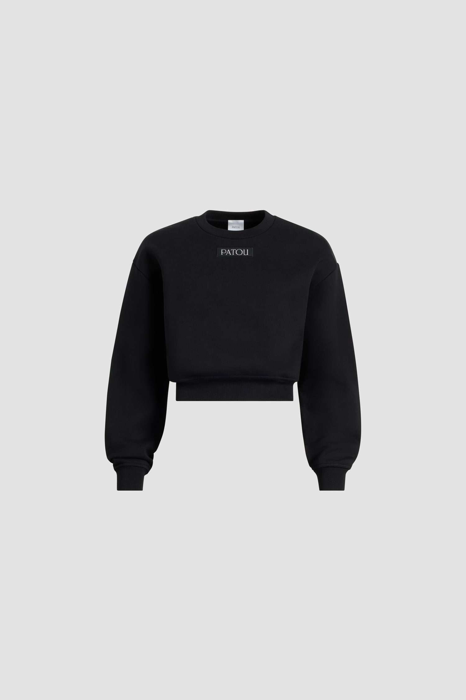 Black organic cotton fleece sweatshirt. Slightly cropped length. Crewneck. Ribbed collar, cuffs and hem. Patou logo label sewn at the front.