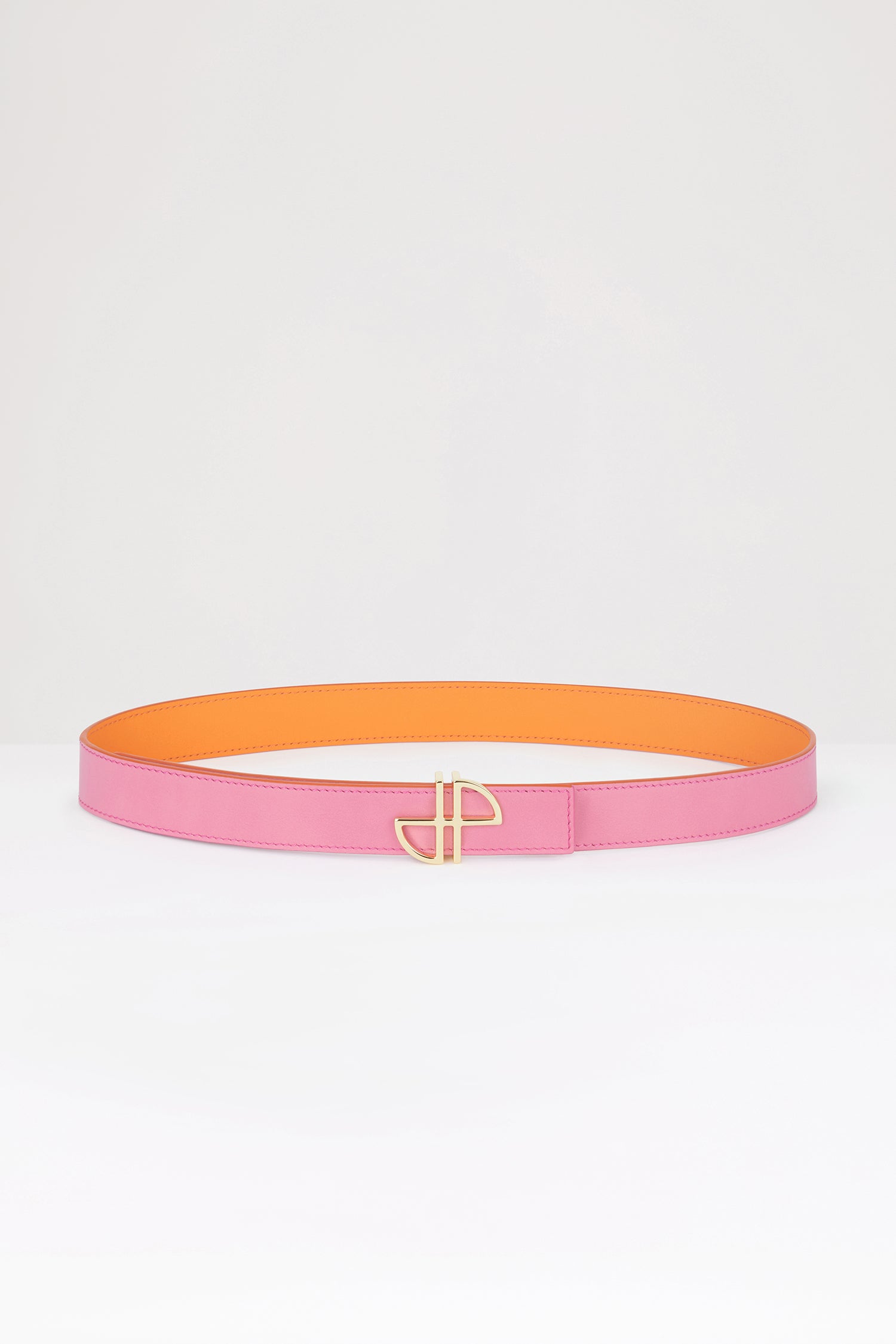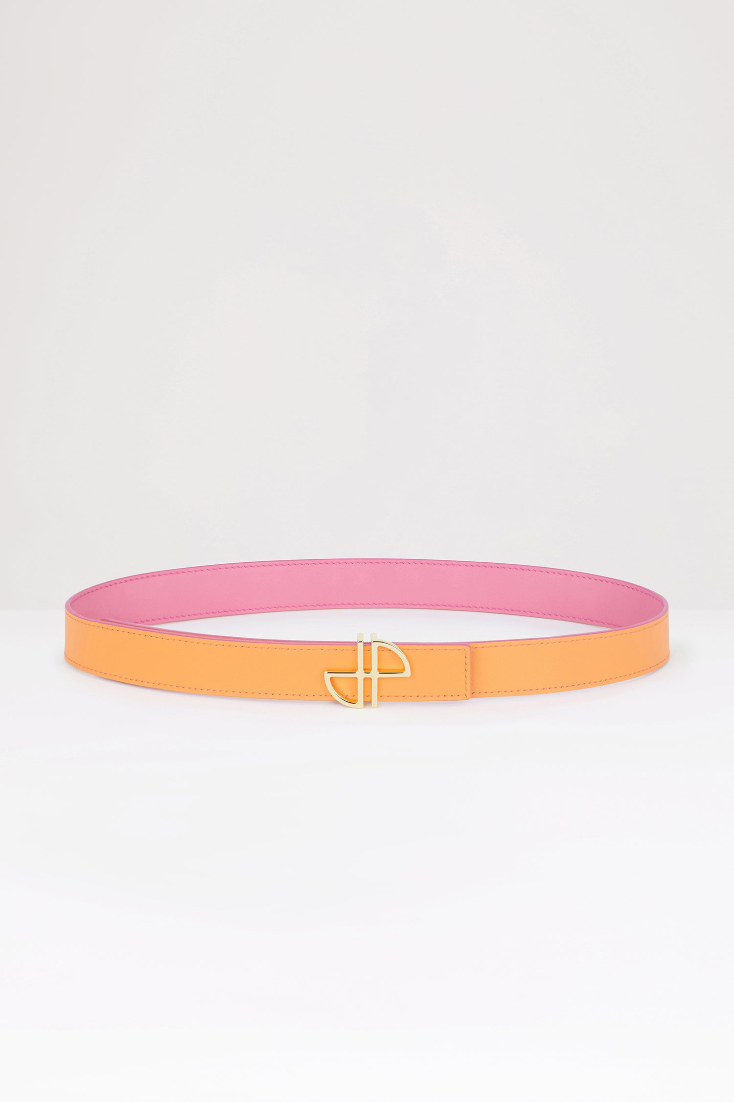 Bright orange leather belt. Partly crafted using unique materials sourced from unused high-quality leather hides. Reversible style. Gold-tone JP buckle. Adjustable design. Push stud fastening.