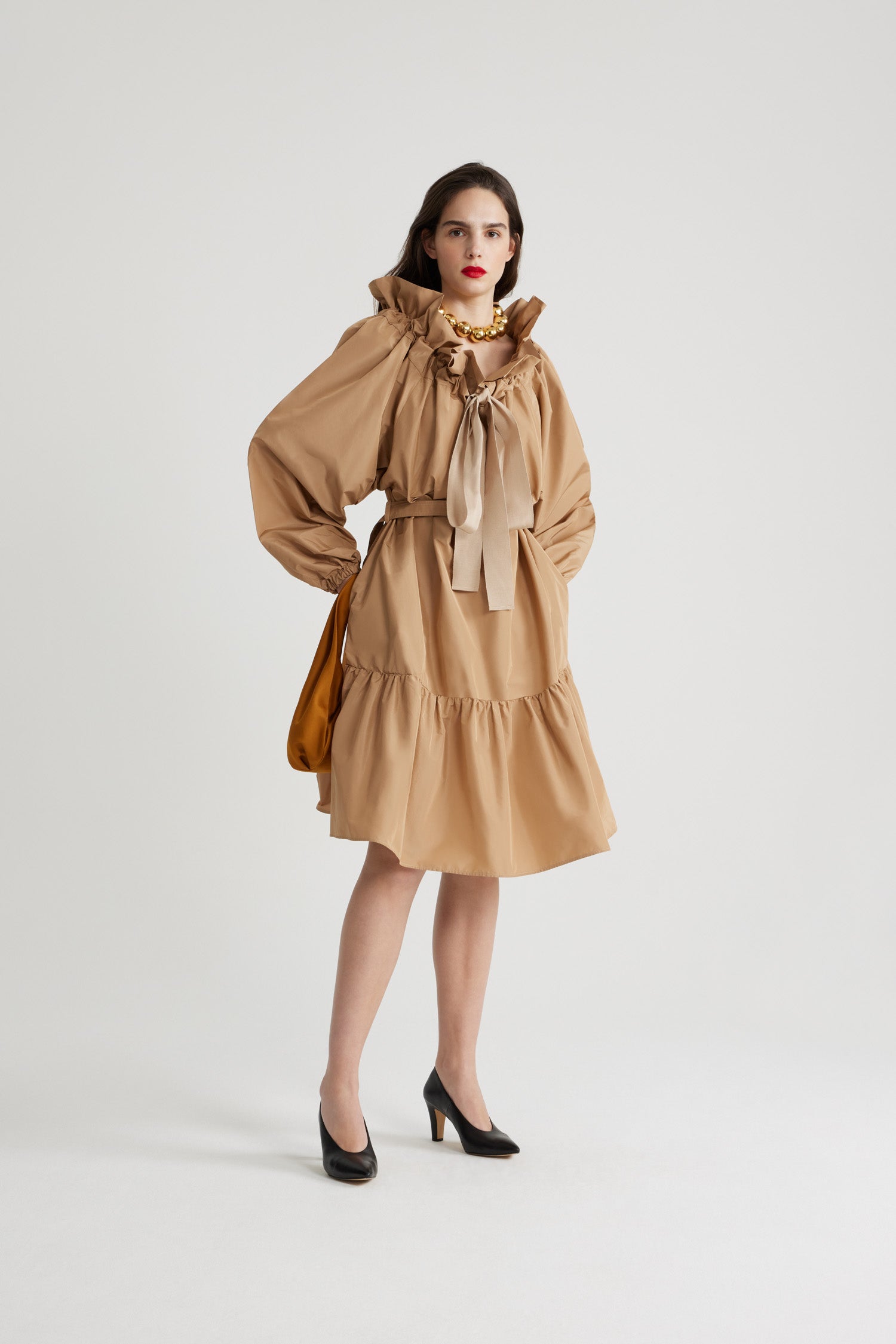 Sand recycled polyester faille dress. Knee length. High volume silhouette. Drawstring collar with flounce at the front and long grosgrain ties; can be worn knotted at the neck or off the shoulders. Batwing sleeves with elasticated cuffs. Removable belt at the waist.