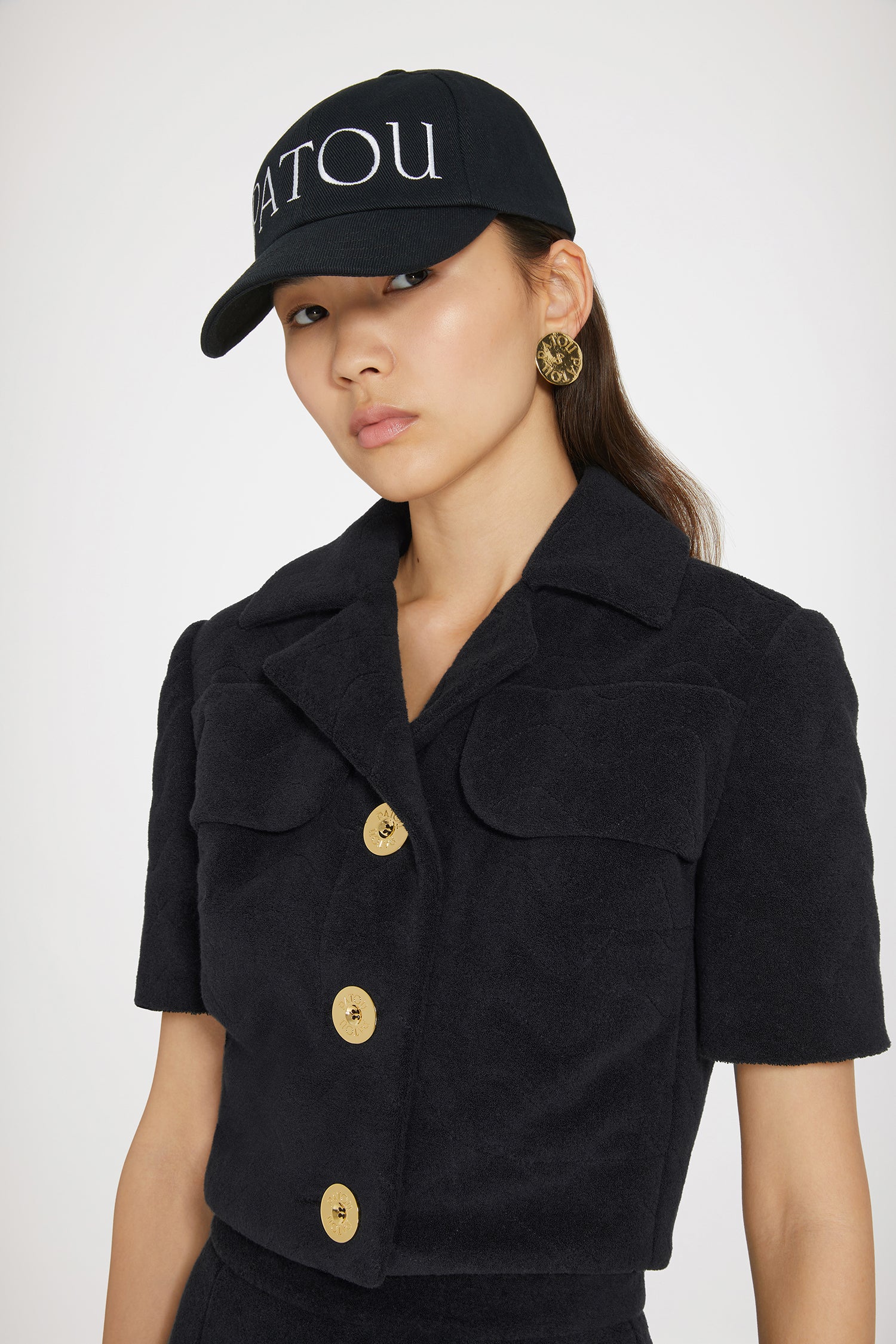 Black jacket. Wave quilting. Cropped length. Fitted silhouette. Notch lapels. Gold-tone Patou-engraved buttons. Flap chest pockets.