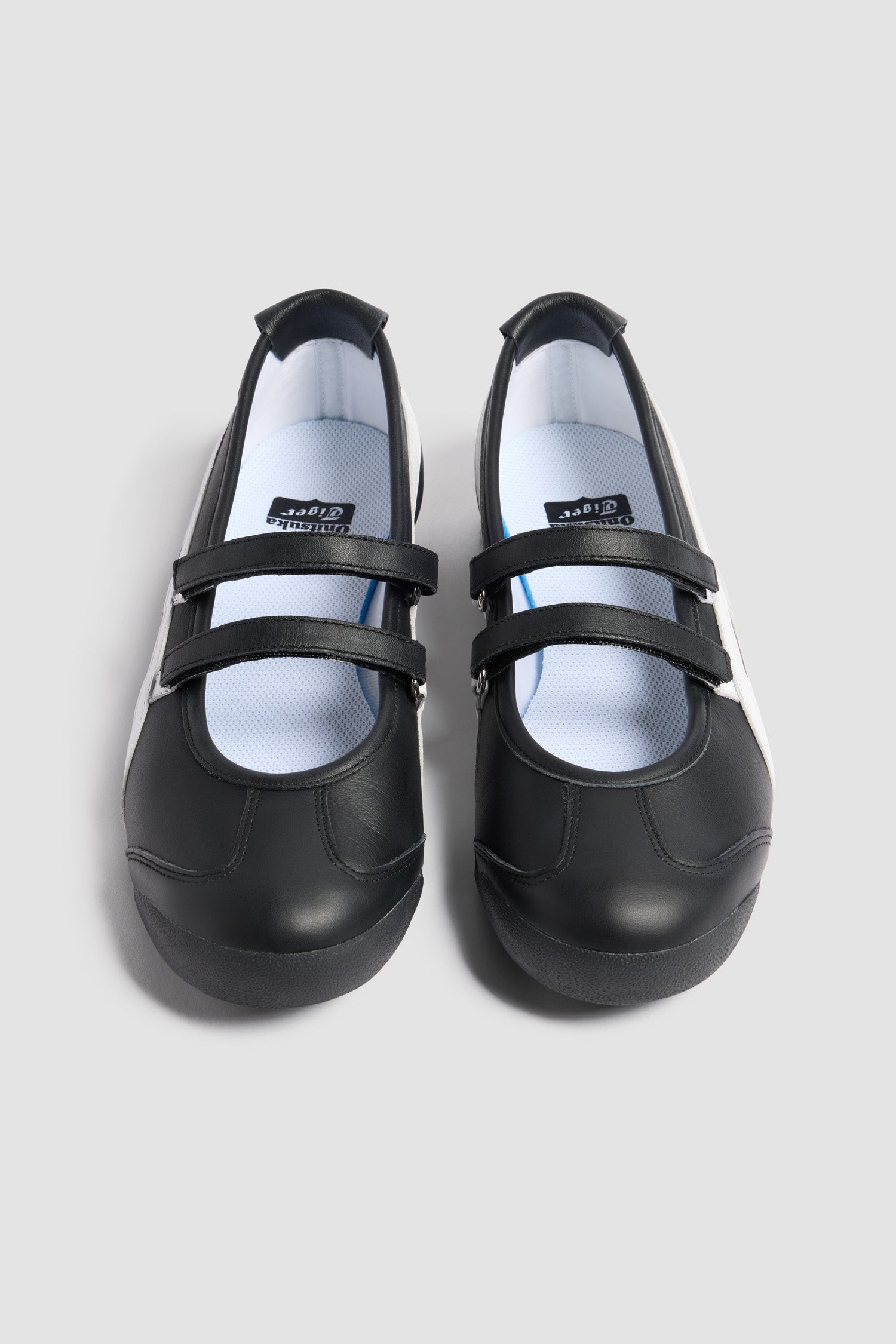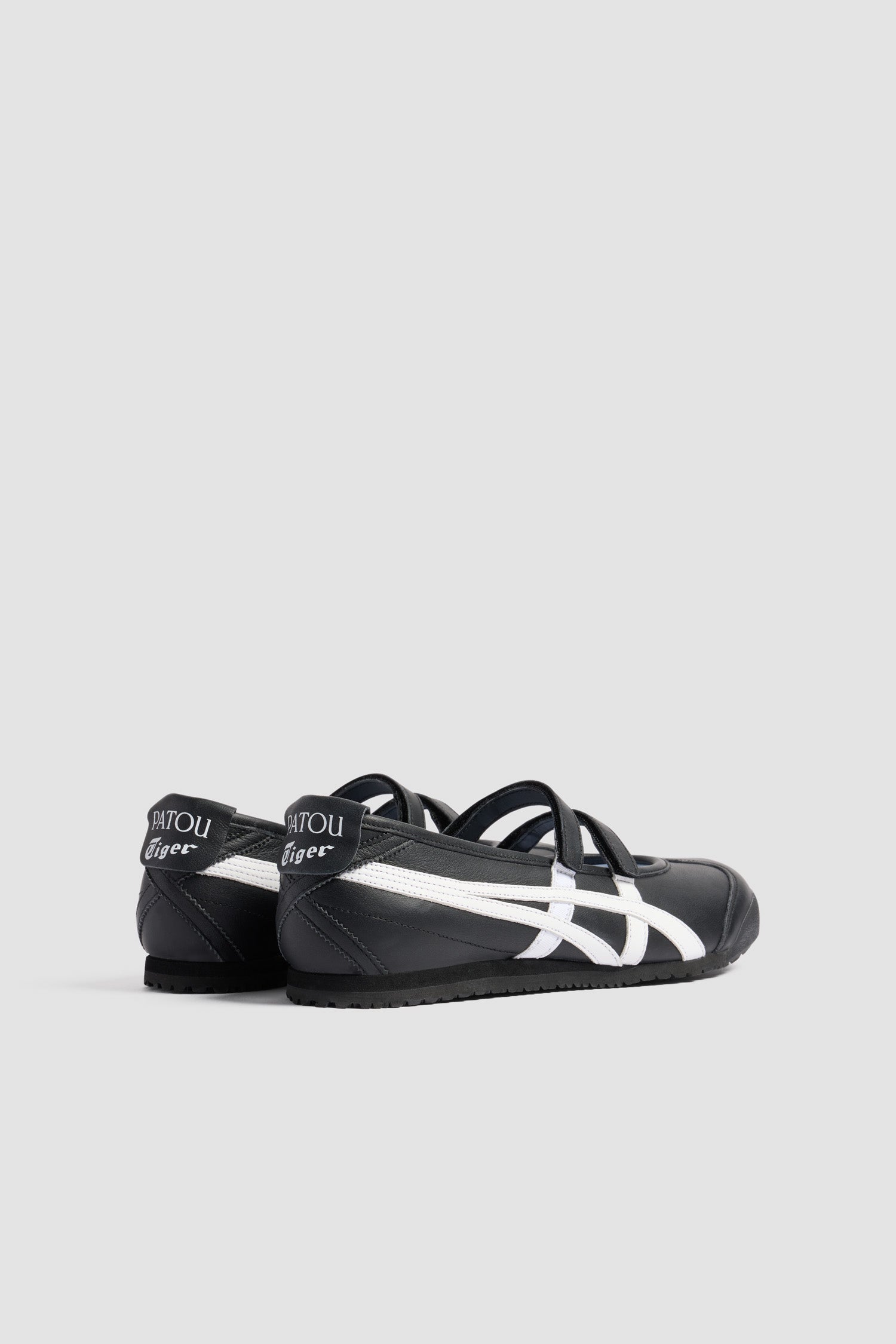 Black nappa ballet flats. Exclusive design by Patou from a special collaboration with Onitsuka Tiger. Signature stripes in contrast leather and grosgrain. Patou and Tiger logos on the heel tab. Slip-on style with two Velcro straps. Tonal rubber sole.