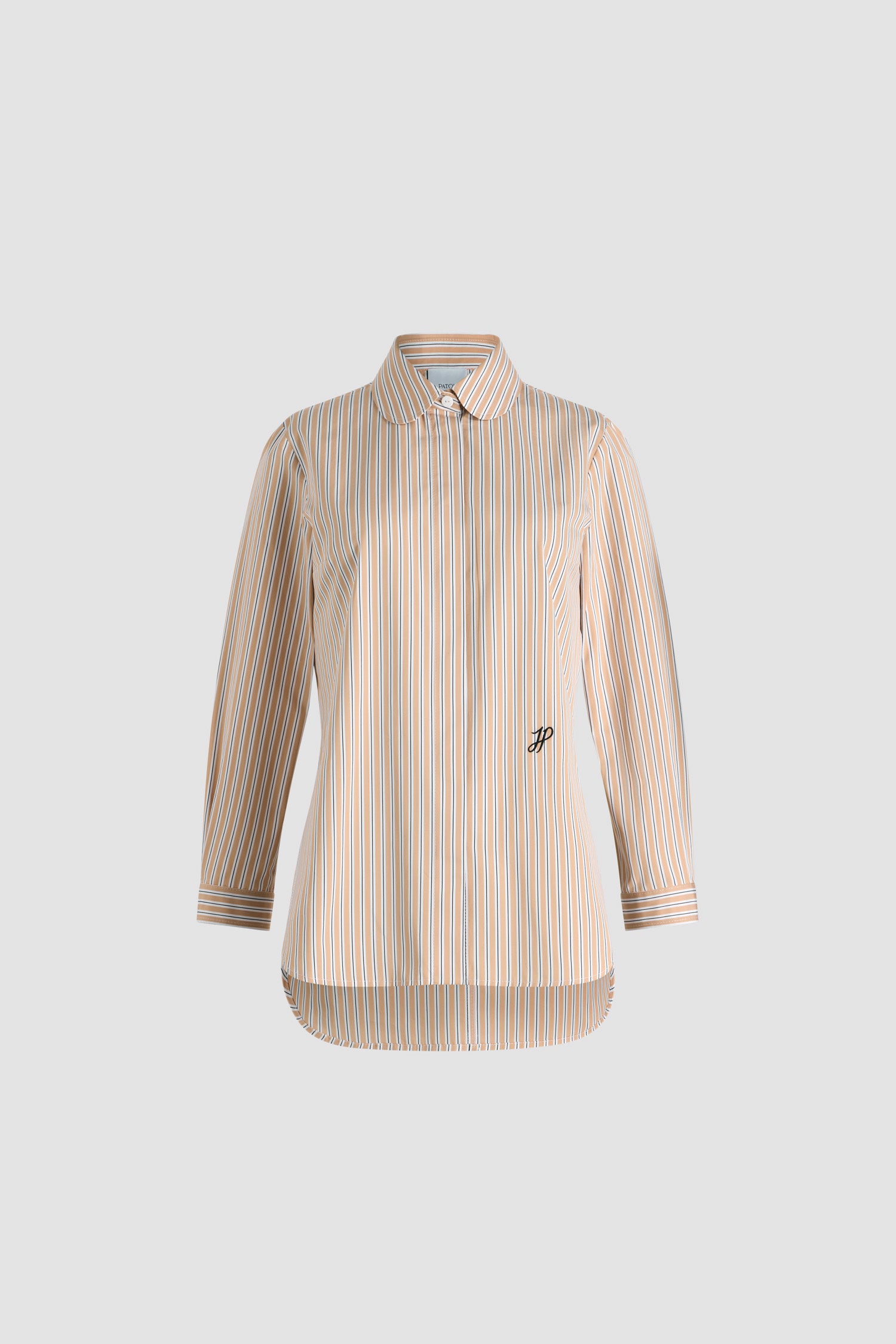 Beige organic cotton poplin shirt. Striped pattern. Peter Pan collar. Concealed button front fastening. Cropped sleeves with buttoned cuffs. Embroidered JP calligraphy monogram at the front. Asymmetric front to back hem.