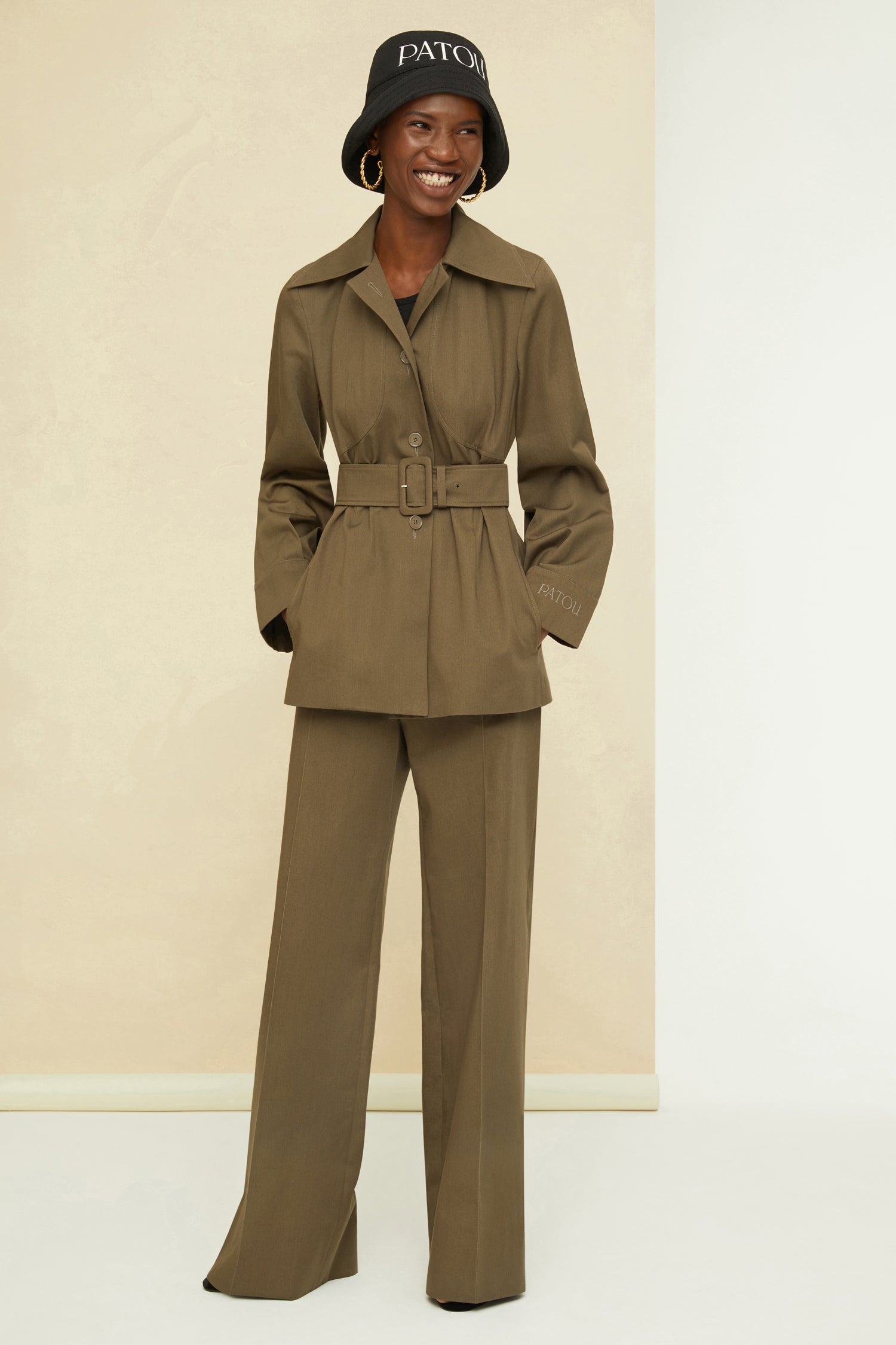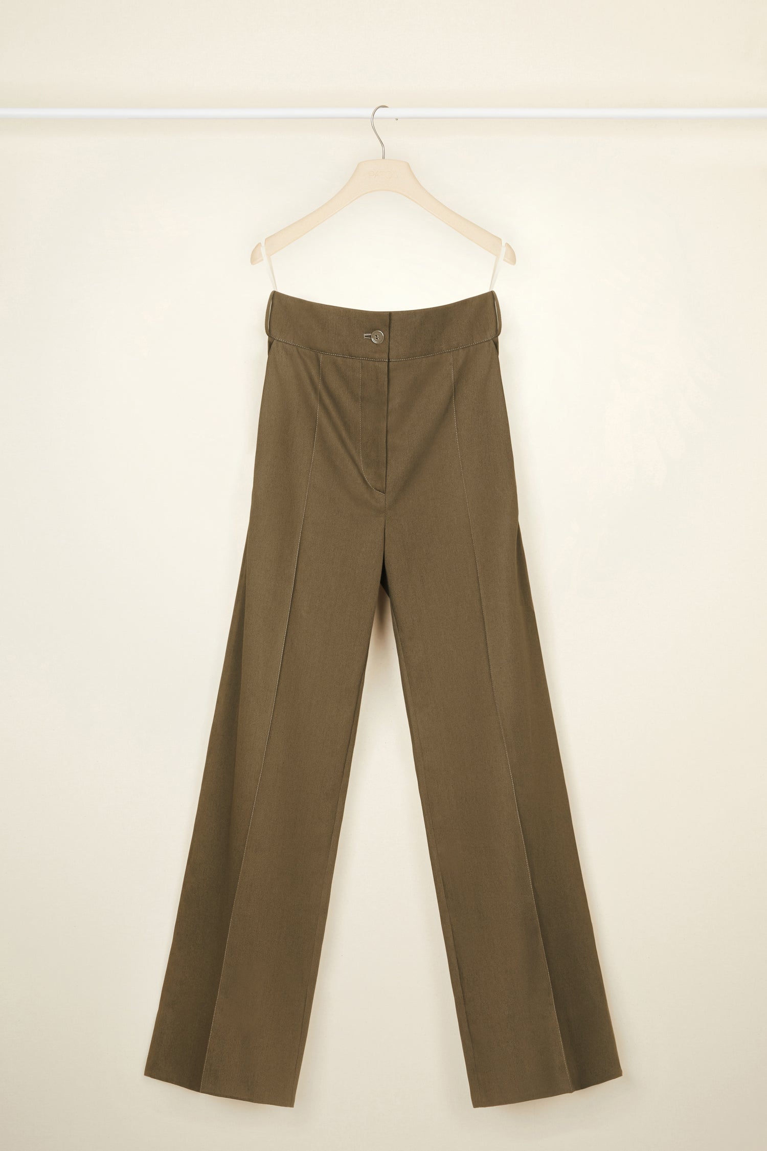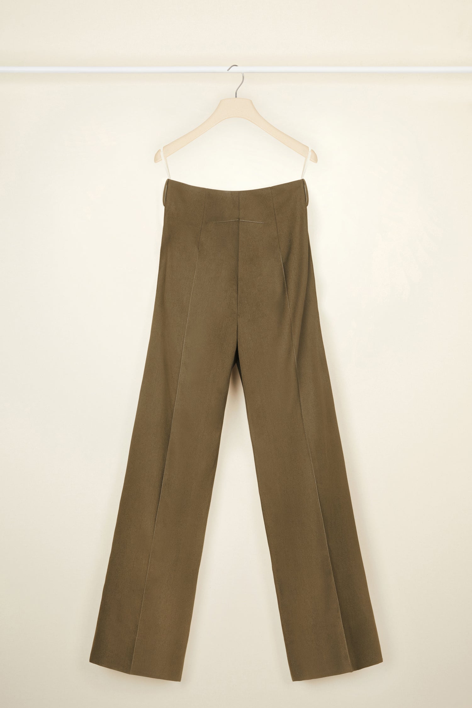 Bronze organic cotton trousers. Long straight leg. Fastens via a single JP-engraved button and zip at the front. Belt loops. Pockets at the sides. Signature curved seam and darts at the back.