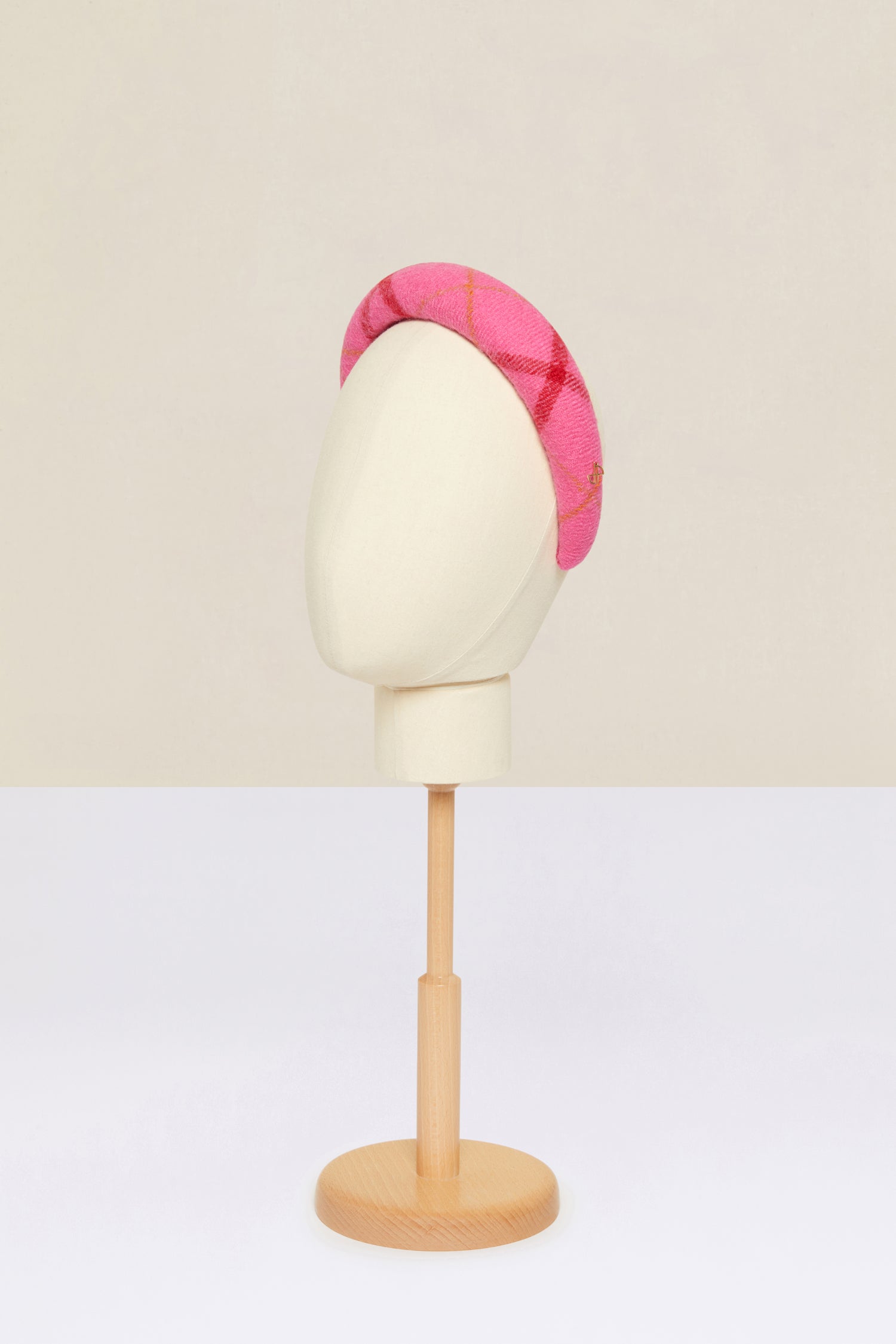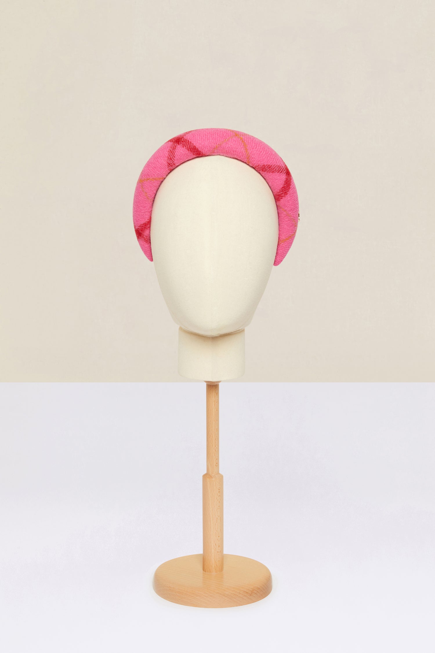 Virgin wool headband featuring a Pink Checkerboard pattern. Thick padded style. Gold-coloured JP logo. Grosgrain-lined underside with embroidered Patou label.