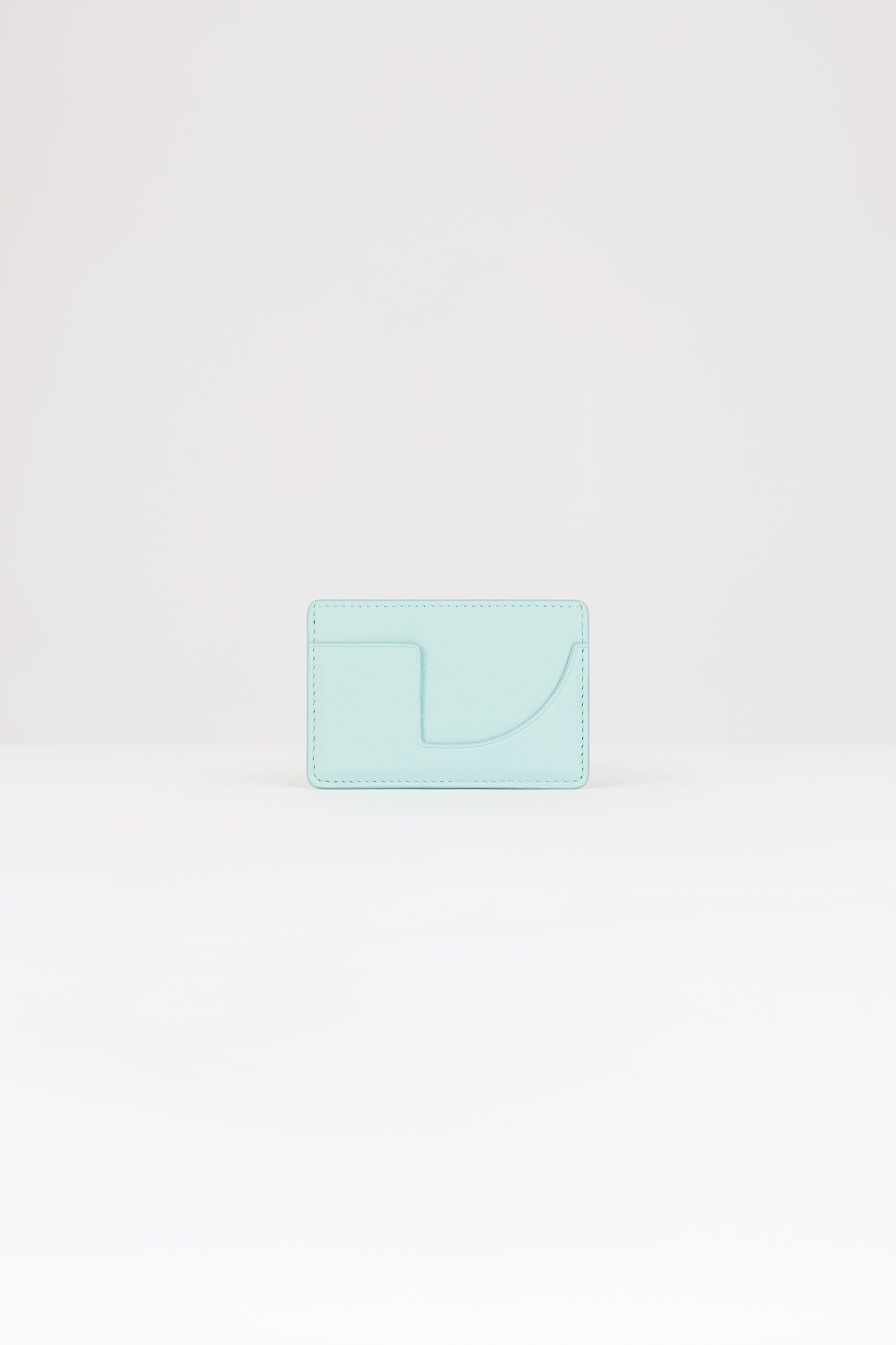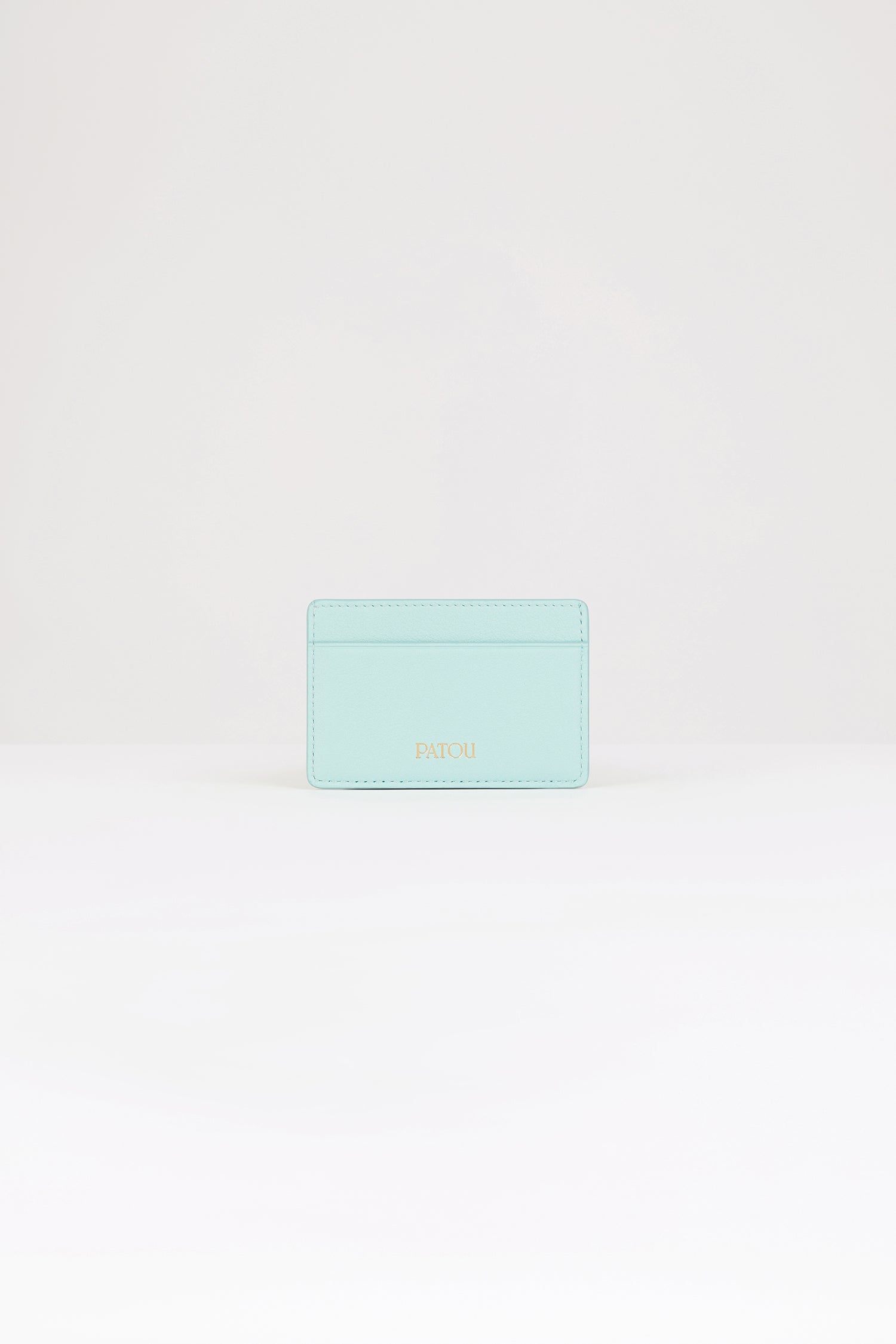 Mint green leather cardholder. Crafted using unique materials sourced from unused high-quality leather hides. Two card slots, central compartment. Gold embossed Patou at the front, cut-out at the back.