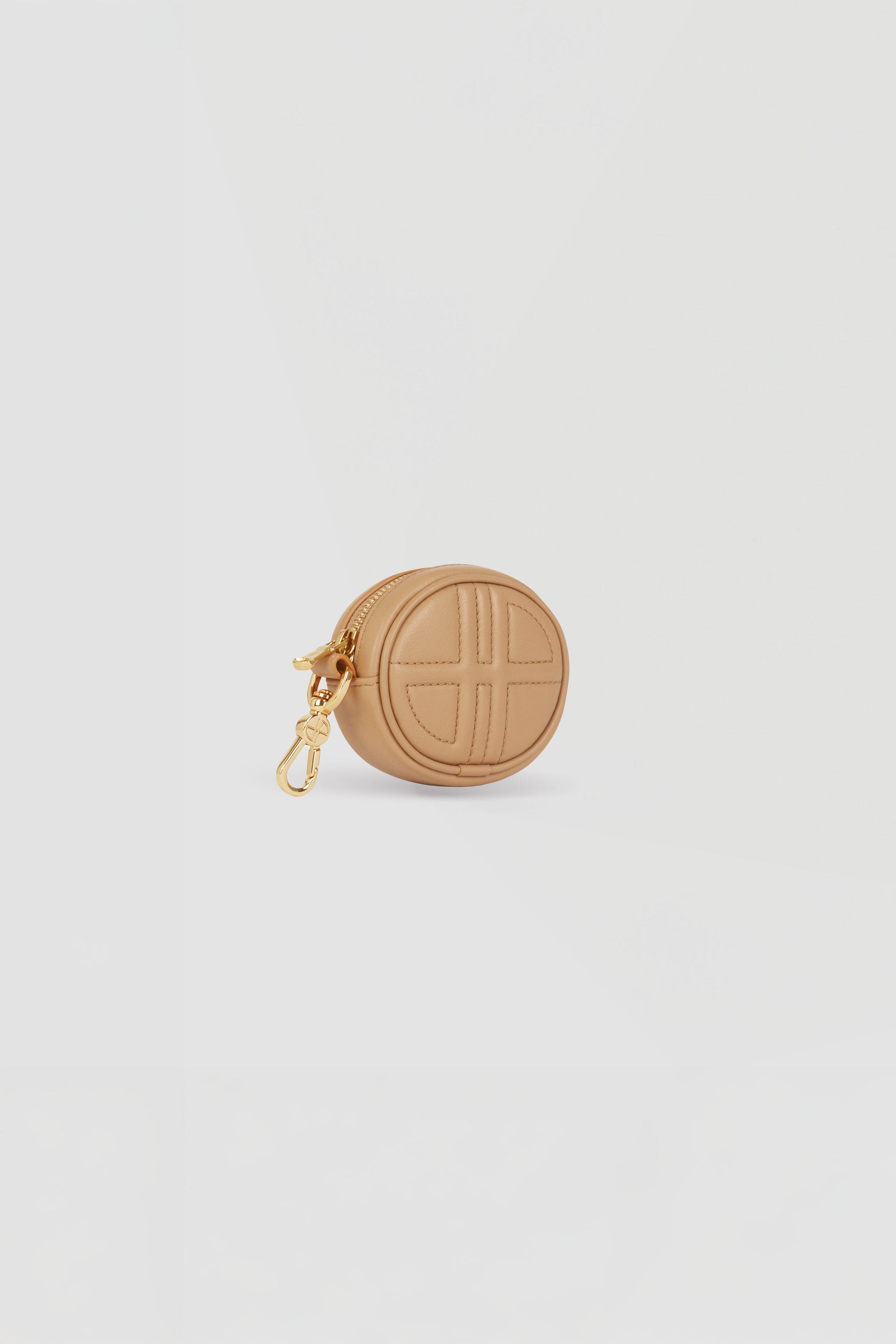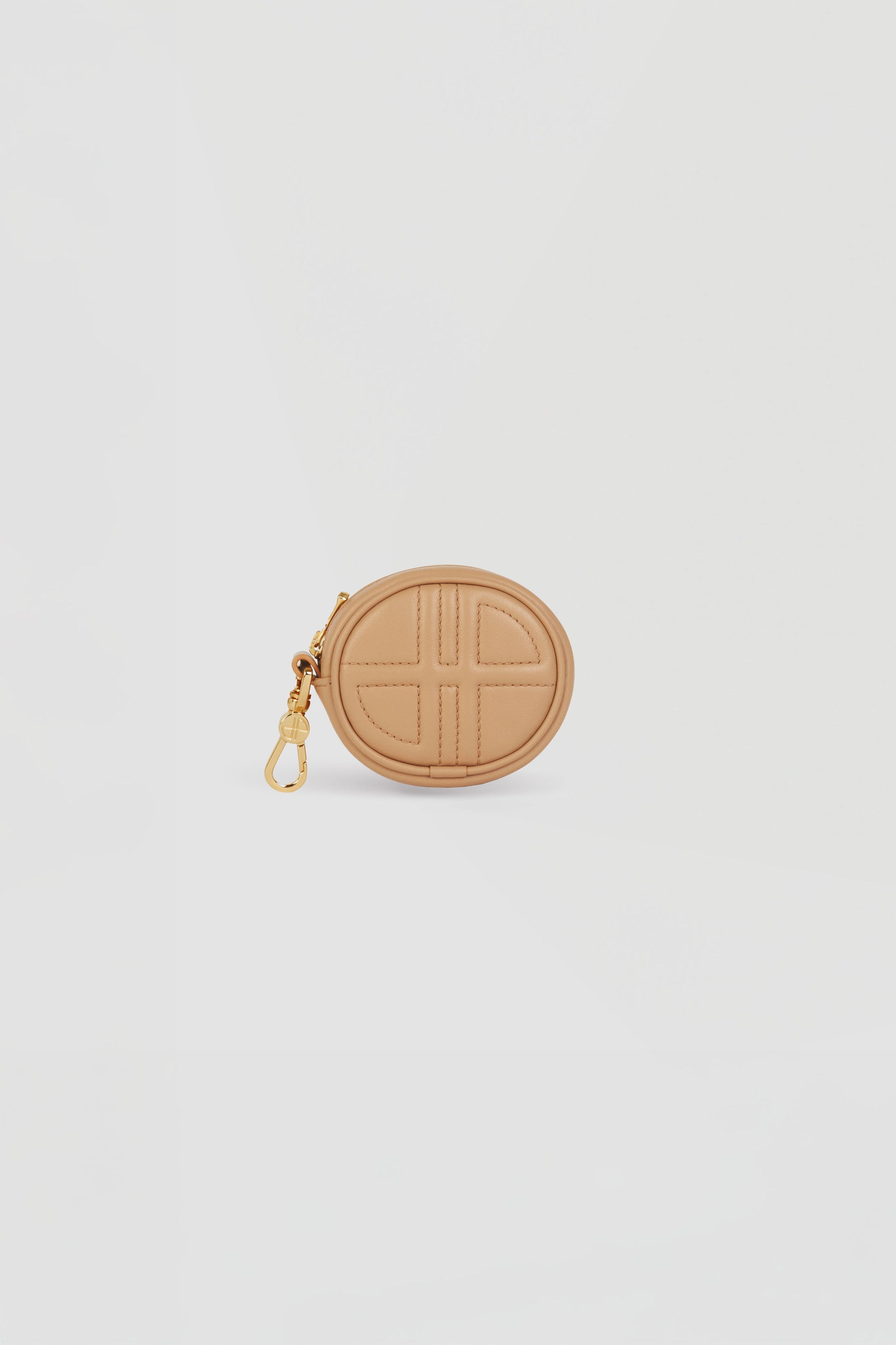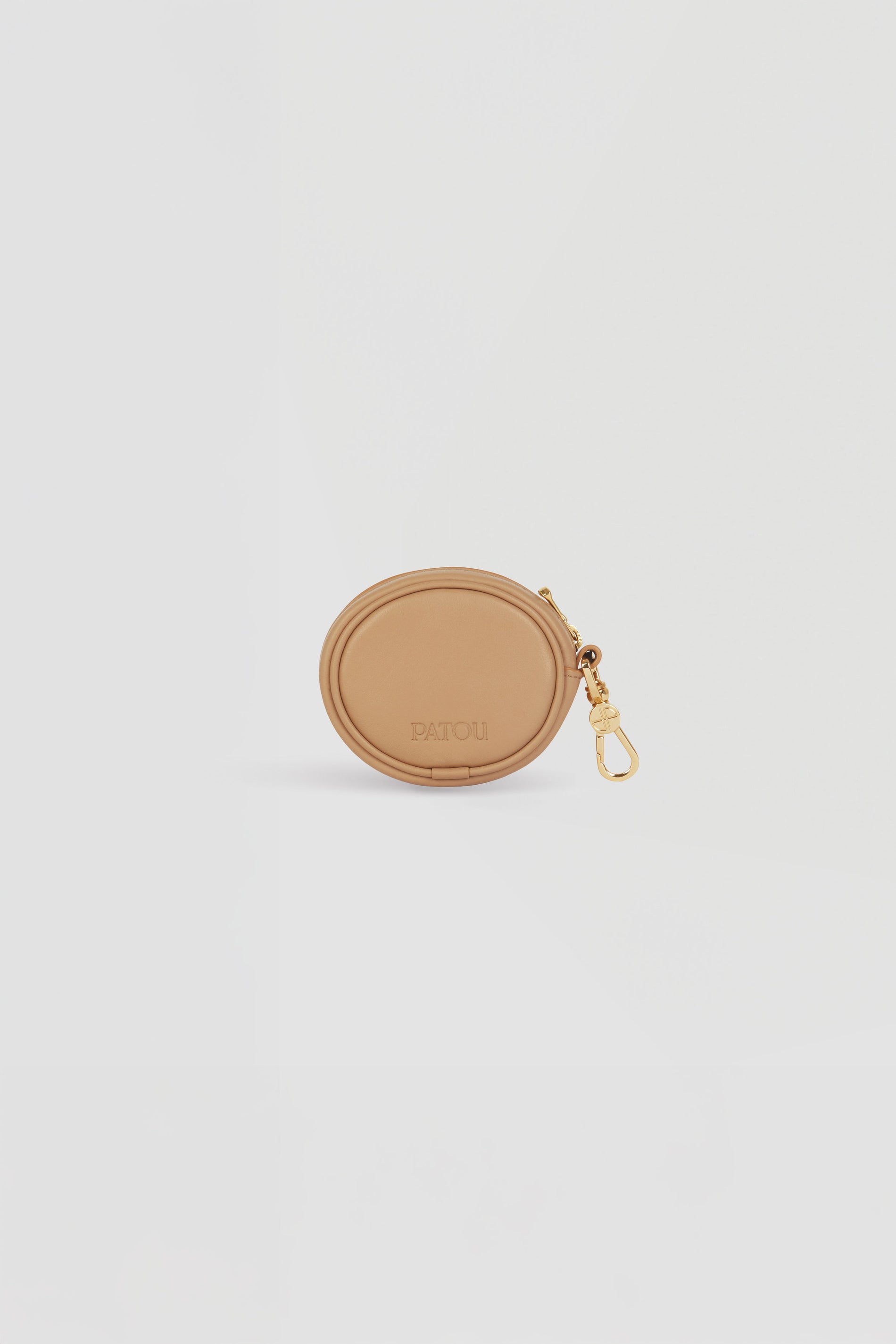 Beige leather pouch. Can be used as a bag charm. Oval shape with a foam-padded 3D JP monogram at the front. Embossed Patou at the back. Zip fastening. Gold-tone hook. Designed to fit wireless earphones.