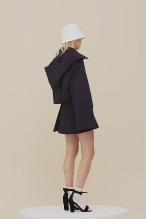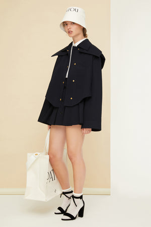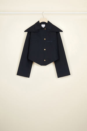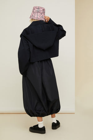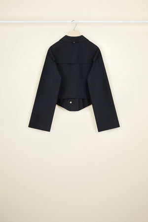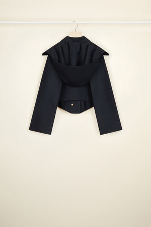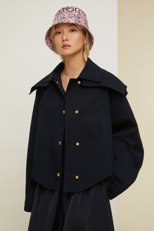 Night blue organic cotton parka. Cropped silhouette. Oversized hood attached to the back via a single button with vareuse-inspired design at the front. Stud button fastening. Large slant patch pockets at the front with embroidered Patou logo. Fully lined.