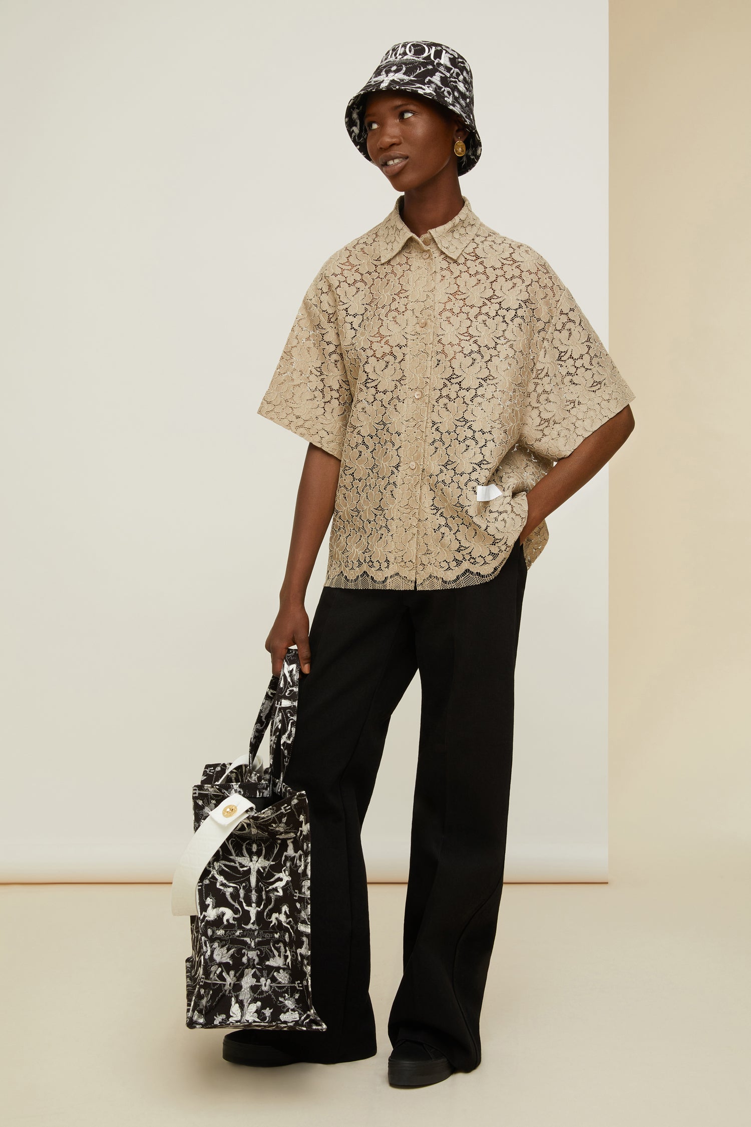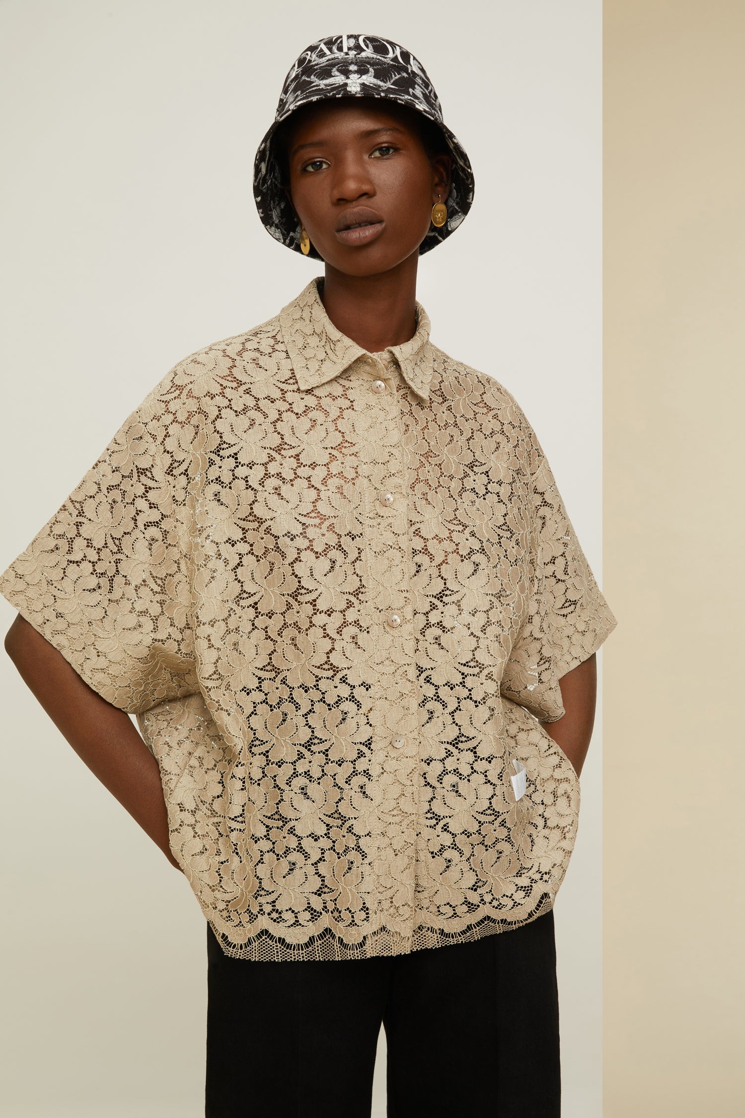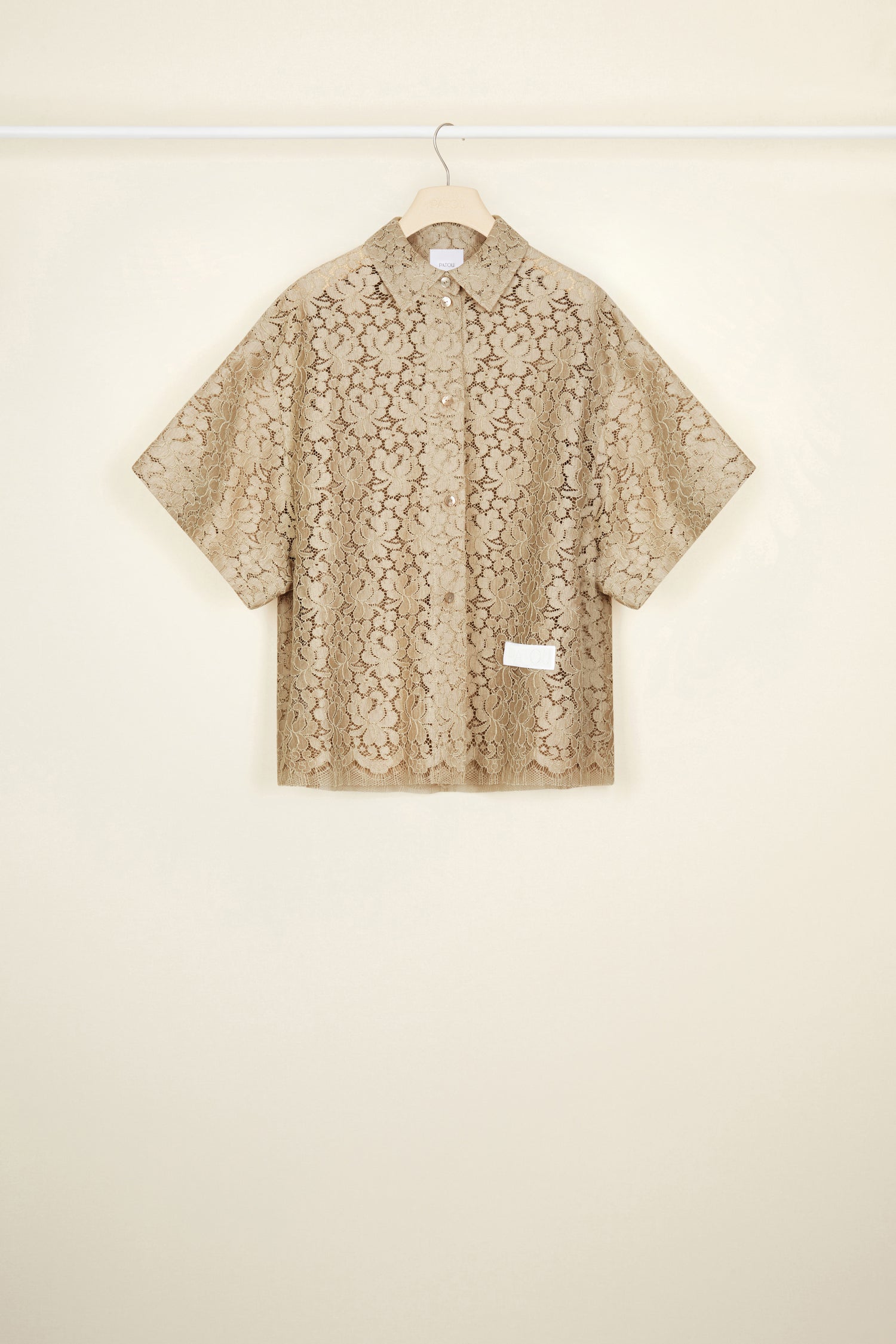 Parchment beige eco-friendly lace shirt. Oversized silhouette. Classic shirt collar. Button fastening with JP engraved buttons. Short sleeves. Embroidered Patou label in white at the front.