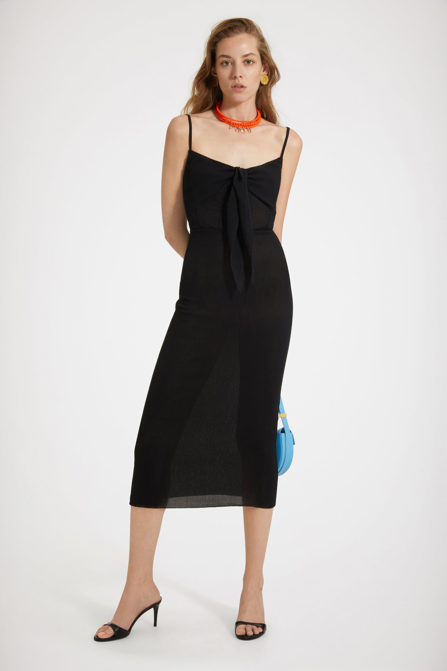 Black organic cotton dress. Lightweight crepe texture that is slightly sheer. Fitted silhouette, Midi length. Adjustable lingerie-style straps. Double layer at the bust with knot detail. Fitted bodice with seams at the front.