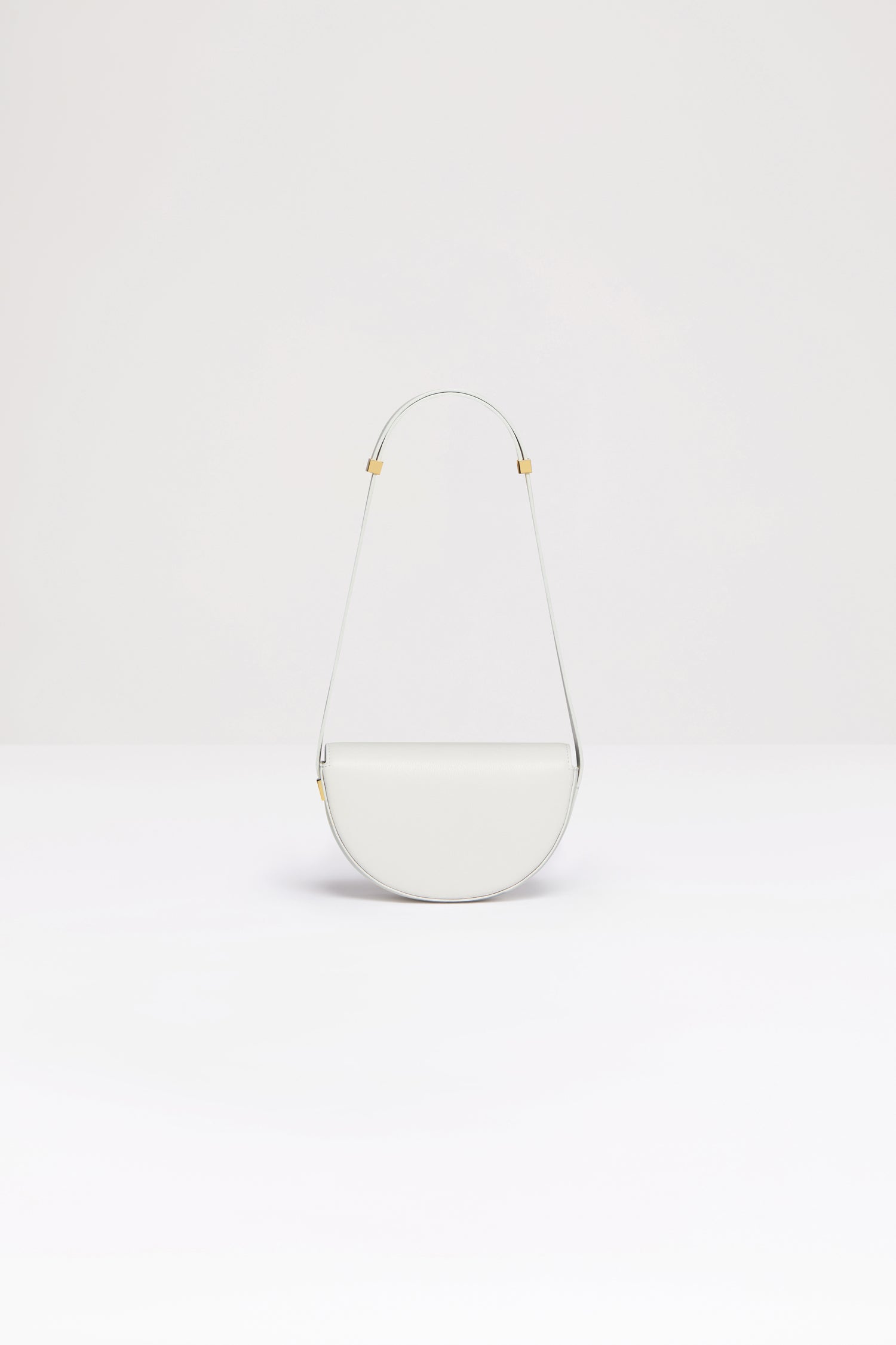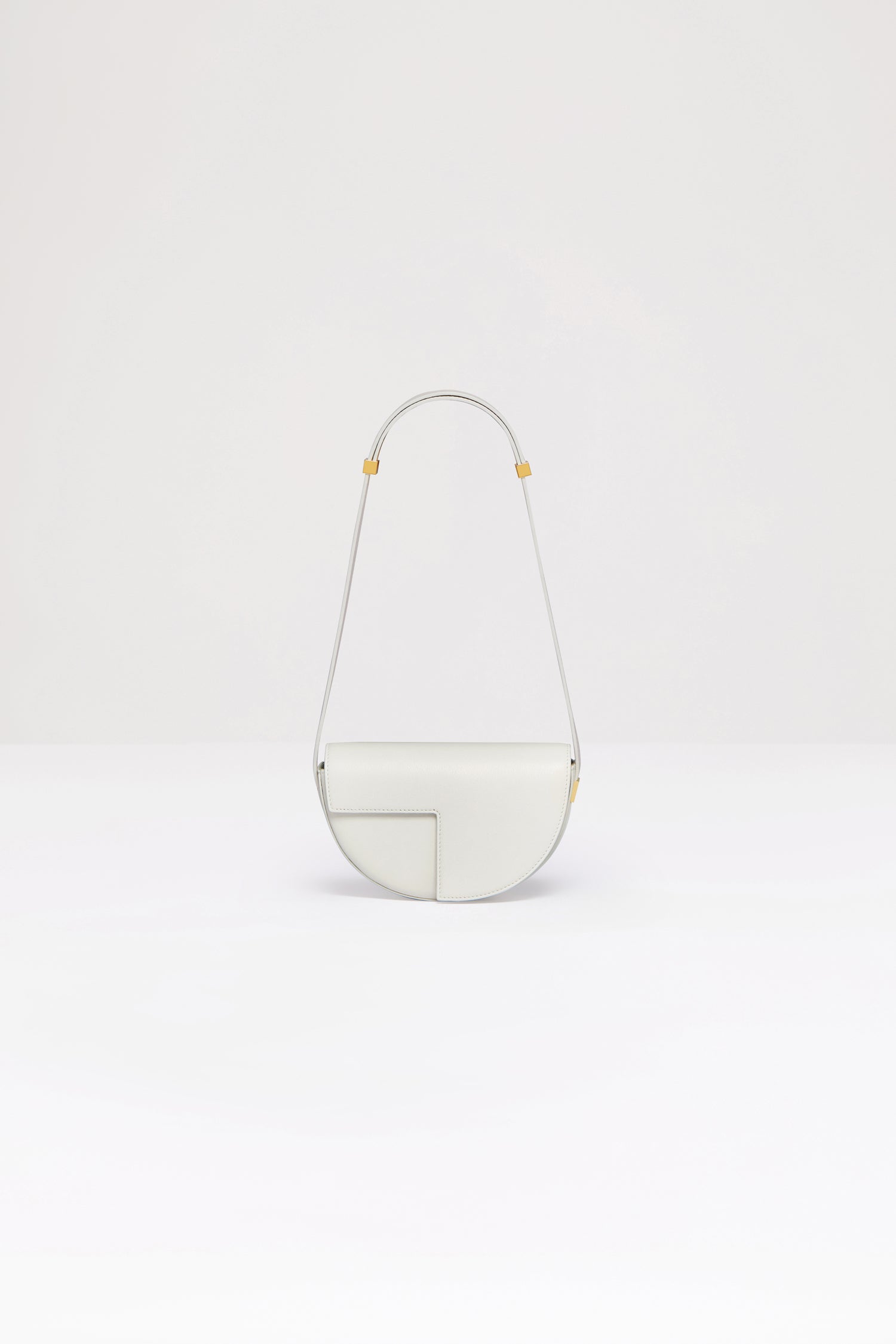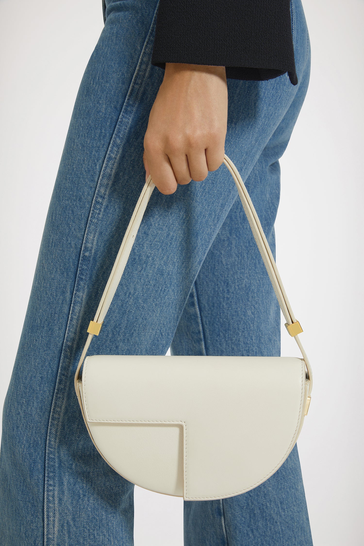 Ivory leather handbag. Crafted using unique materials sourced from unused high quality leather hides. 200 limited numbered edition. Half-circle shape with geometric cut-outs inspired by the JP monogram. Gold-tone hardware with JP monogram detail at the side. Adjustable strap that allows it to be worn on the shoulder, across the body or carried by hand. Magnetic closure with gold-tone JP detail. Multiple compartments inside. Eco lining.