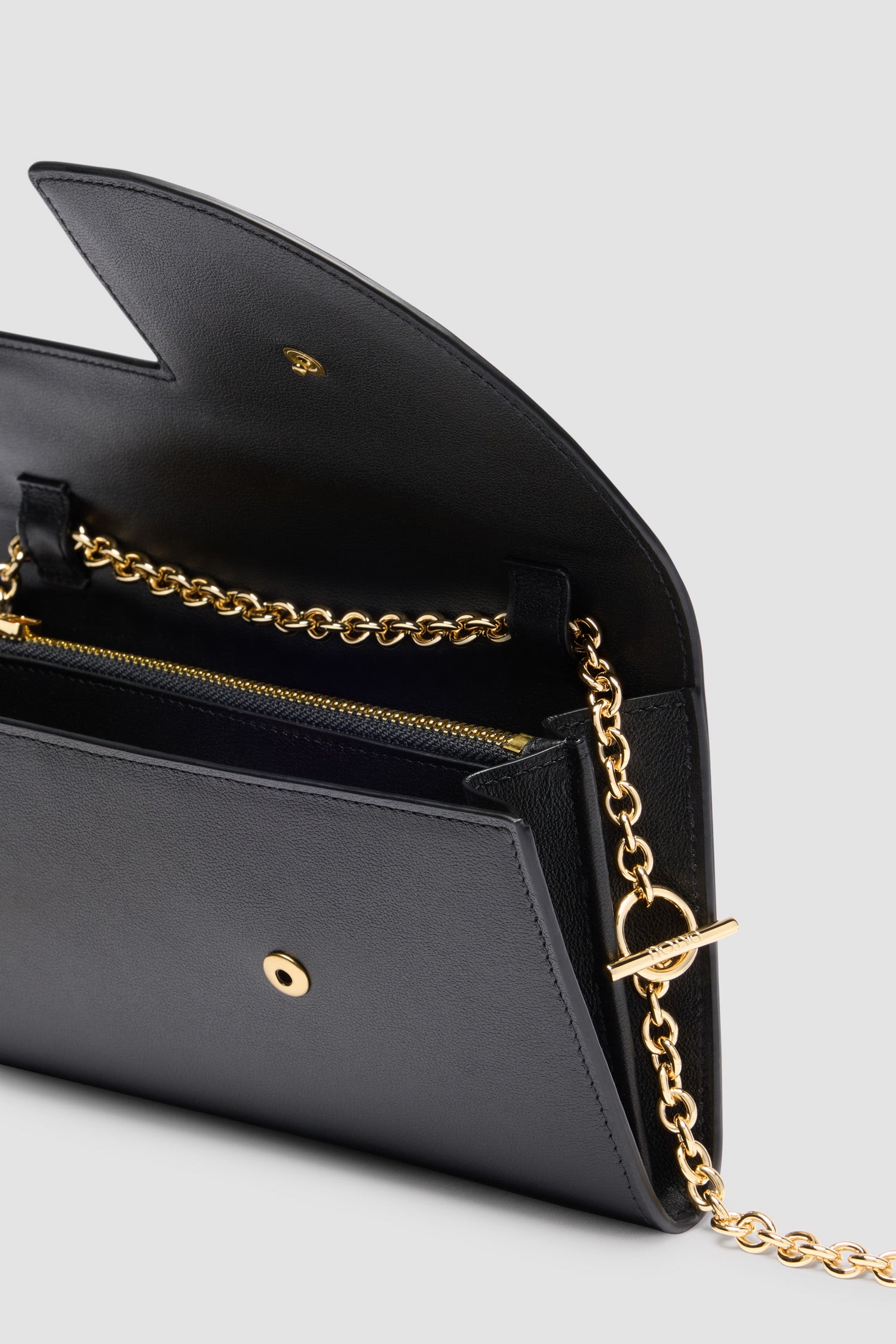 Black leather clutch. Crafted using unique materials sourced from unused high-quality leather hides. Compact design. Gold-tone chain strap. Cut-out flap with gold-tone JP embellishment. Snap closure. Zipped compartment. Gold embossed Patou at the back.