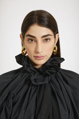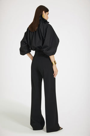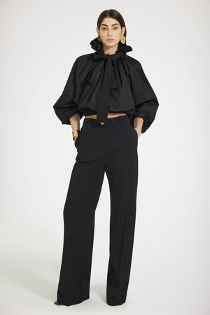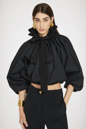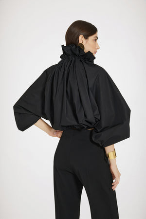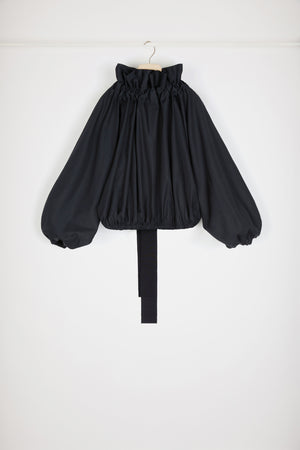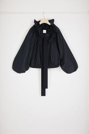 Total Eclipse black organic cotton top. High volume silhouette that can be worn knotted at the neck or off the shoulders. Drawstring collar with flounce at the front and long grosgrain ties. Batwing sleeves with elasticated cuffs. Elasticated waist.