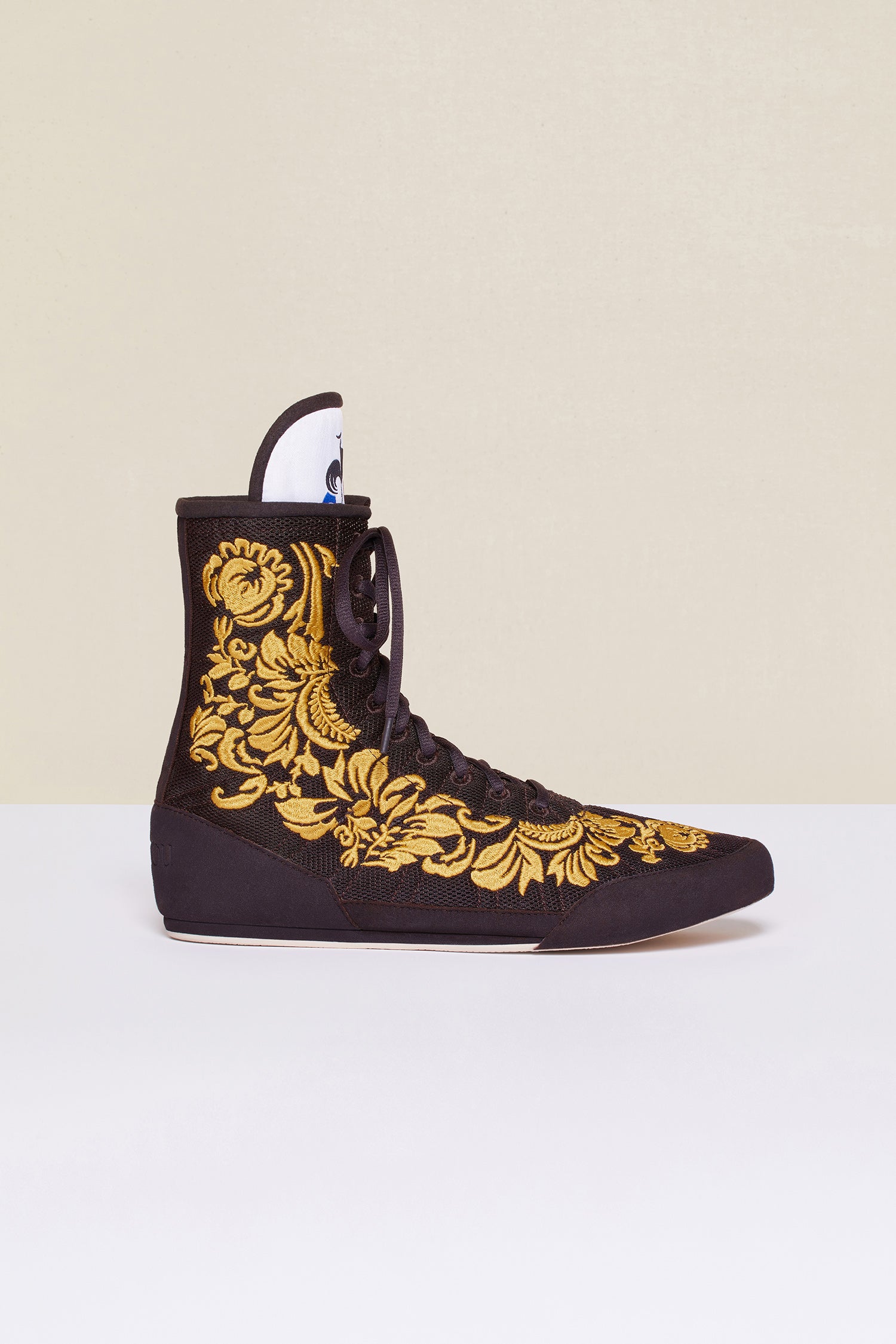 Ongoing collaboration between Patou and Le Coq Sportif. Brown high-top trainers inspired by classic boxing shoes. Gold floral embroideries. Patou logo engraved on the heel. Original Le Coq Sportif logo on the tongue. Flexible rubber sole with embossed Patou logo.