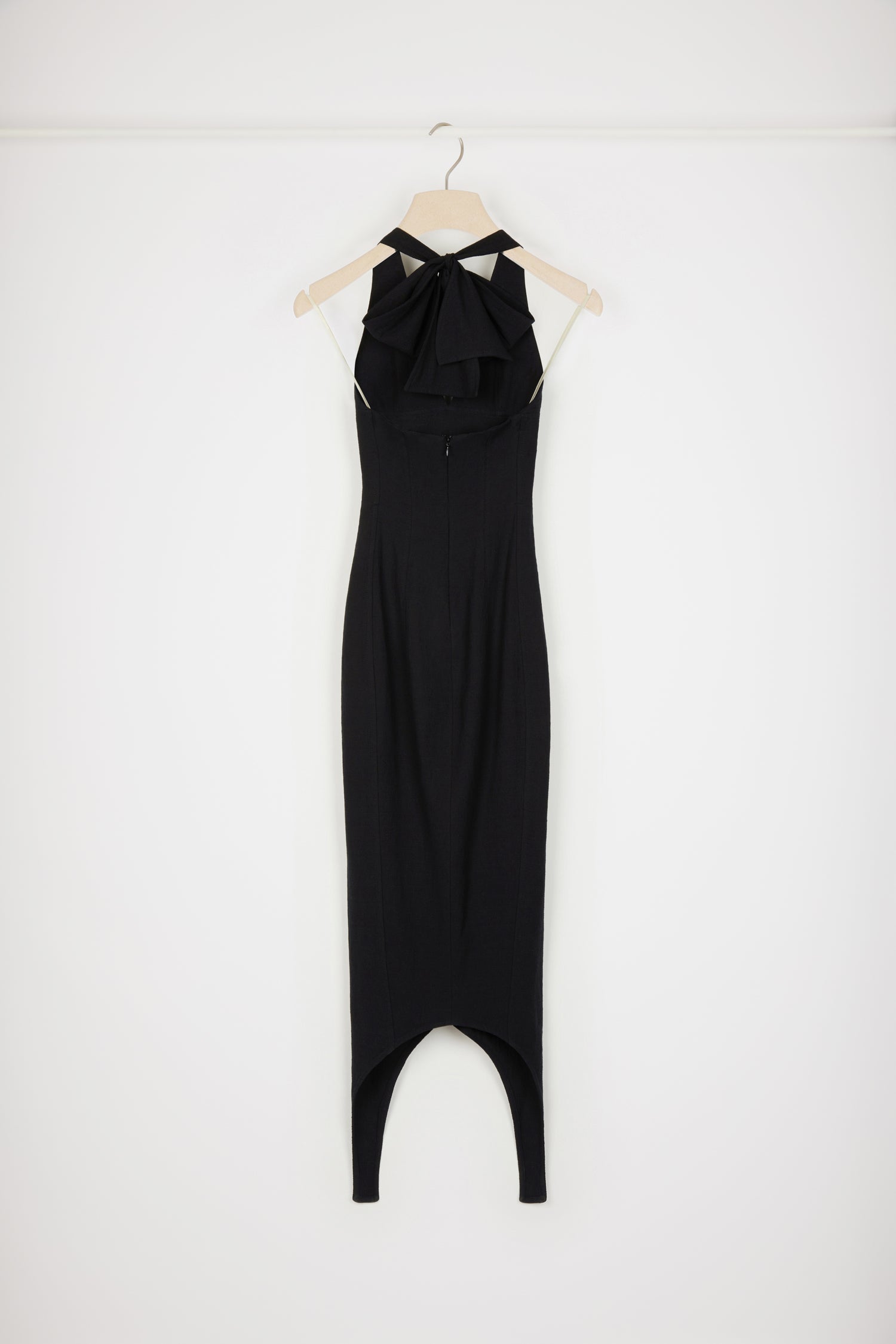 Black eco-viscose and organic cotton blend dress. Midi length. Fitted style. Halterneck collar with maxi bow at the back. V neckline. Zip fastening at the back. Asymmetric curved hem.