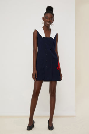 • Patou - Sailor summer wool dress - Navy - A nautical moment in navy, white, red and gold.Navy summer wool dress. Sleeveless style. Square neckline with a removable white poplin sailor-style collar. Two rows of buttons at the front. Two large patch pockets. Embroidered JP logo in red. Martingale at the back attached by gold-coloured buttons.