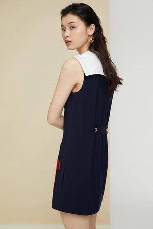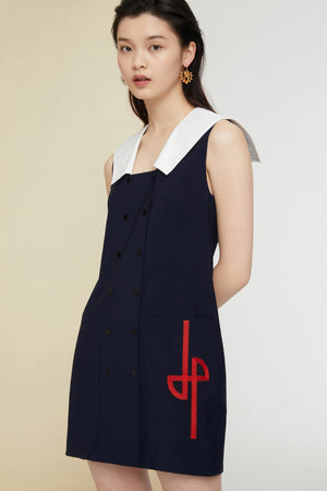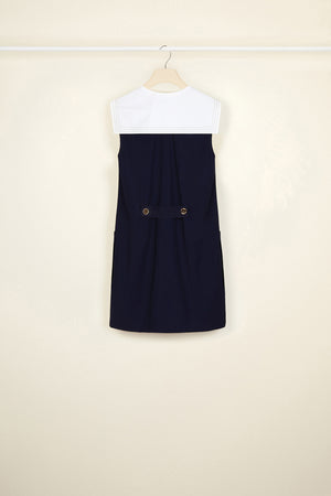 Navy summer wool dress. Sleeveless style. Square neckline with a removable white poplin sailor-style collar. Two rows of buttons at the front. Two large patch pockets. Embroidered JP logo in red. Martingale at the back attached by gold-coloured buttons.