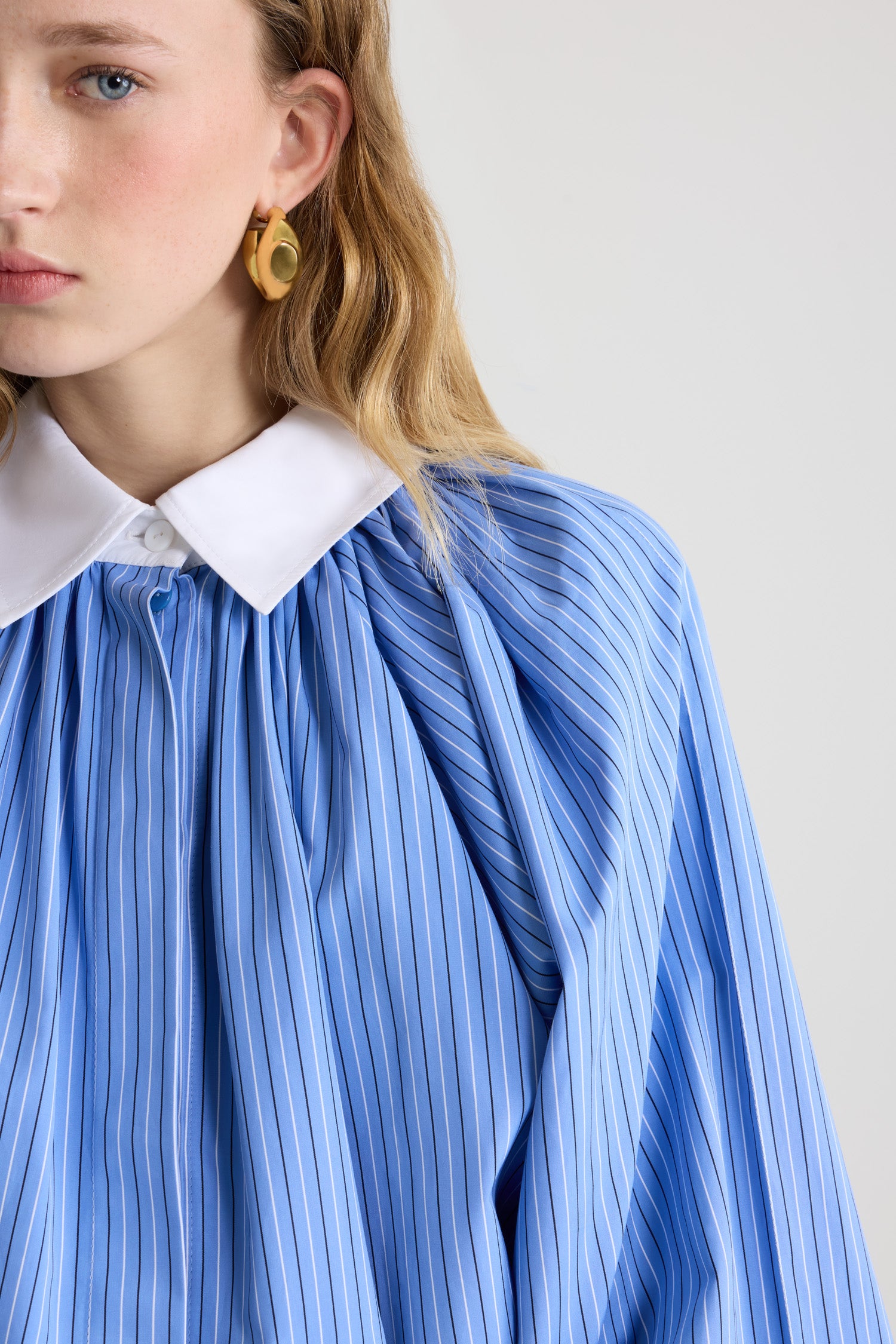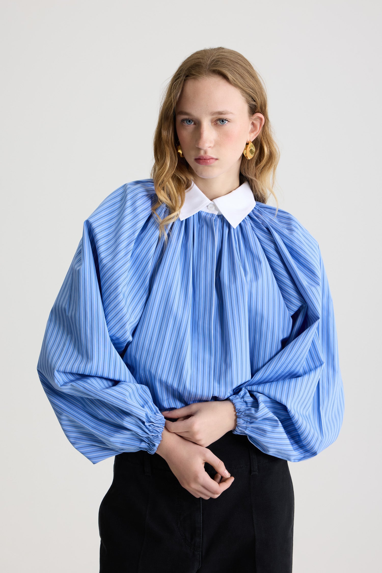 Ice Blue organic cotton blouse. Striped pattern. Volume silhouette. Slightly cropped length. Classic contrast collar. Concealed button front fastening. Balloon sleeves with elasticated cuffs. Bubble hem.
