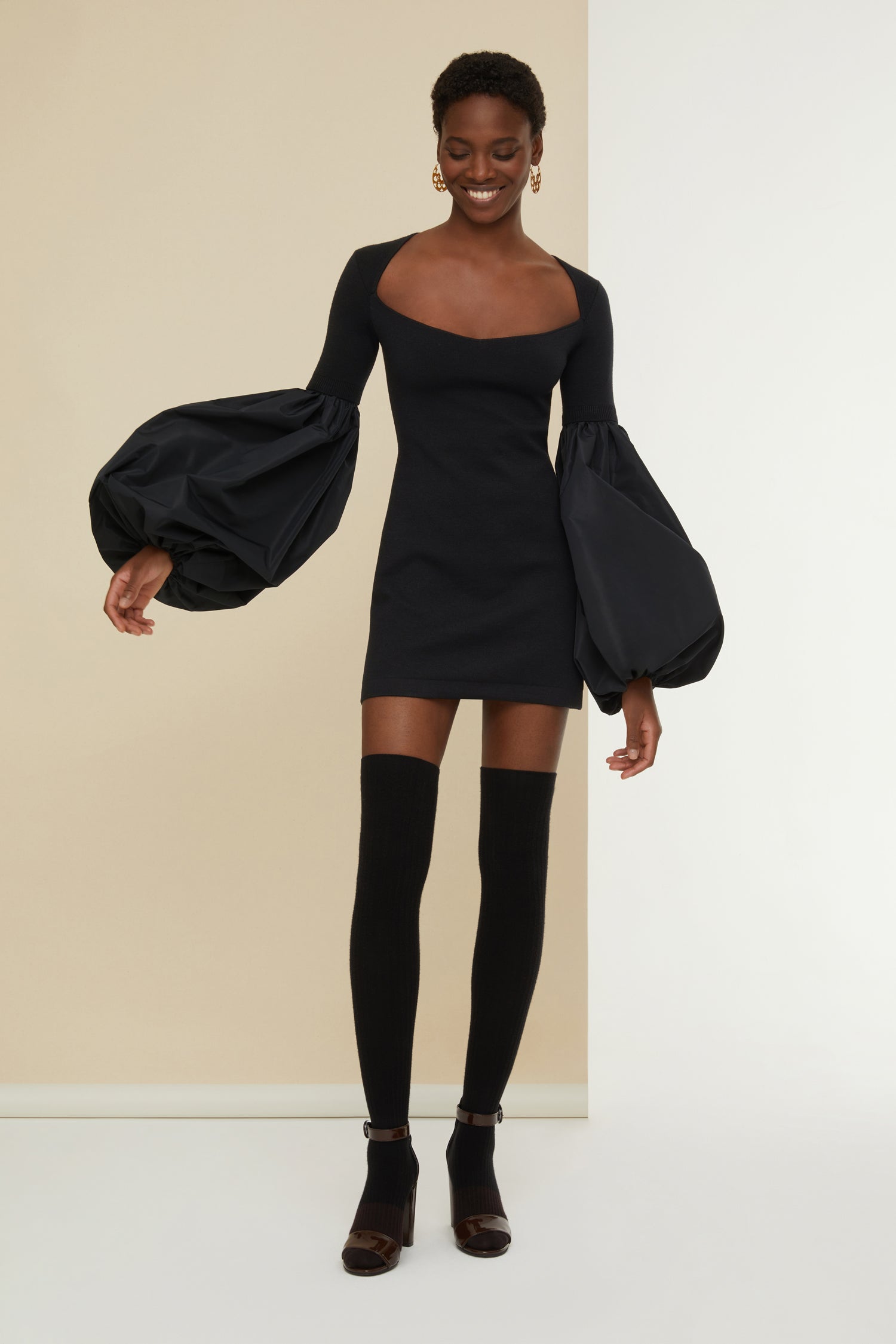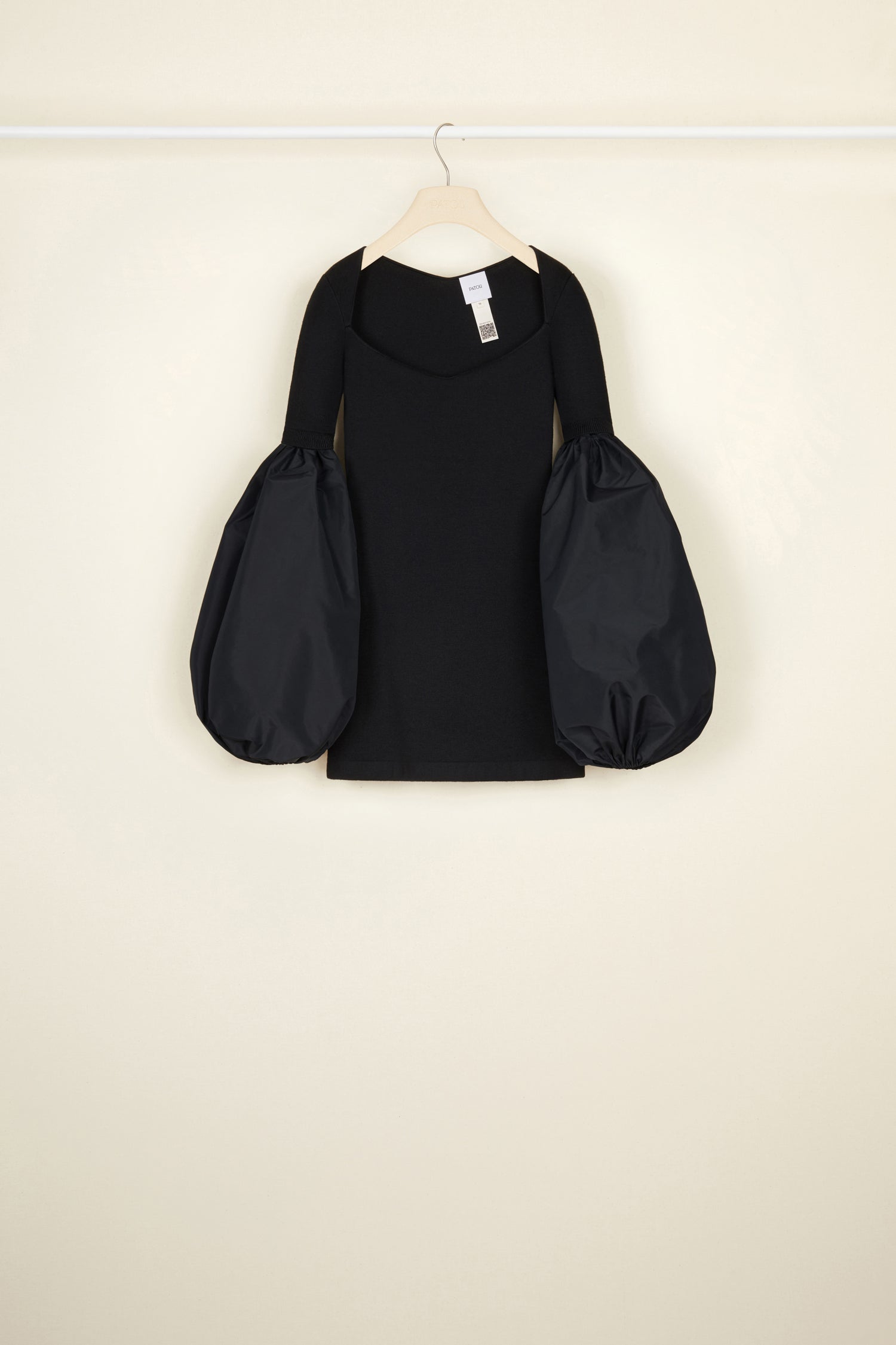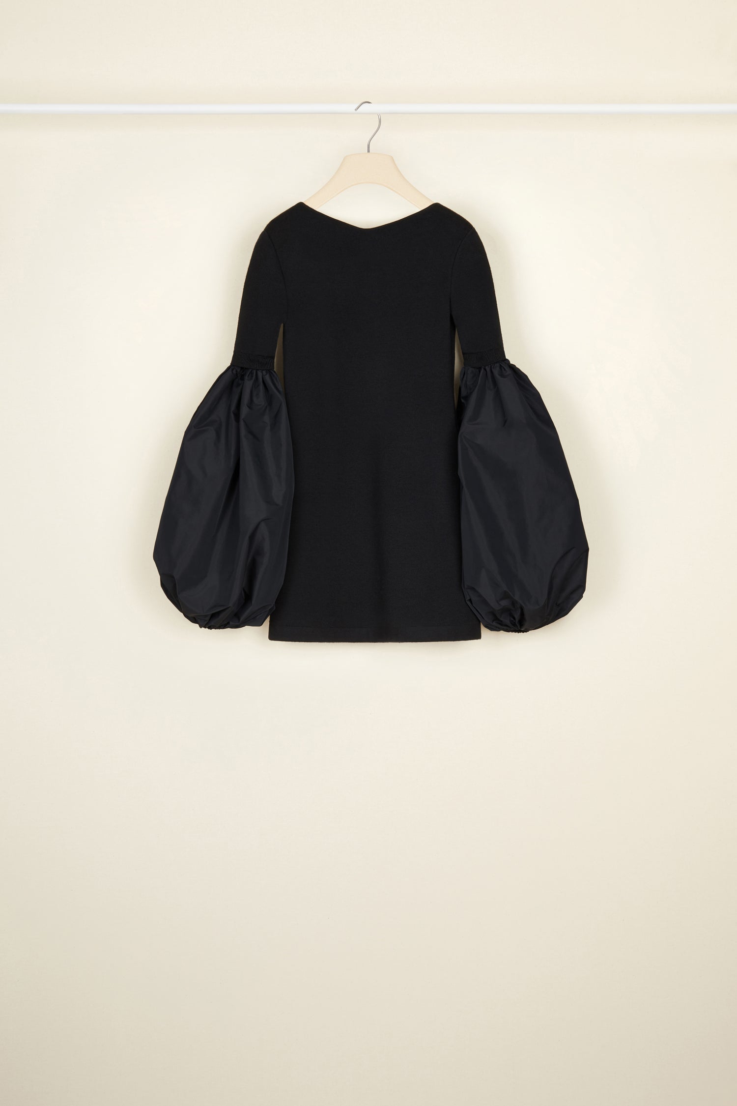 Black knit mini dress. Fitted silhouette. Sweetheart neckline. Detachable balloon sleeves in eco-friendly black faille with elasticated wrists.